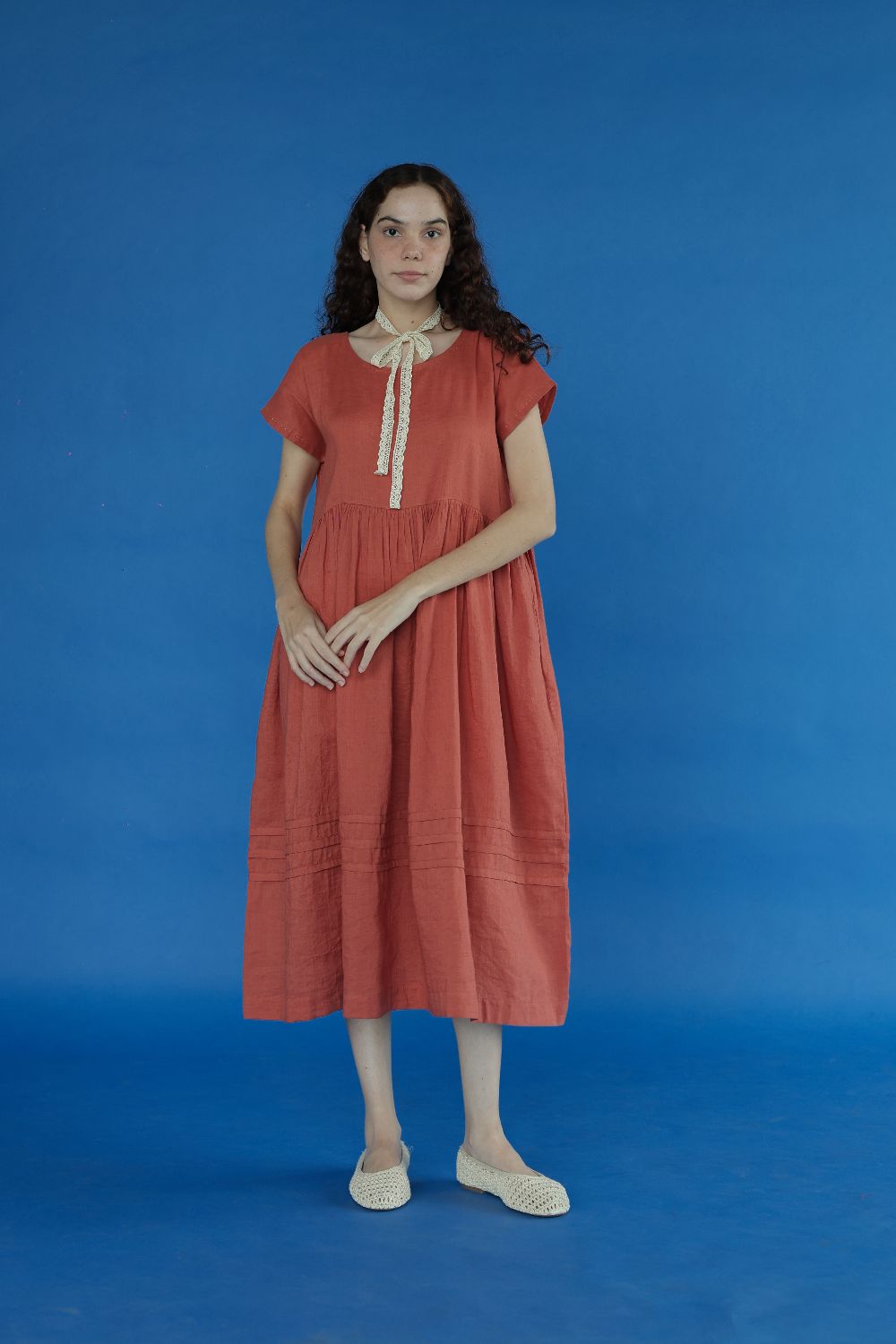 Perfect summer dress in our new fresh deep coral color. A round neck dress with gatheres running down the wasit and half cut sleeves.