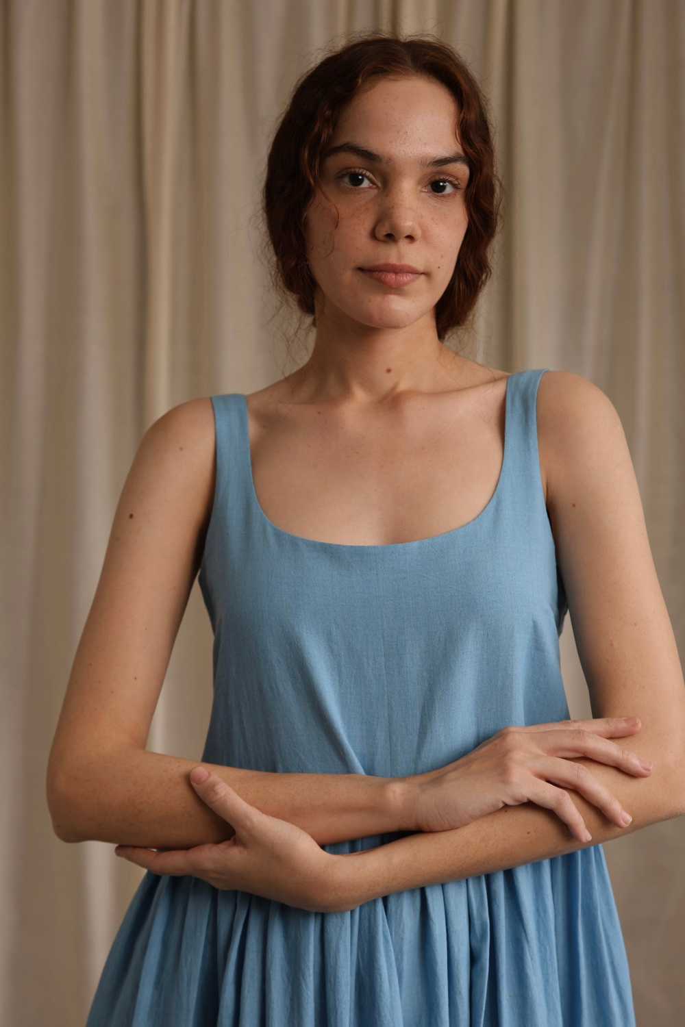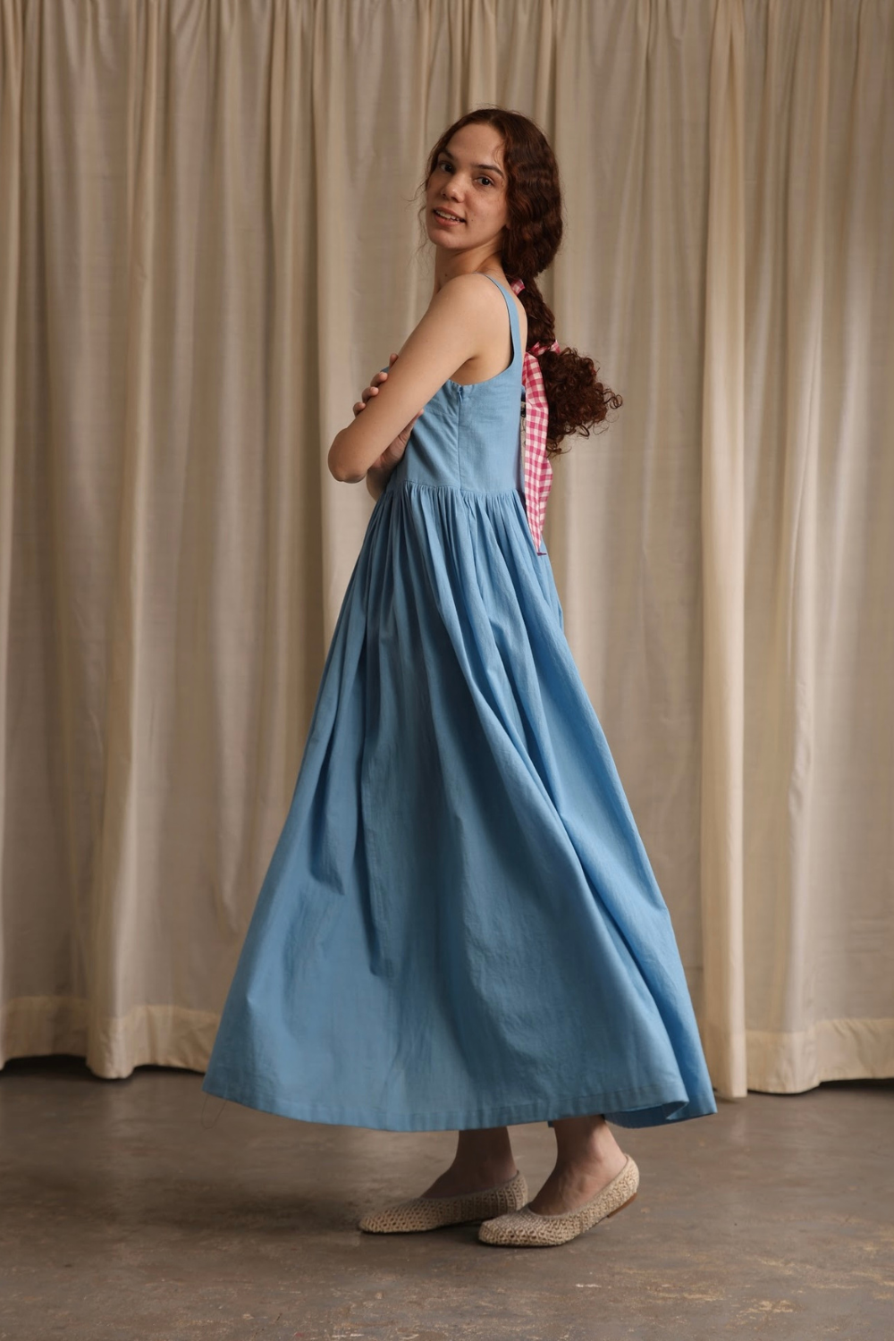 A change from the classic Mason & Mill dresses, 'Mia' is a sleeveless cotton midi that comes with a slightly fitted bodice elasticated at the back, and gathers that run down the waistline - this time in a subtle yet fresh blue.