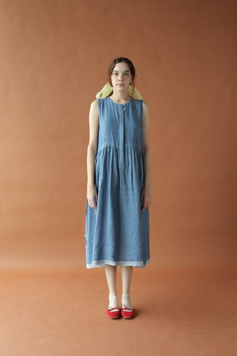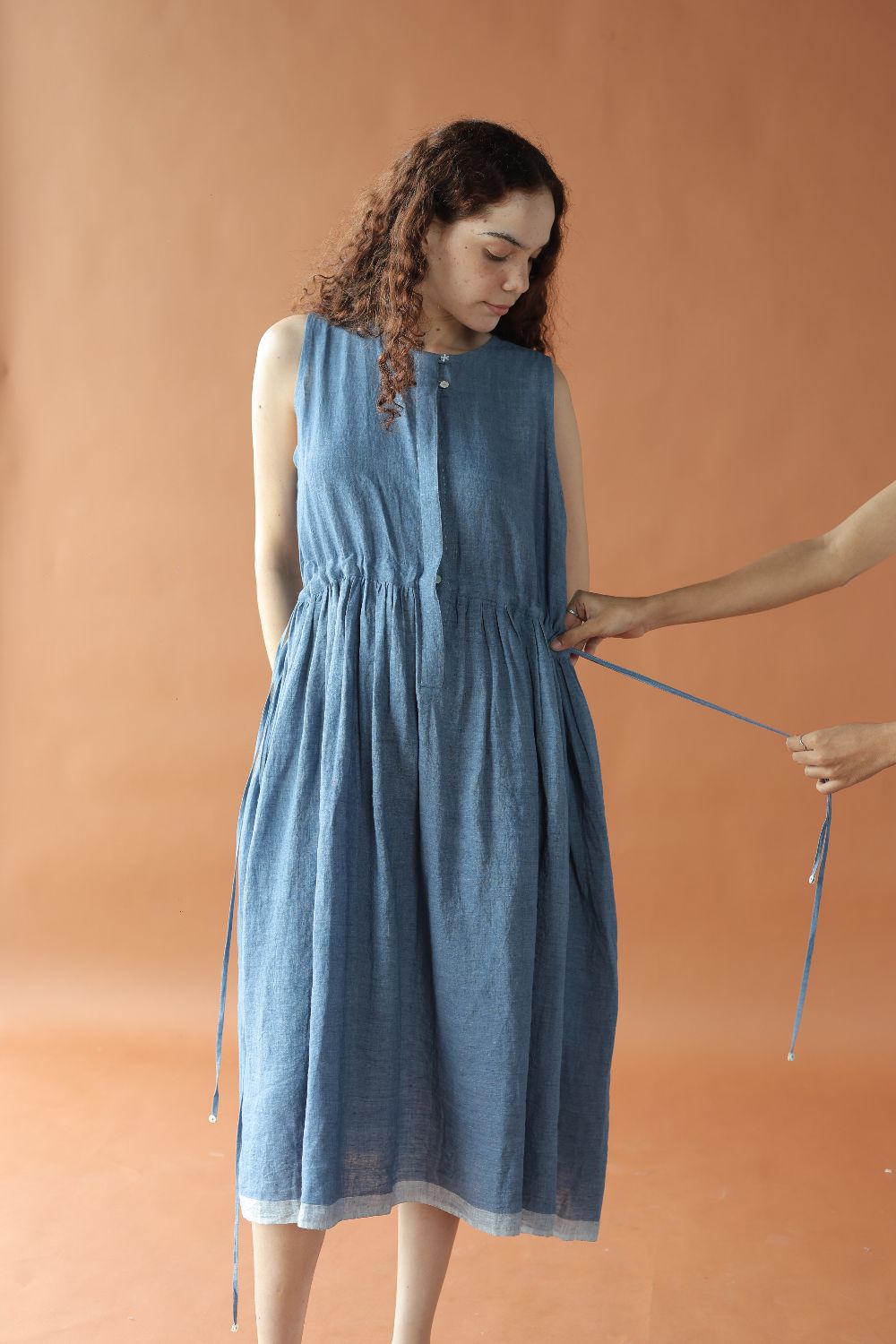 This relaxed sleeveless linen dress has a drawstring waist for a dramatic fit, that can be left undone or cinched. Inseam pockets, contrasting hem details, a concealed placket with two buttons highlighted at the top finish the dress.