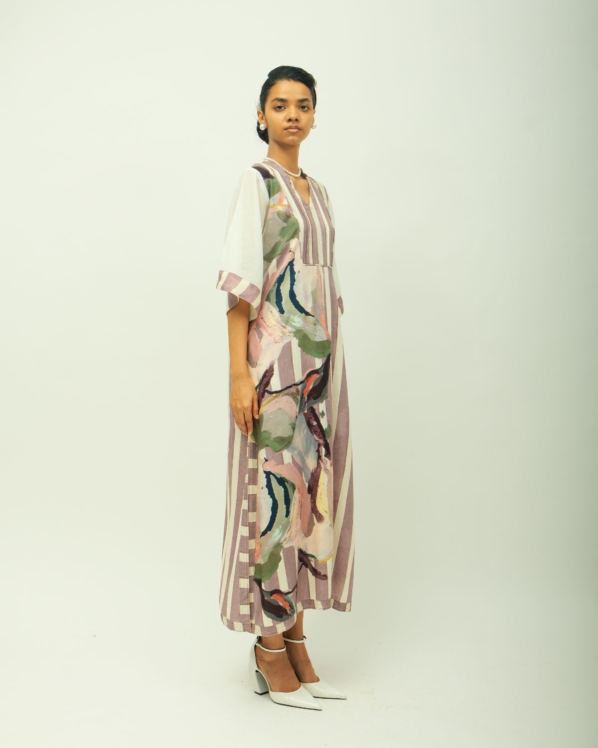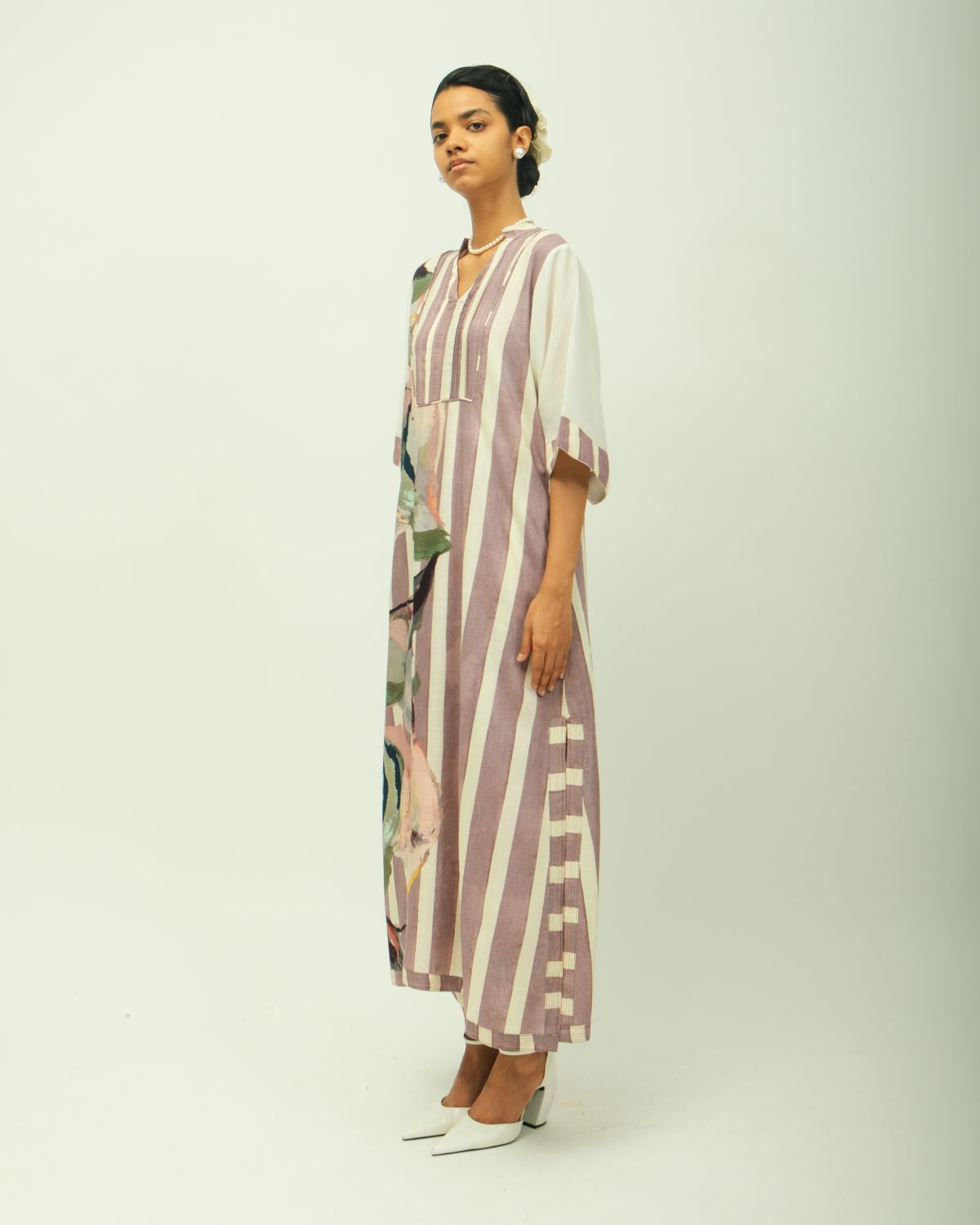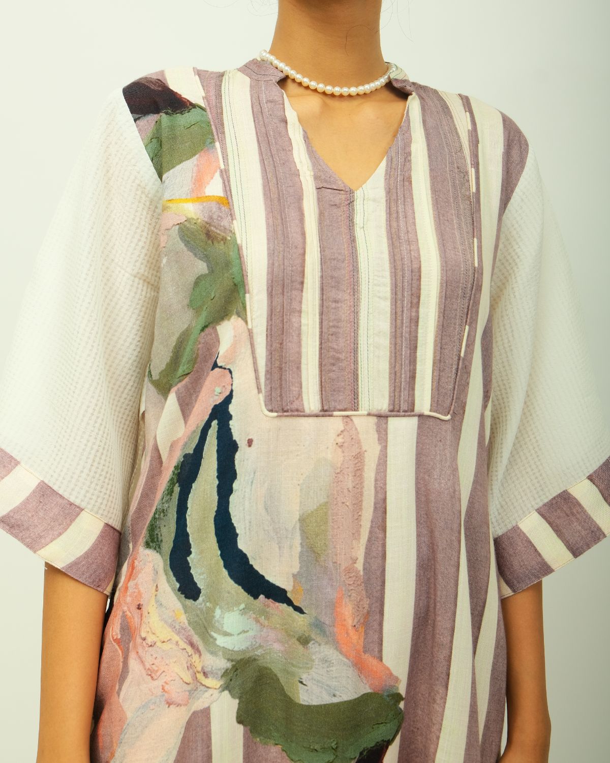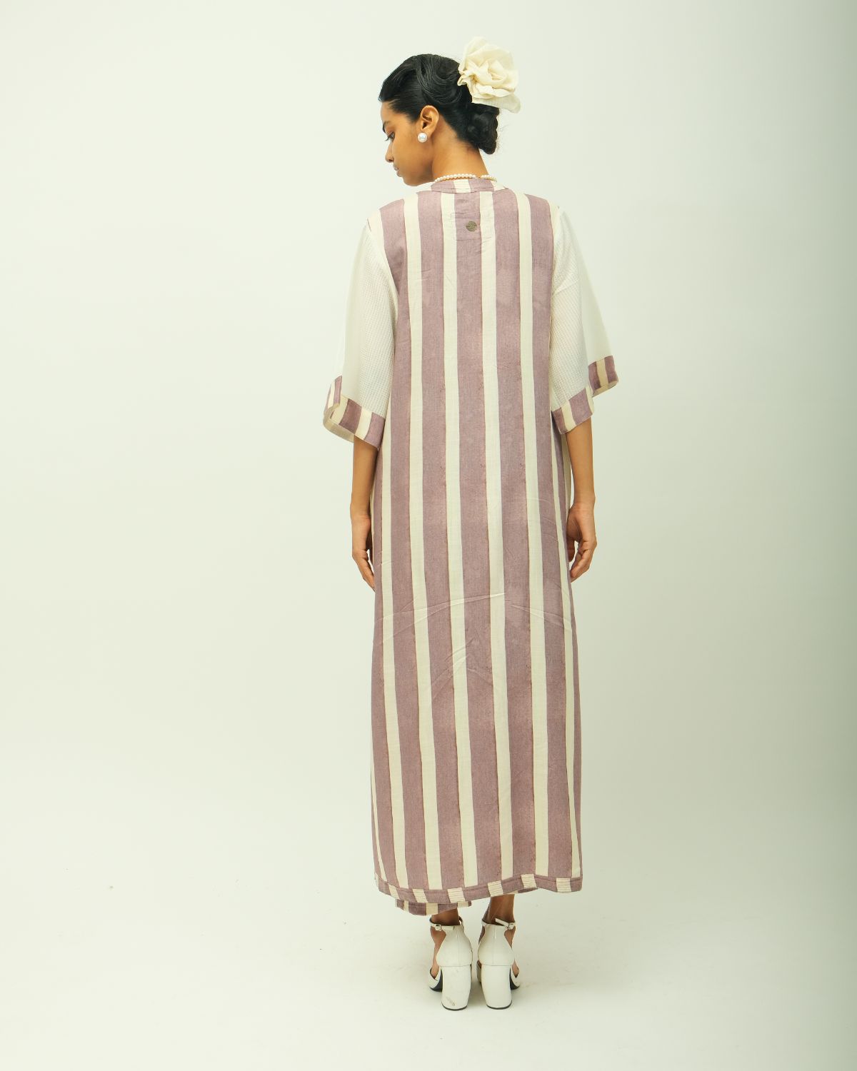 Anti fit, shirt collar, square yoke, top stitch detailing, volumunous full sleeves, gathers on sleeves and bust line, side slit, relaxed fit.Variations in color, texture, and weave are inherent due to the hand-made nature of the garment- Single piece. Garment Length - 48"