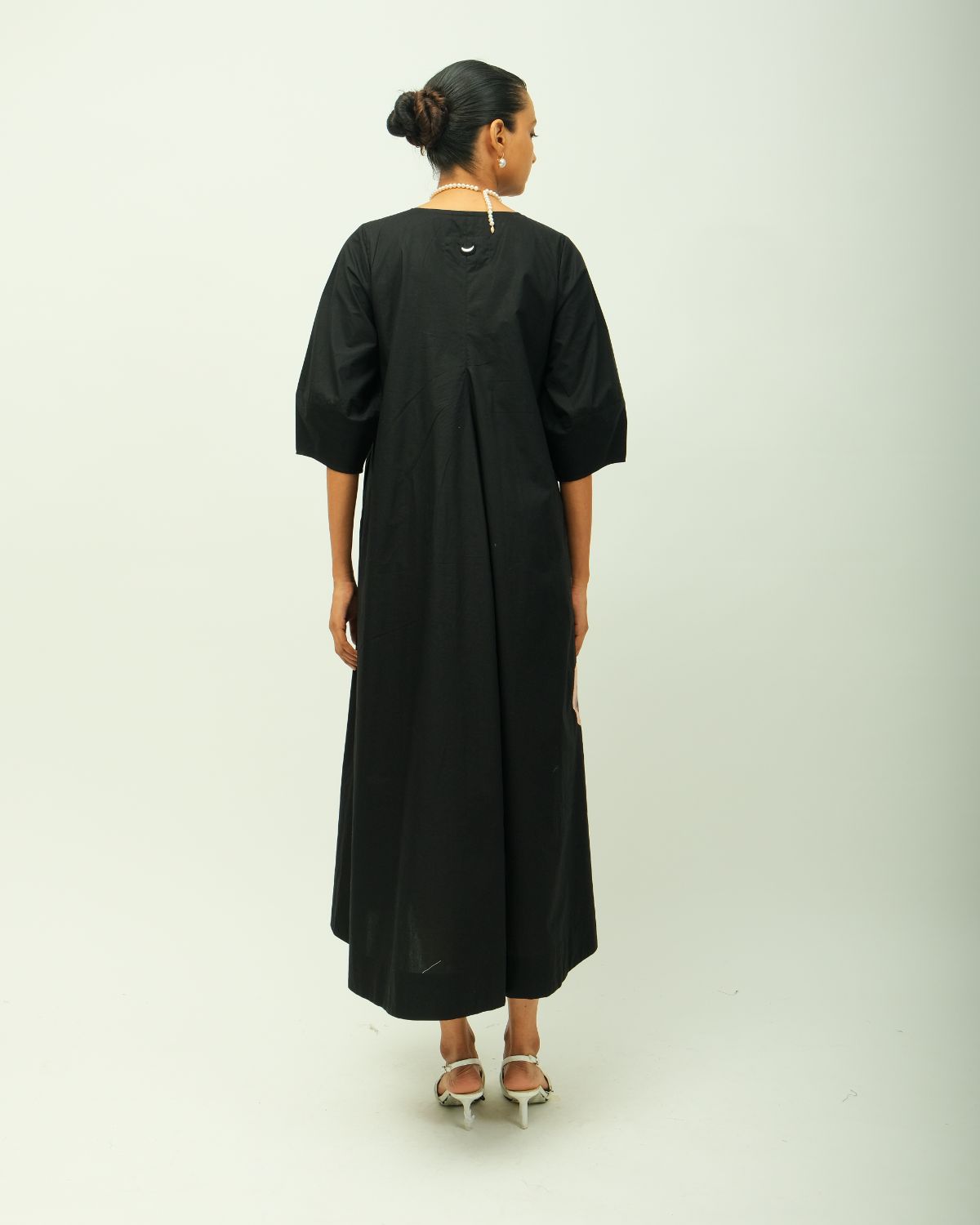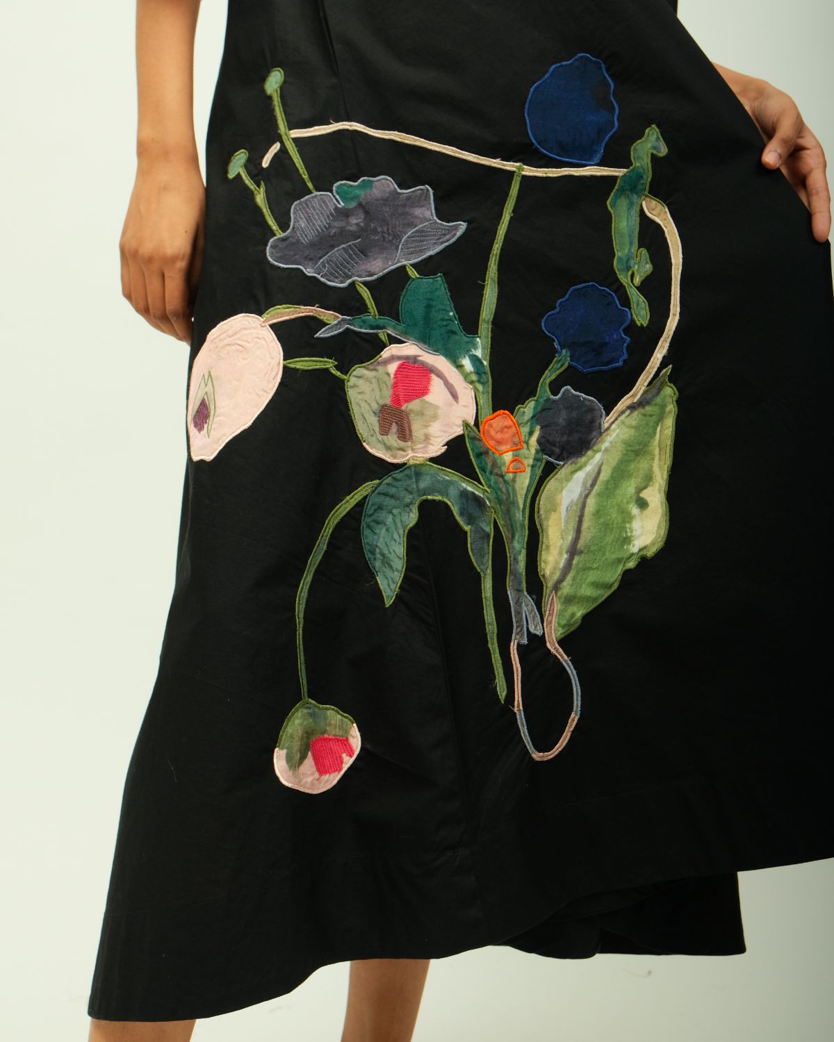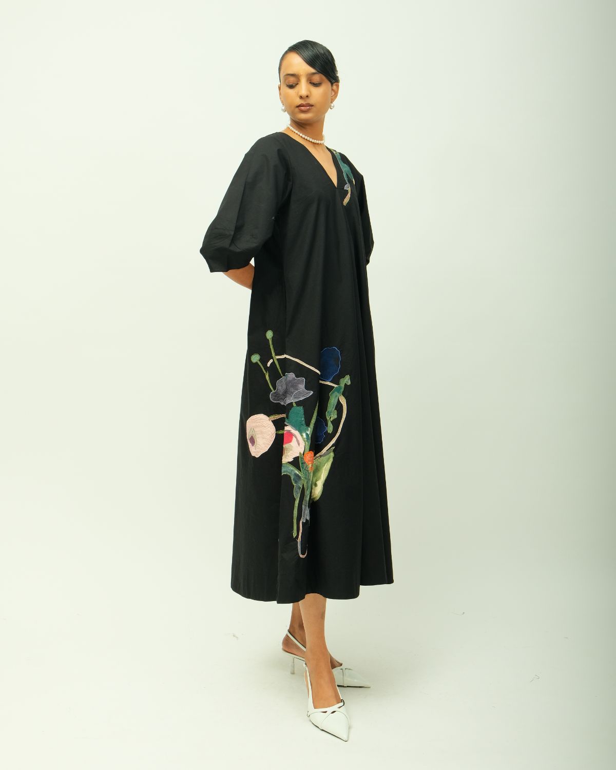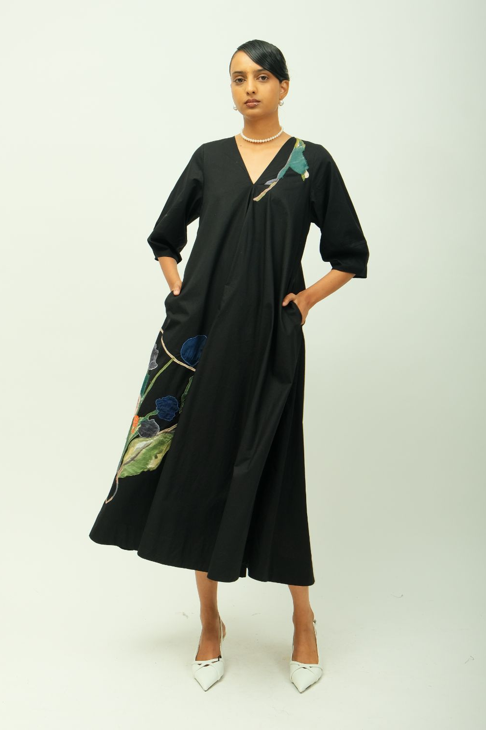 Feminine Silhouette: An A-line dress featuring lantern sleeves, a flattering V-neck, and practical side pockets. Adorned with a single-thread embroidered floral applique on the right side and shoulder. Print placements vary by piece.