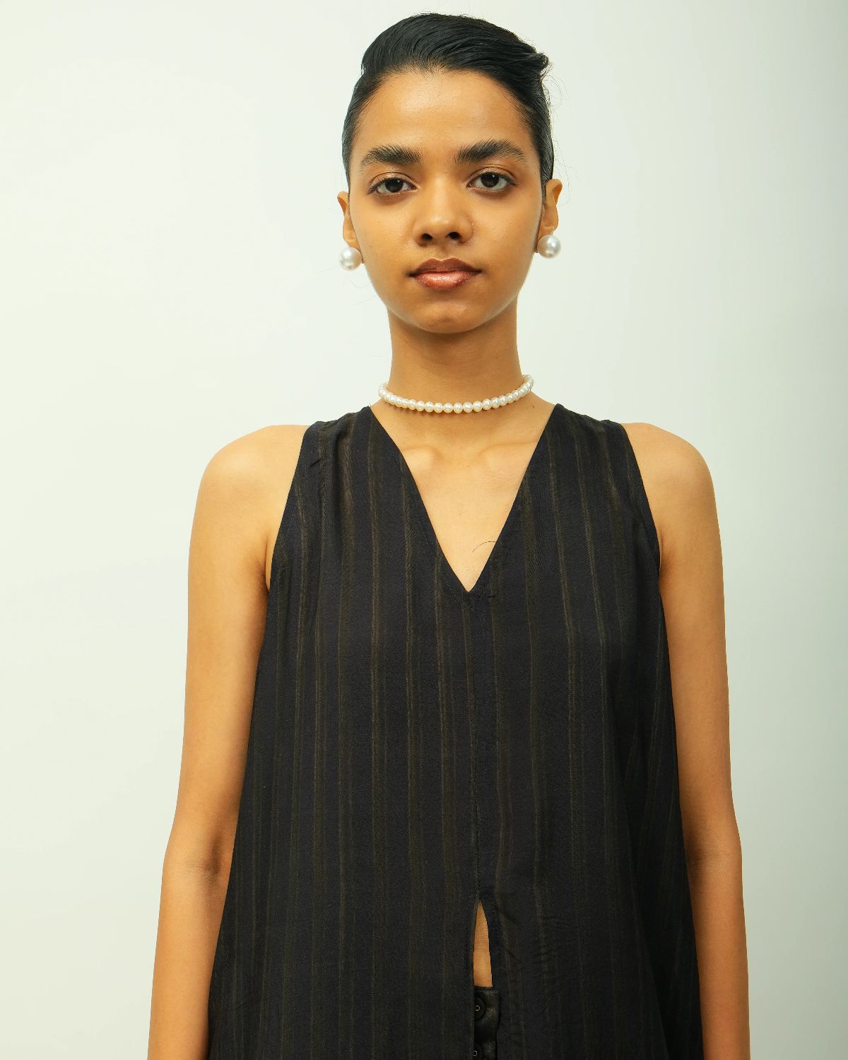 Anti-fit V-neckline, flared overlay tunic, with subtle pinstripes horizontal seam detail, the outfit is made from lightweight textiles. Minimal elegance with artistic flair