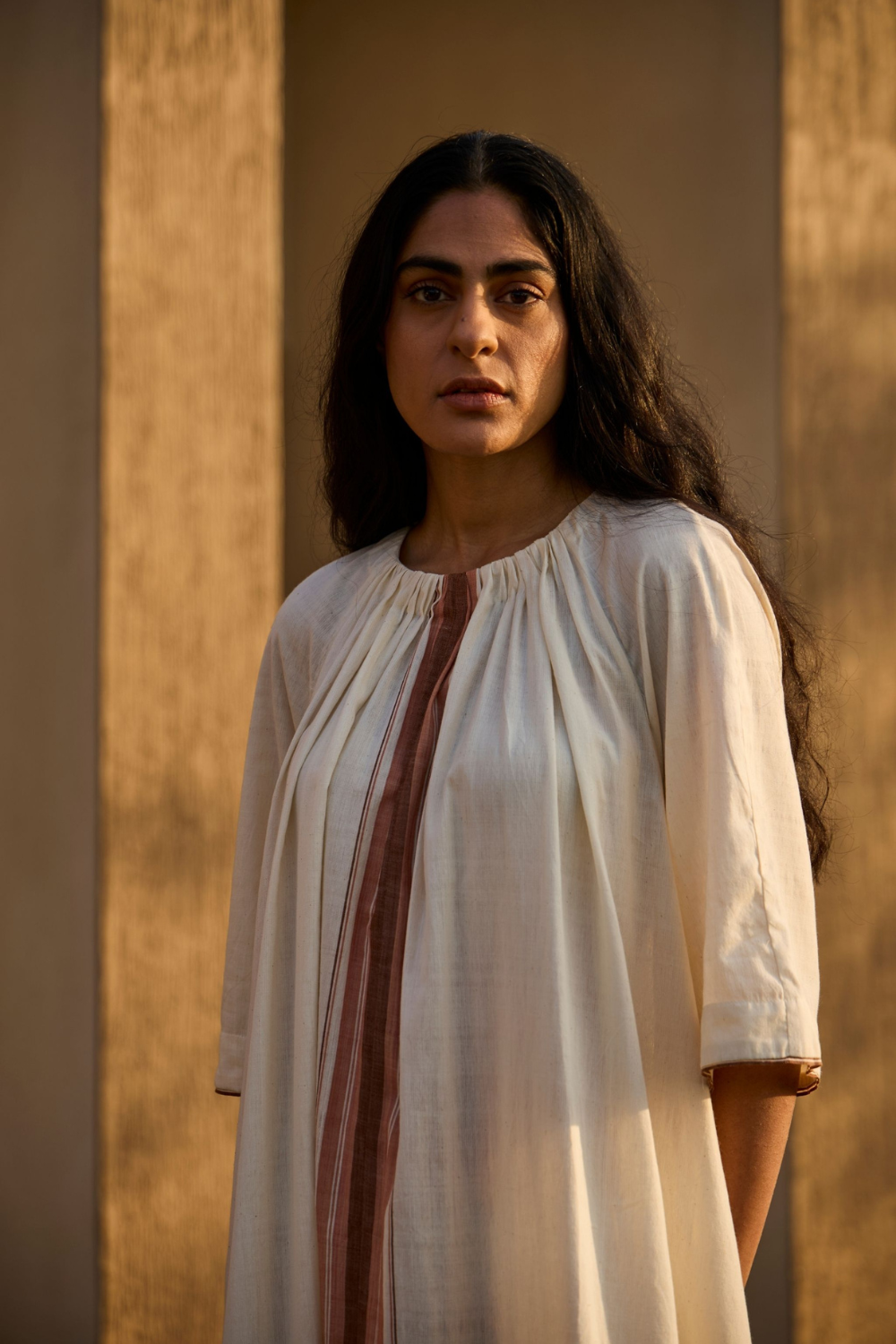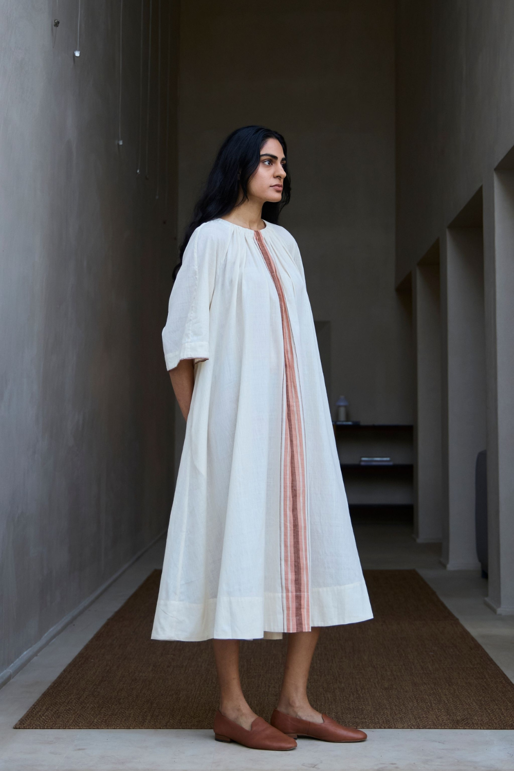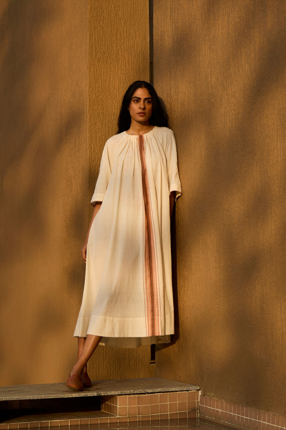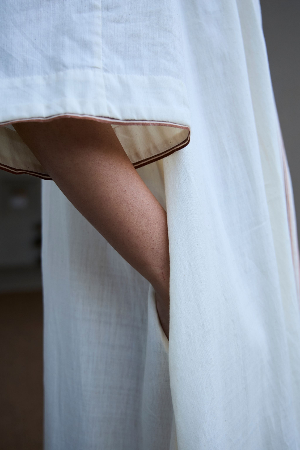 Collarless midi dress. Statement gathered neckline. Elbow length raglan sleeve. Single rouleau button fastening at the back. Inseam pockets. Wear it as is or pair with your favourite belt. This dress is shipped with a slip.