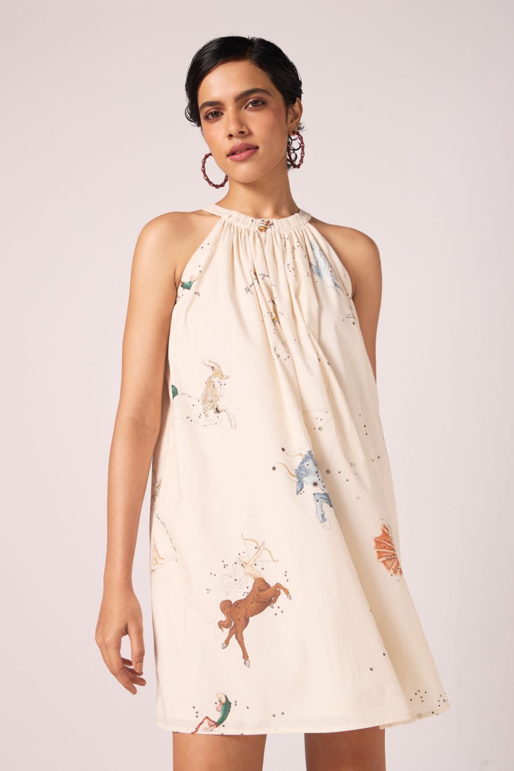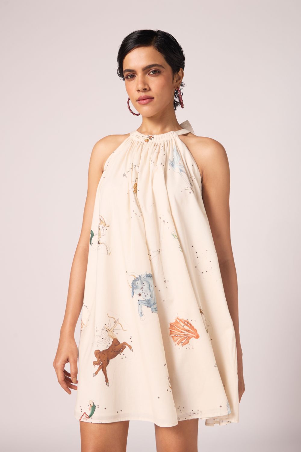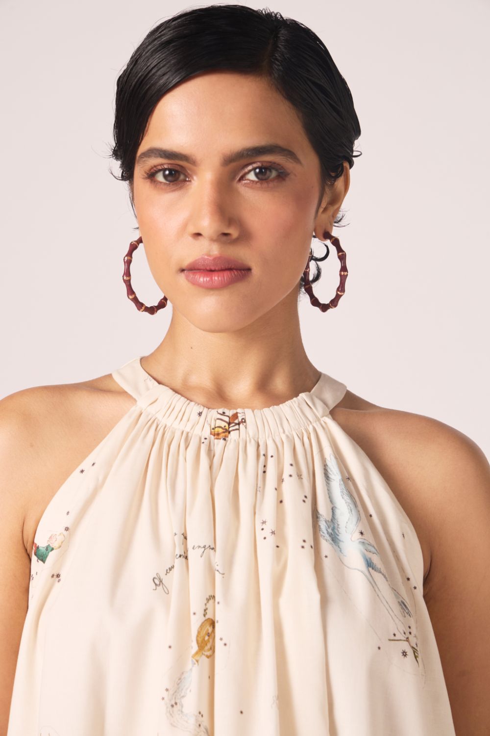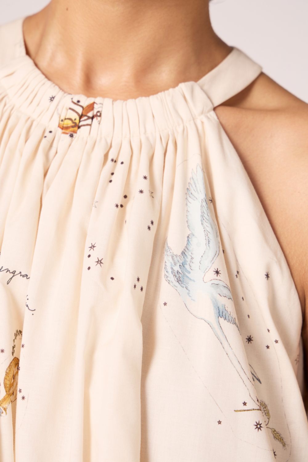 - Gathered neckline; sleeveless; bow-tie back