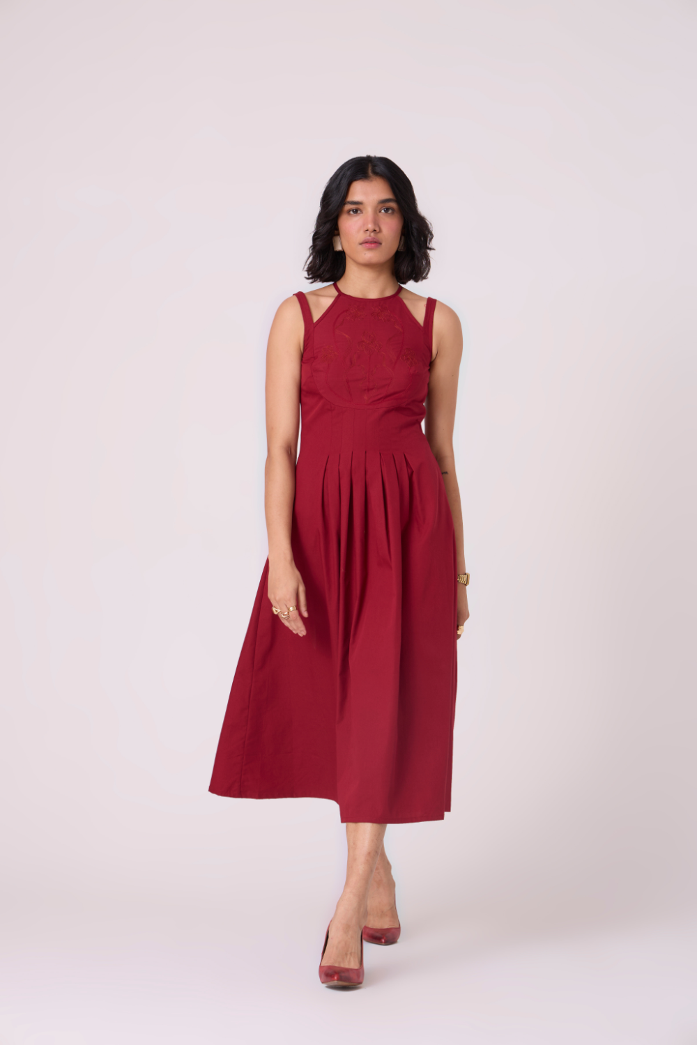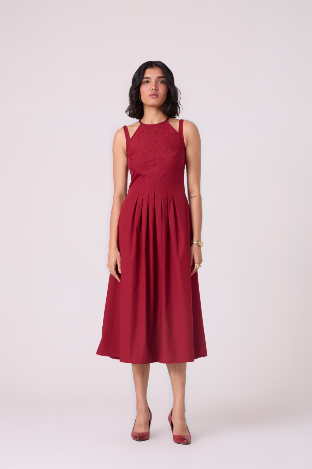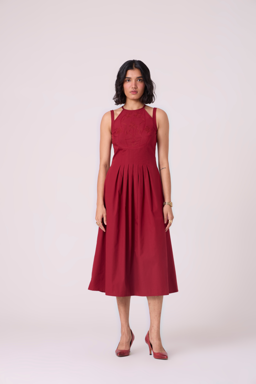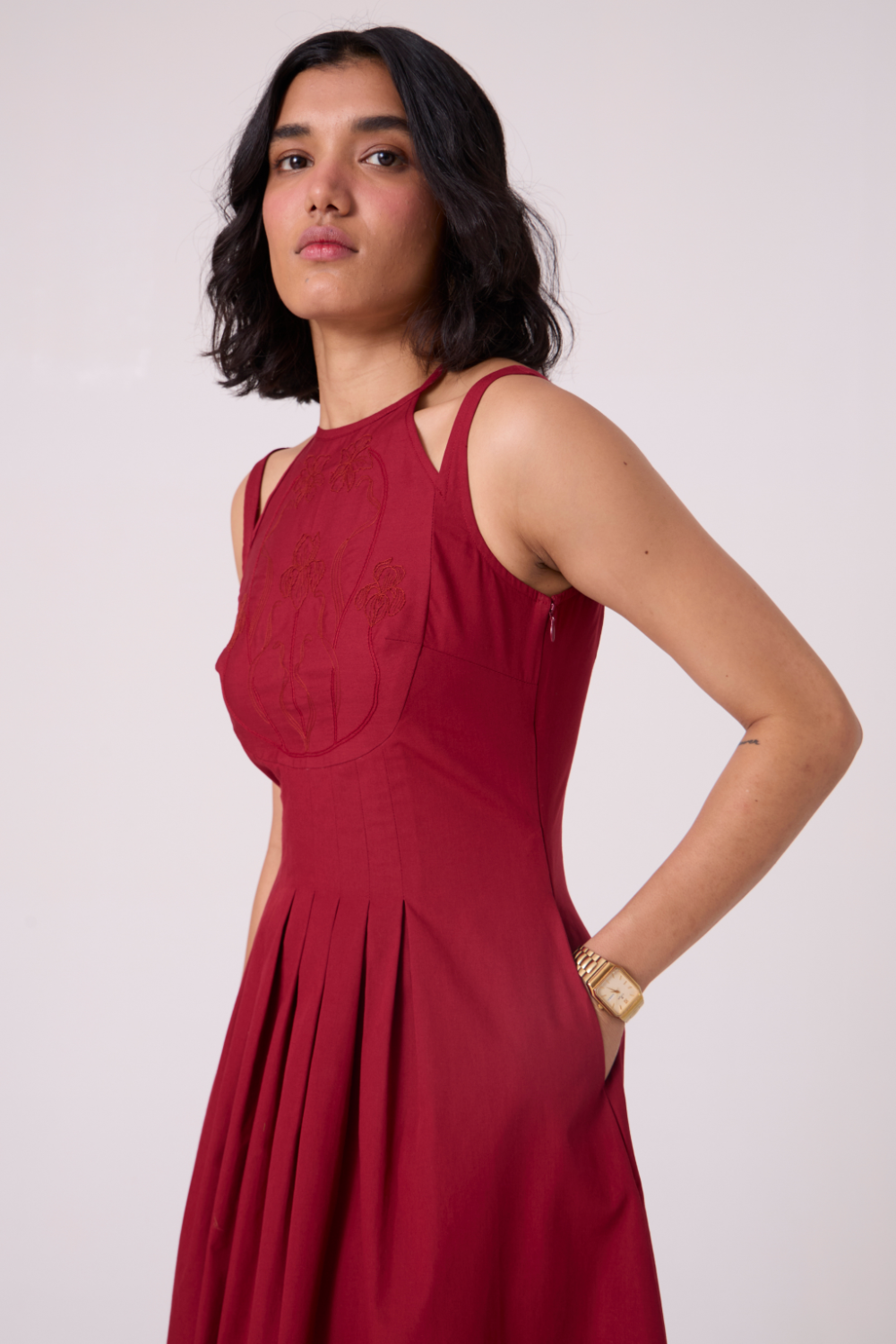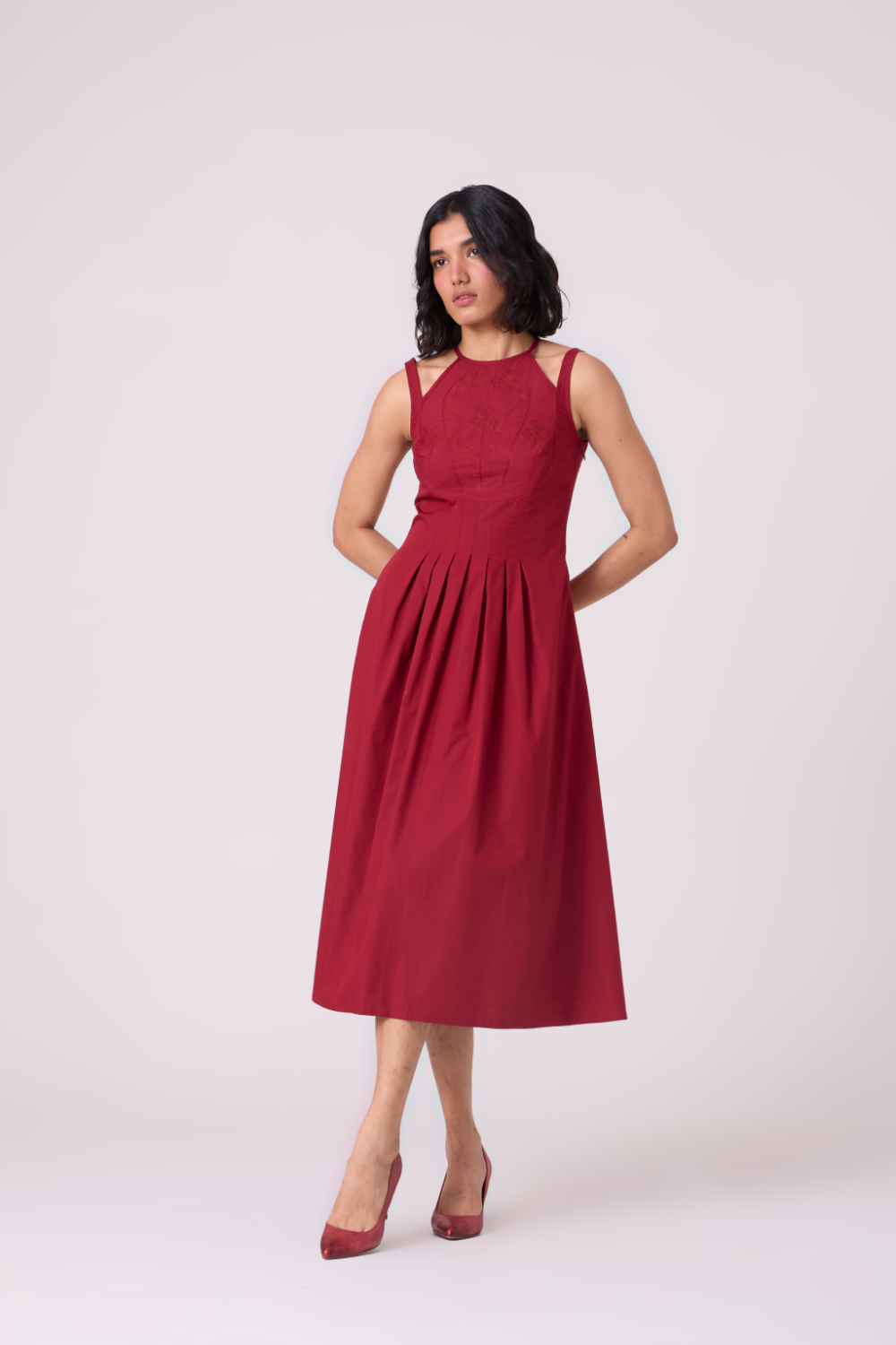 Midi-length dress with an unusual neckline makes a polished look. Curved yoke line features embroidery. Inverted pleats on the waistline and darts on the yoke ensure a flattering fit. In-seam pockets.