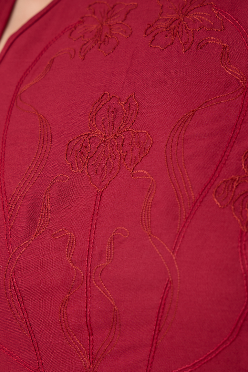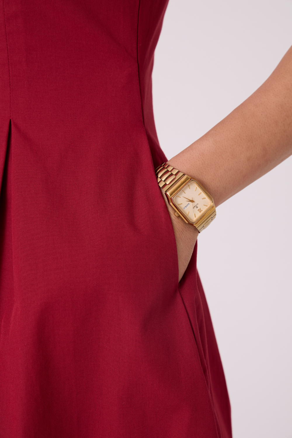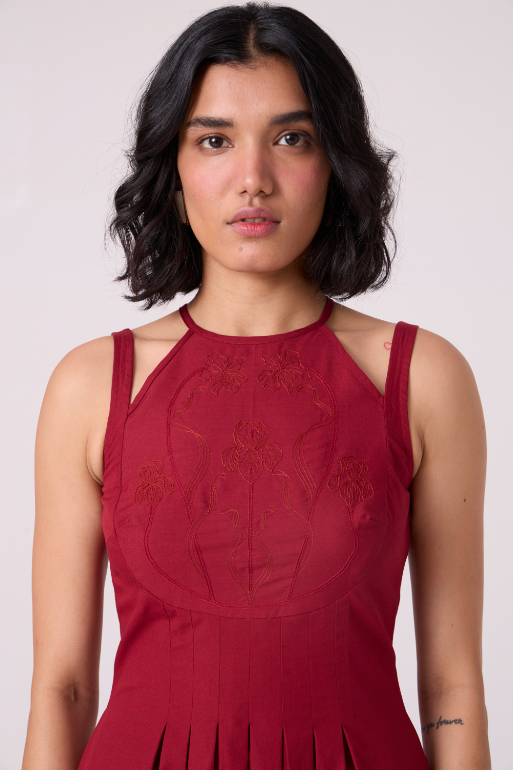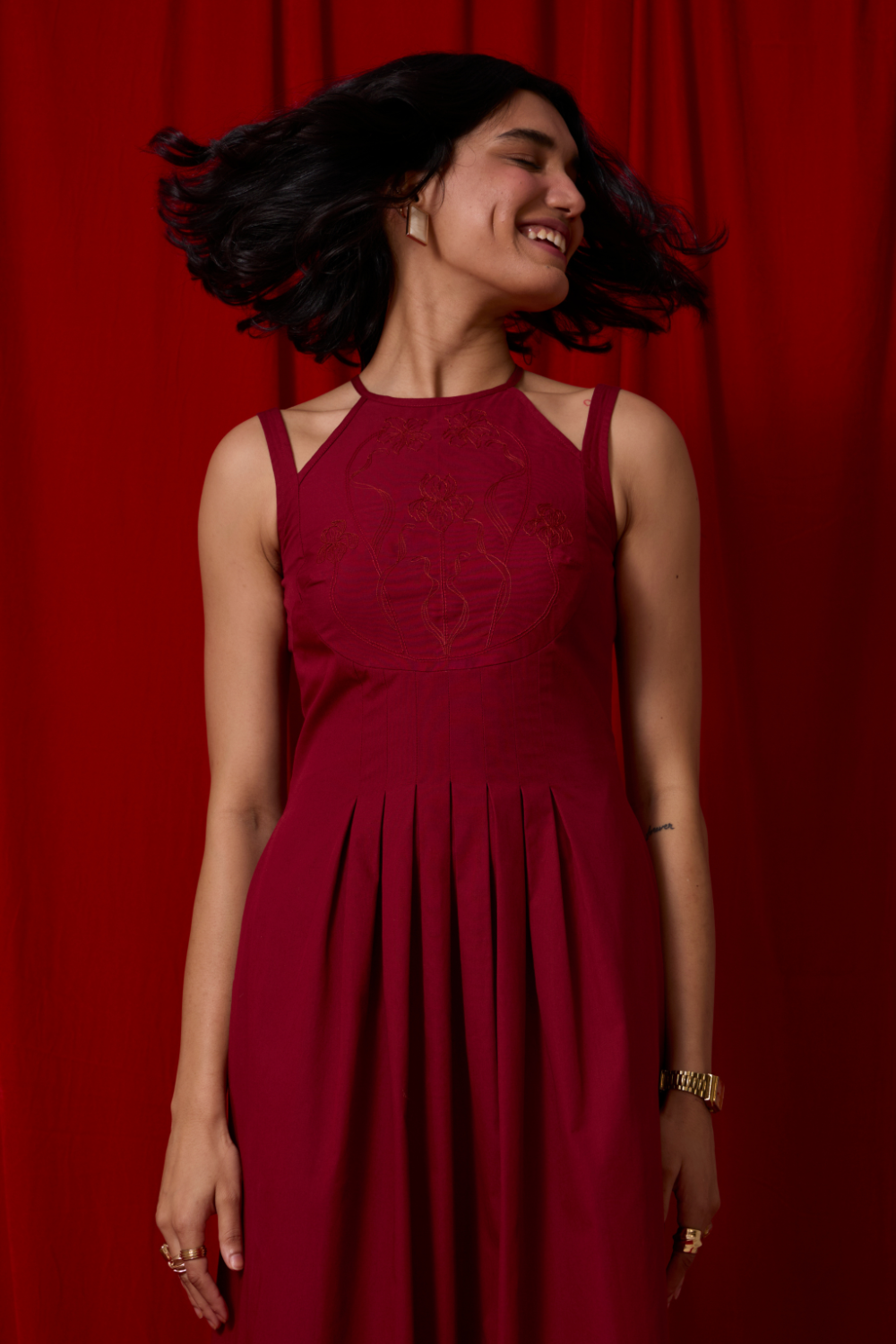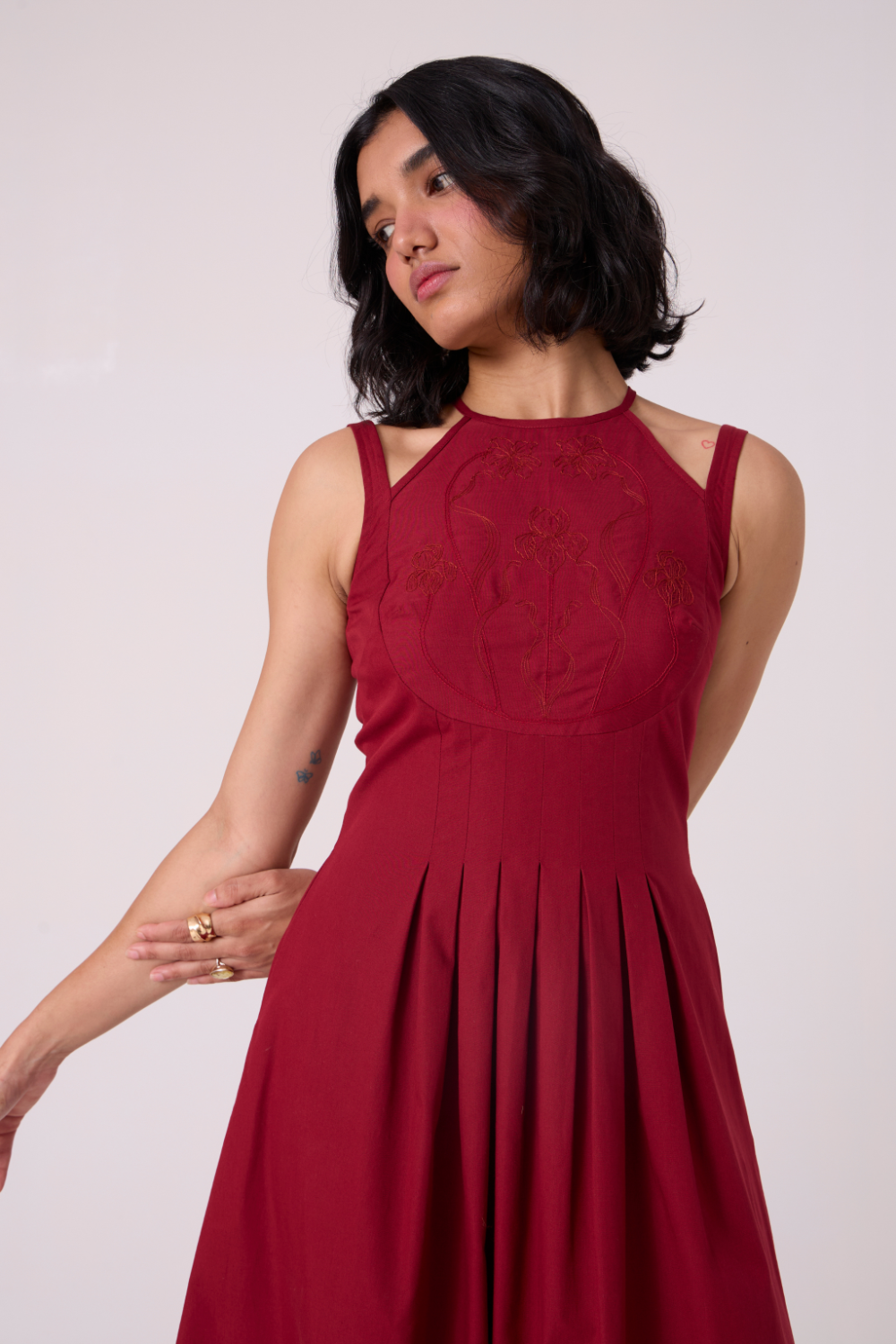Midi-length dress with an unusual neckline makes a polished look. Curved yoke line features embroidery. Inverted pleats on the waistline and darts on the yoke ensure a flattering fit. In-seam pockets.