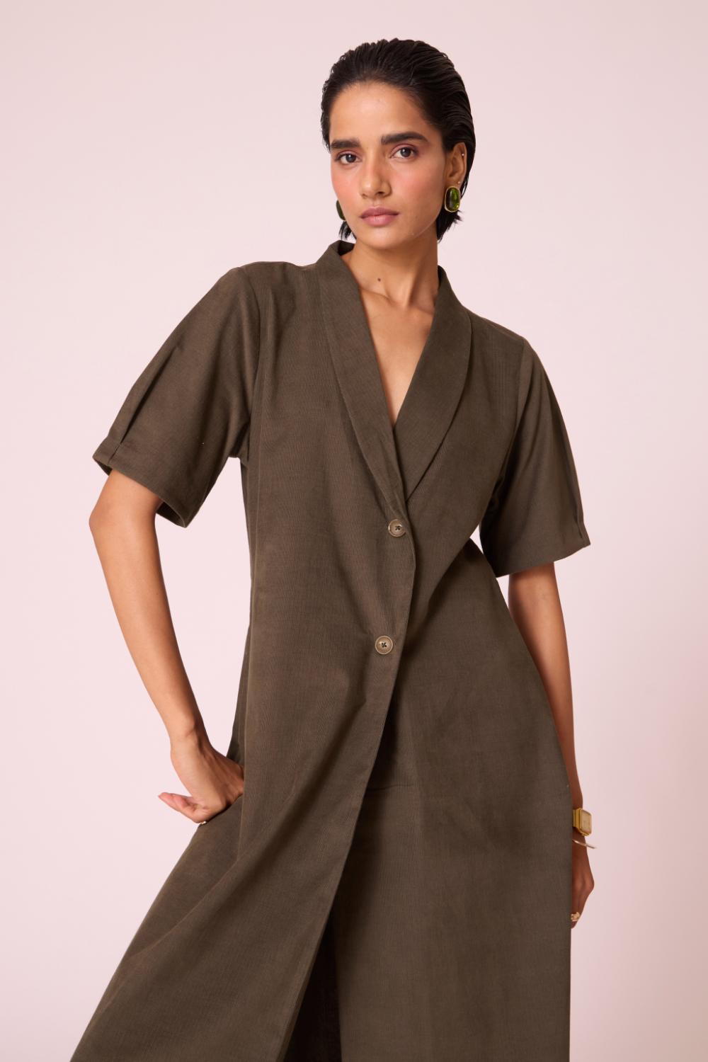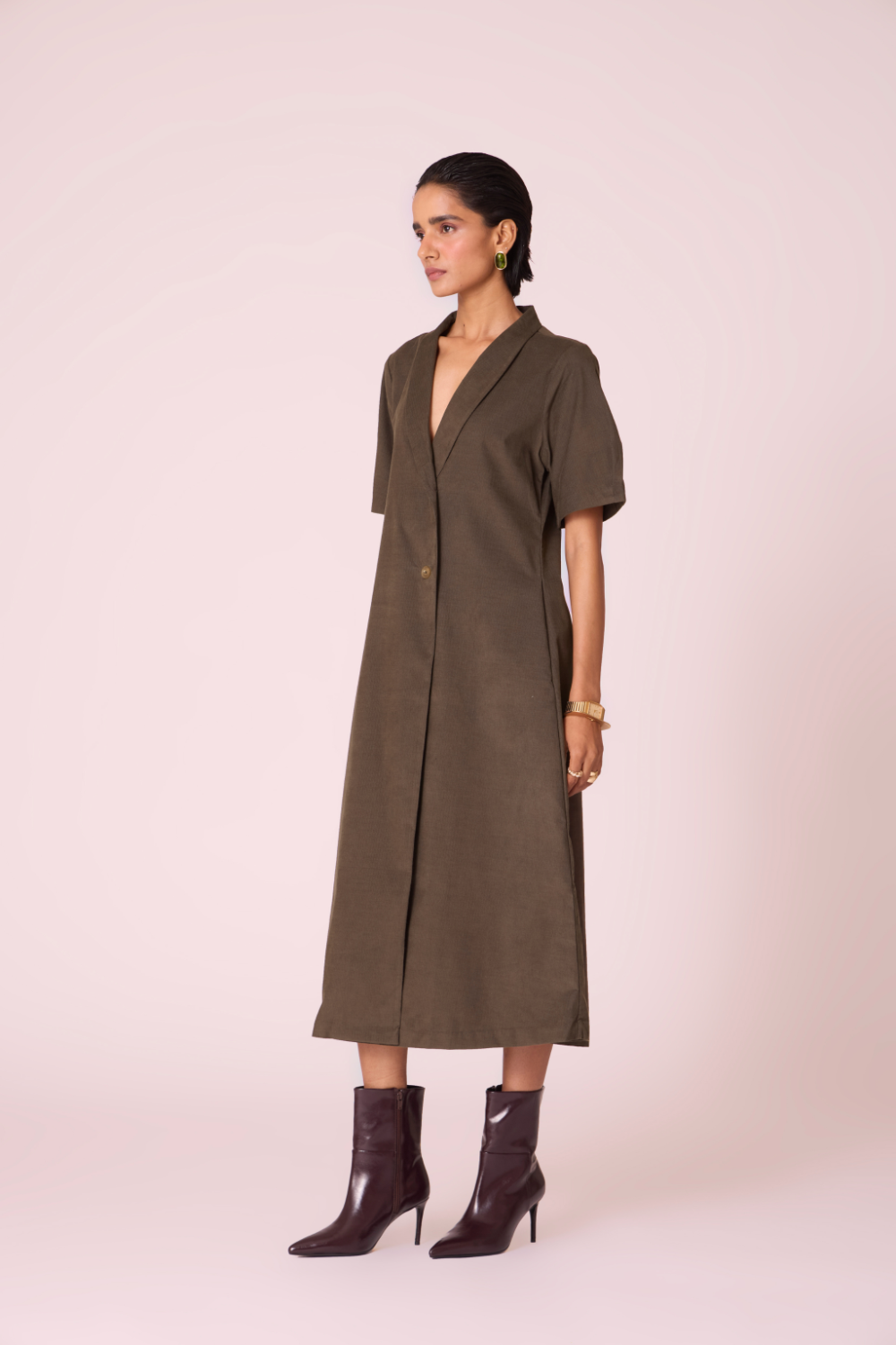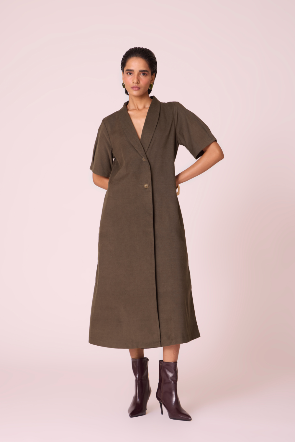 A structured wrap silhouette crafted in supple needlecord, the Kamen dress balances tailored clarity with softly contoured sleeves. Its double-button fastening and shawl collar lend a composed, elevated presence.