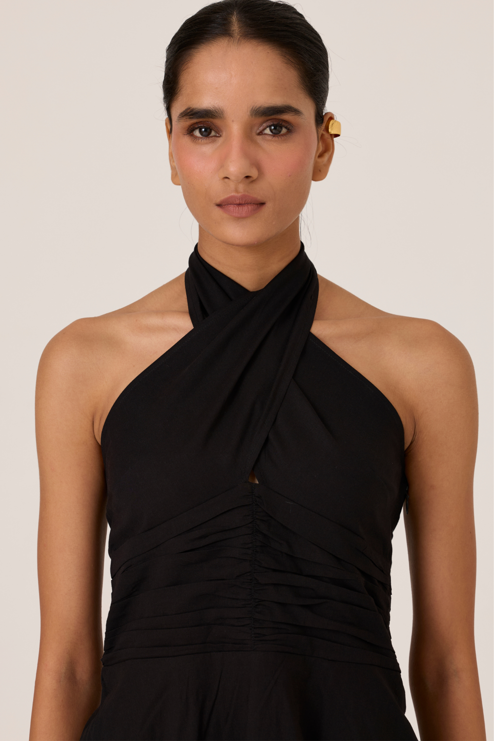 The ultimate black dress for a season of RSVPs. Crossover halter neck. Ruched at the waist for a comfortably cinched shape. Side zip fastening. In-seam pockets. This dress is fully lined.