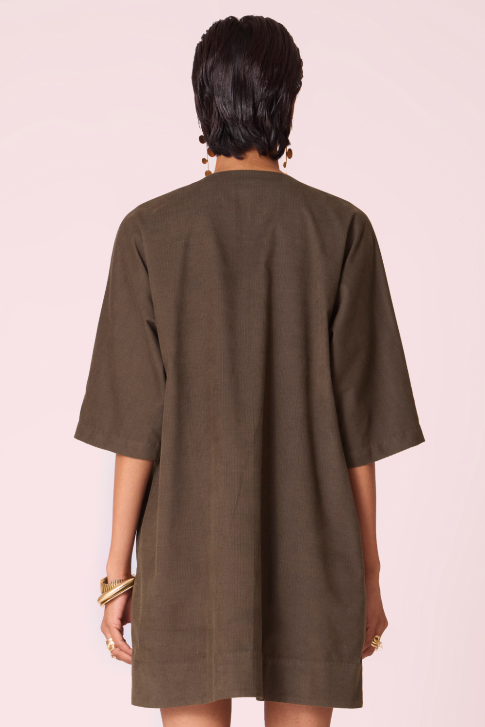 A refined shift silhouette rendered in soft needlecord, the Stad dress holds its form with understated clarity. Its kimono-inspired sleeves and V-neckline bring quiet structure to a piece designed for effortless, everyday wear.