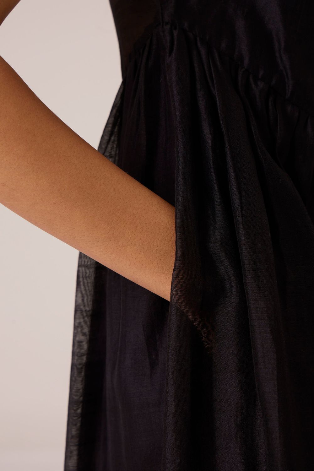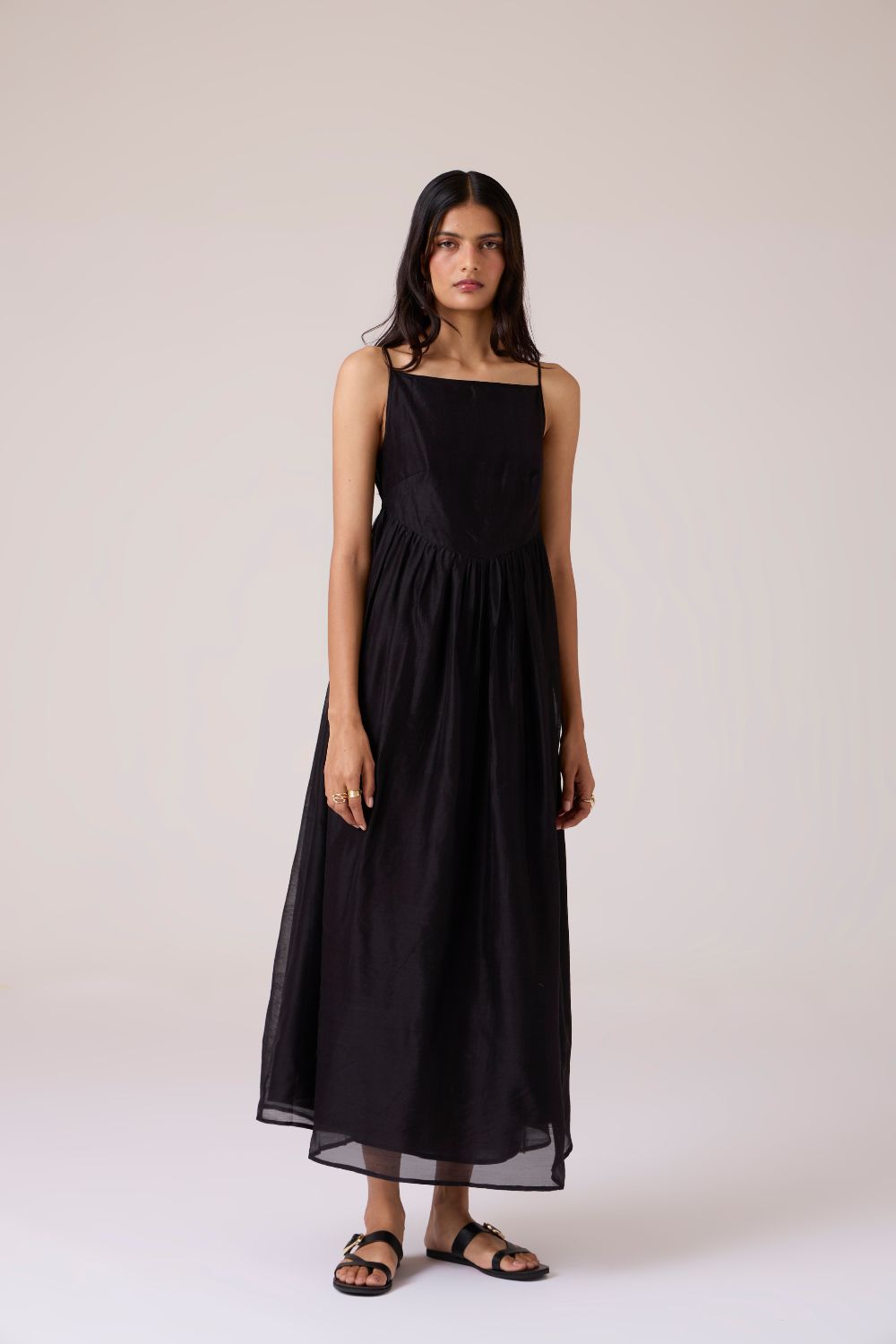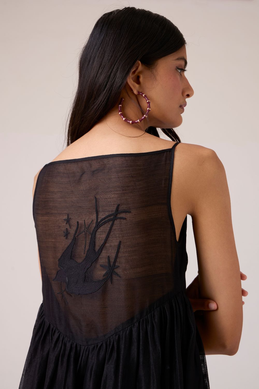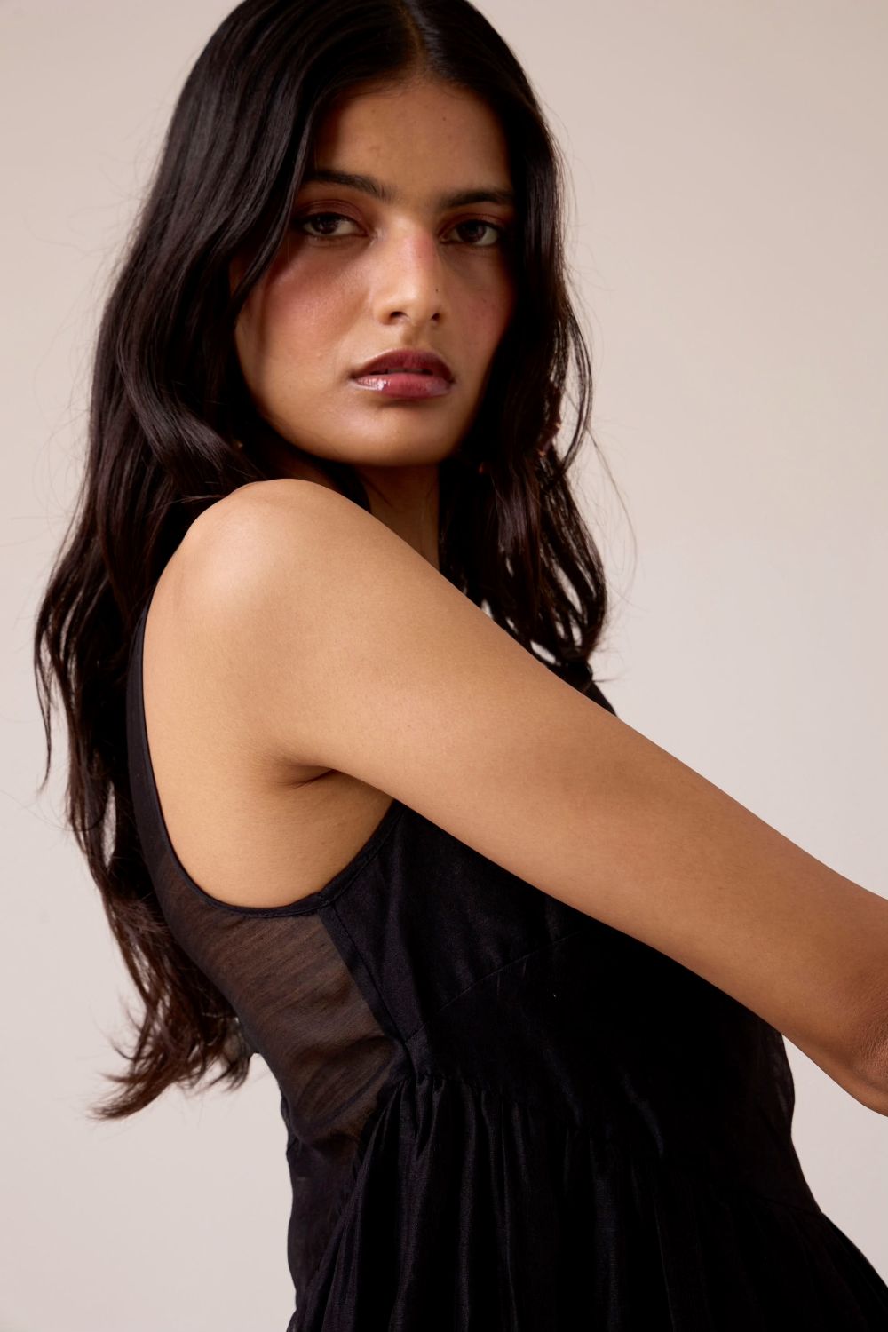 A full bodied silhouette tempered by an embroidered sheer yoke. Fluid in movement, resolute in construction.