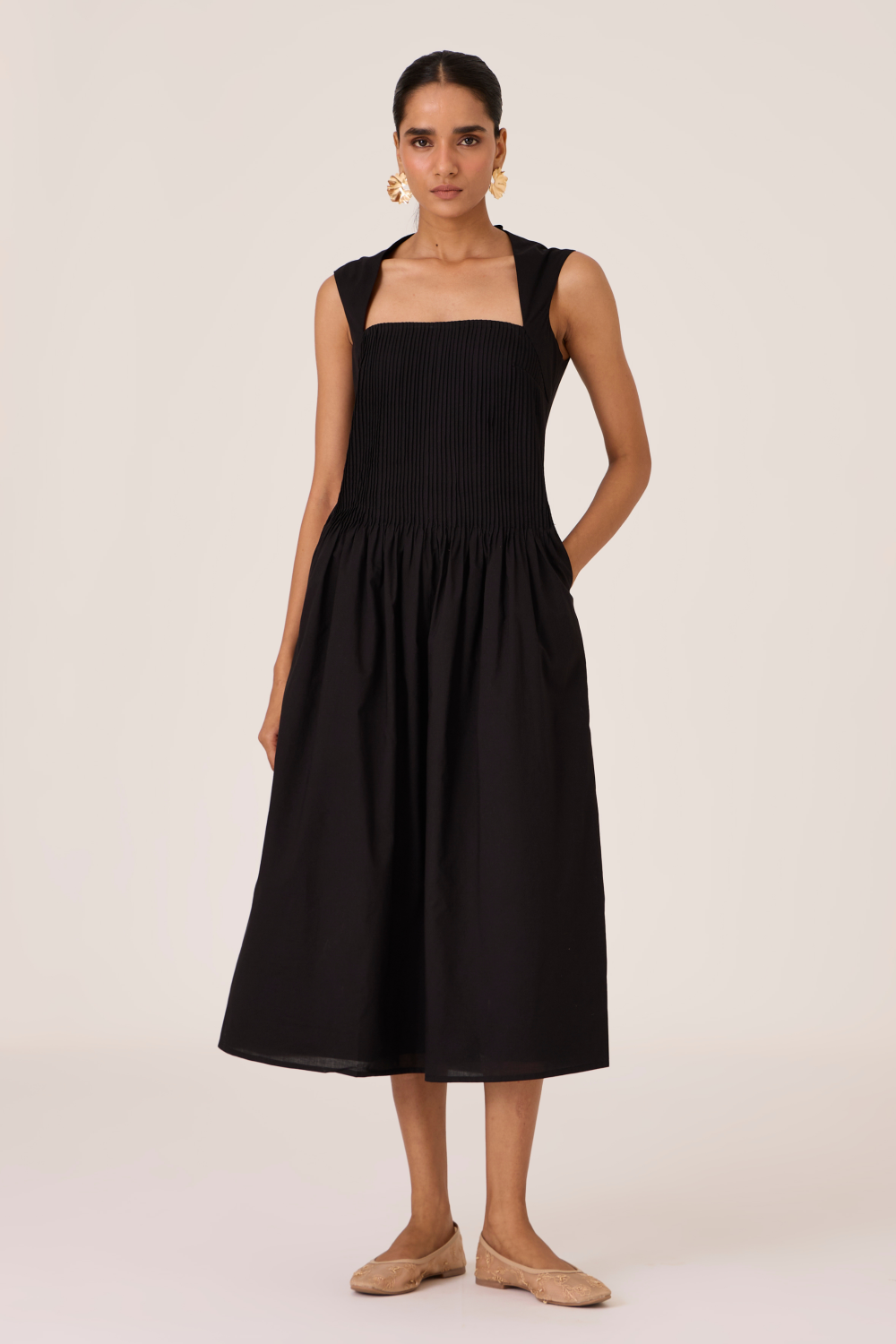 Statement dress designed to be timeless. Collar bone revealing neckline. Pintuck detail on bodice. Back zip fastening. n-seam pockets. This dress is fully lined.