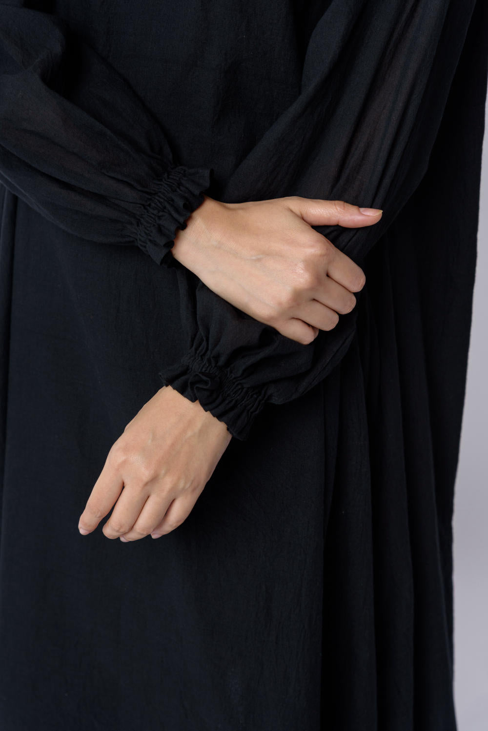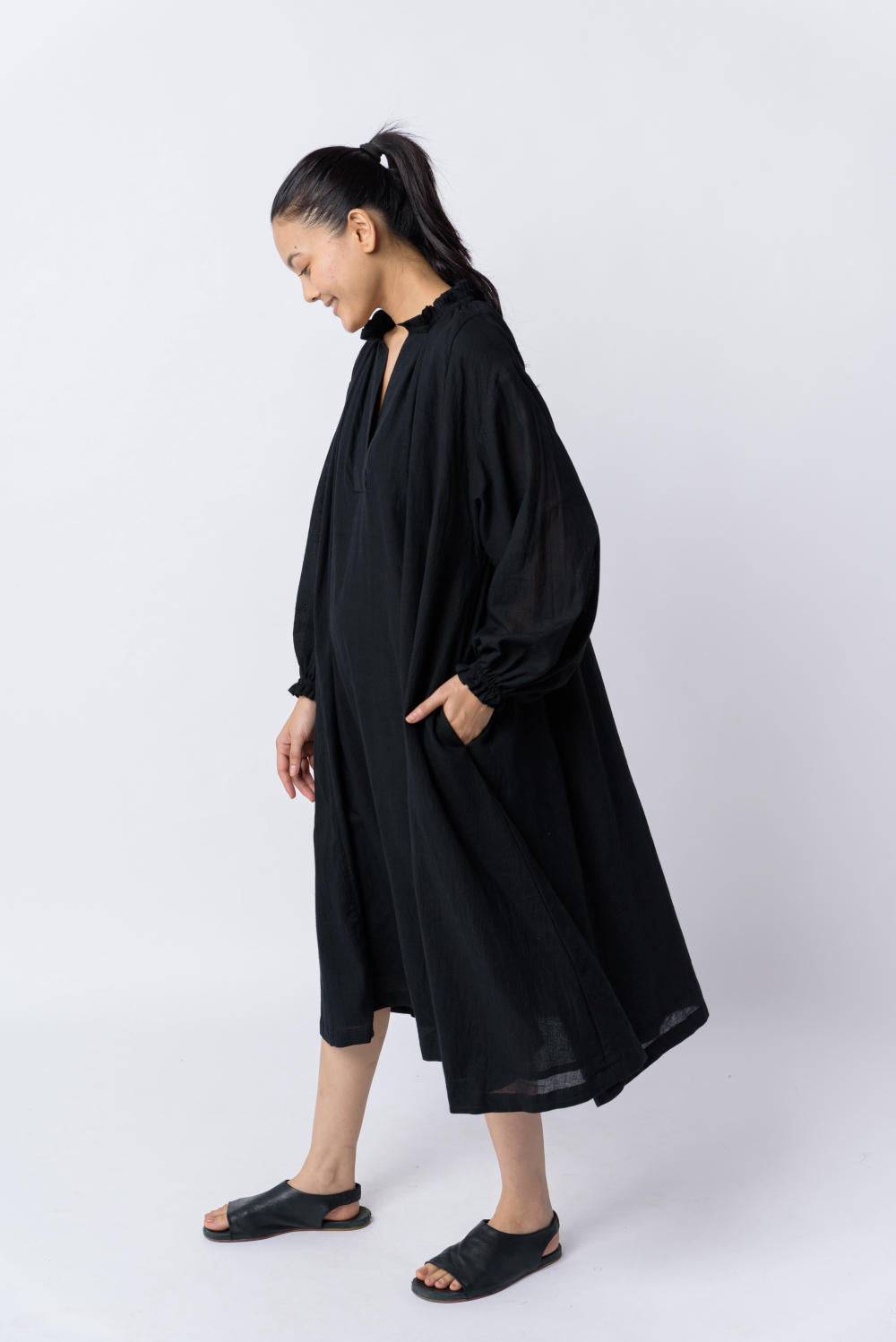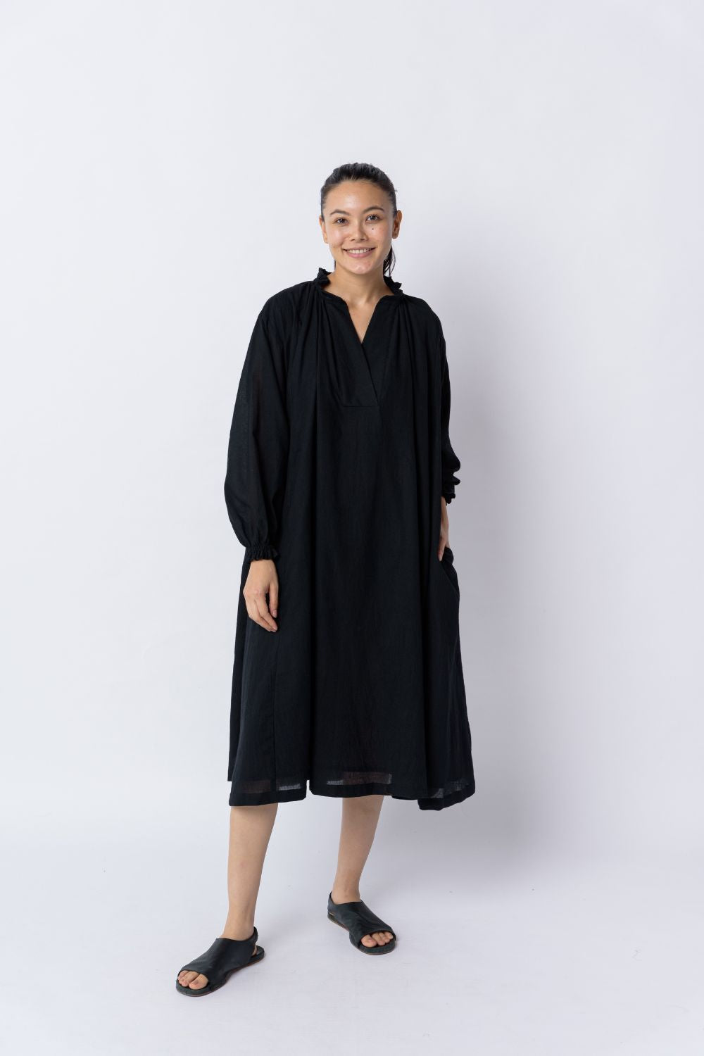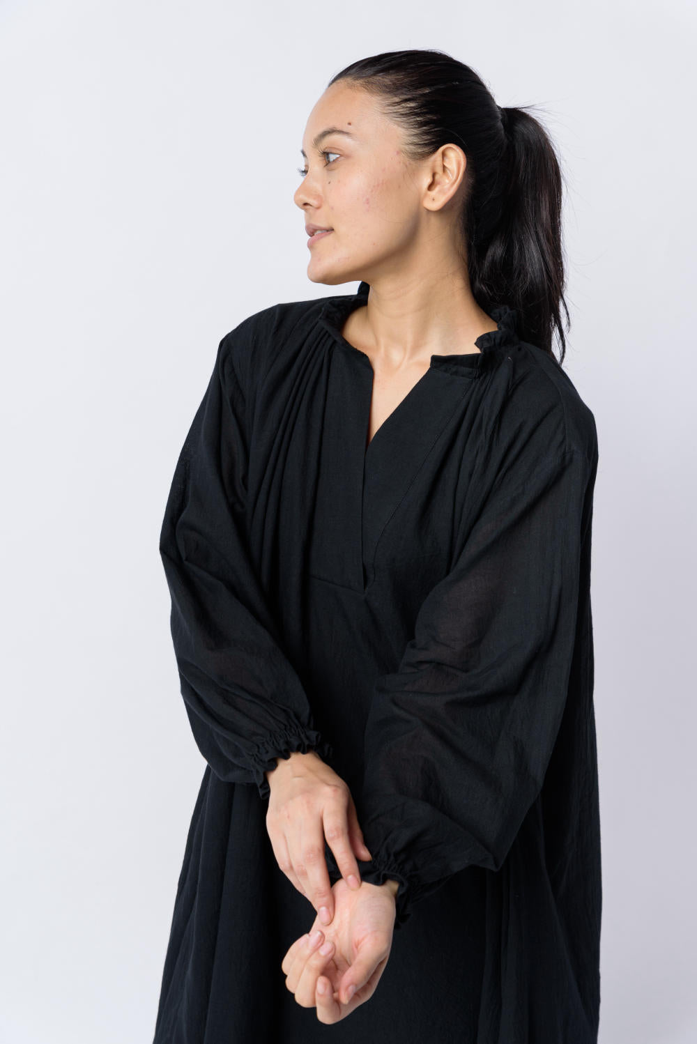 A floaty dress designed for an oversized fit, softly gathered around the neckline for a roomy flare. An all-day comfort staple detailed with minimal ruffles around the neck, trapeze silhouette and long sleeves. The dress is made from handwoven cotton fabric, carefully crafted by local artisans of India.