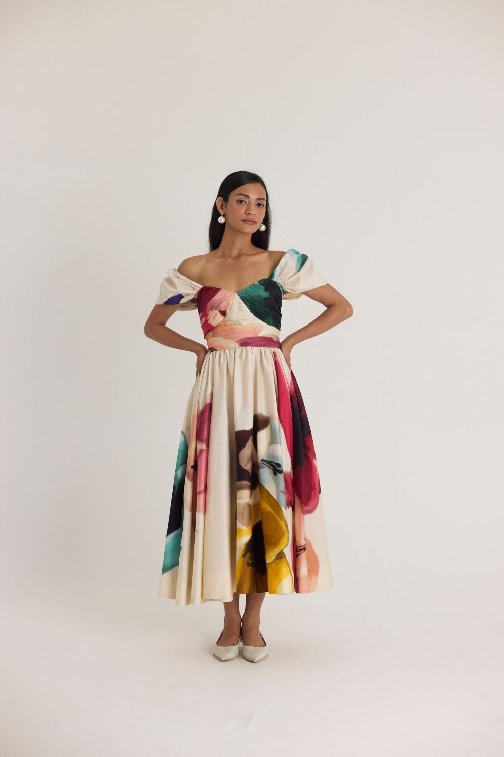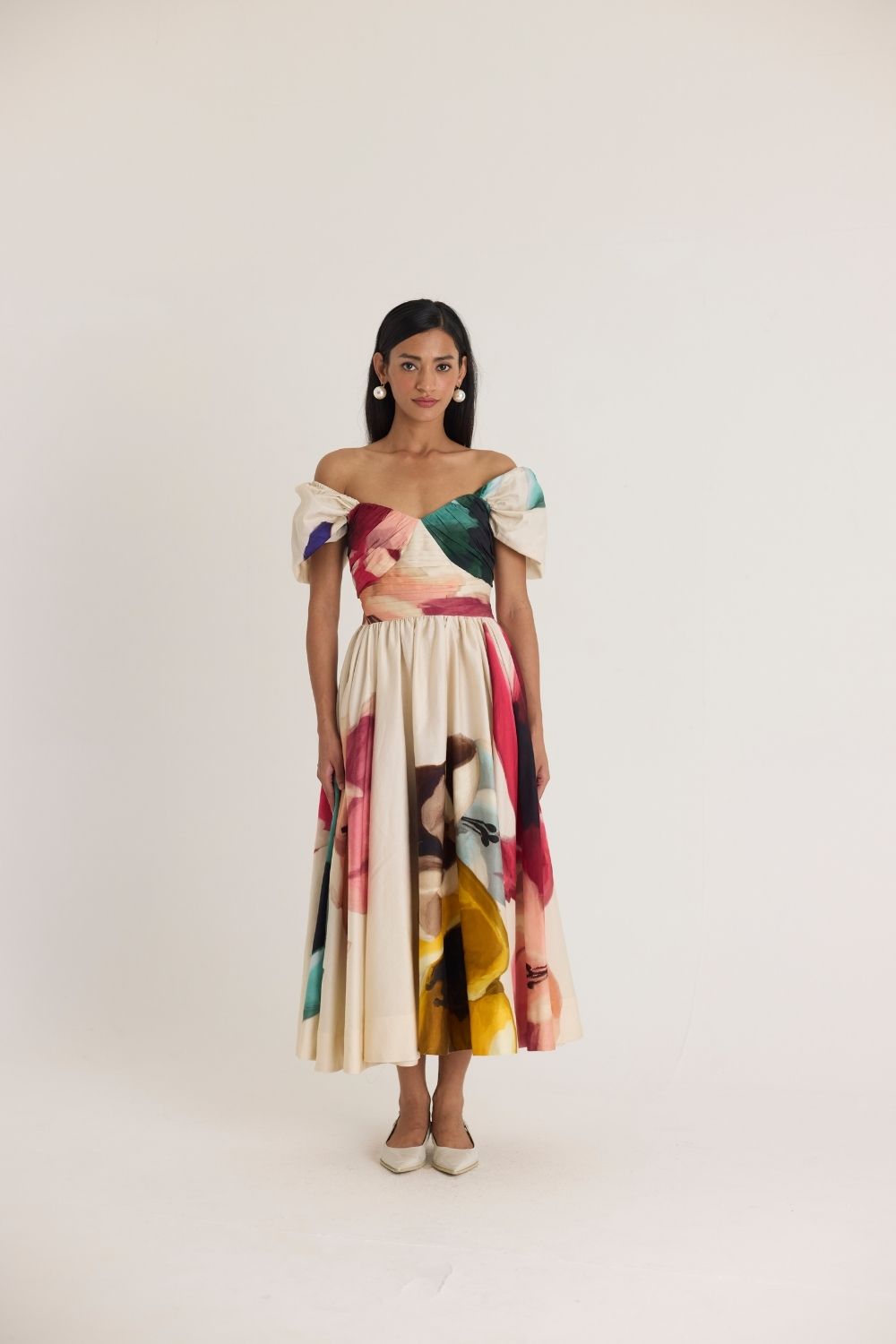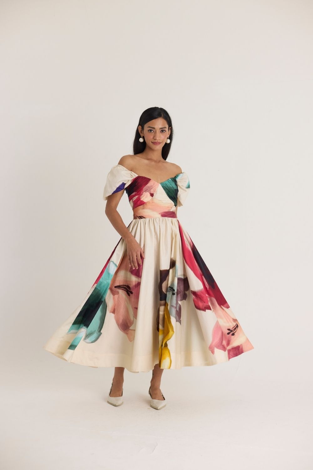 A romantic off-shoulder midi dress featuring a structured bodice with delicate ruching and a voluminous skirt adorned with an artistic watercolor-inspired print. The sweetheart neckline and puffed sleeves add a touch of vintage charm, making it perfect for both daytime and evening occasions.
