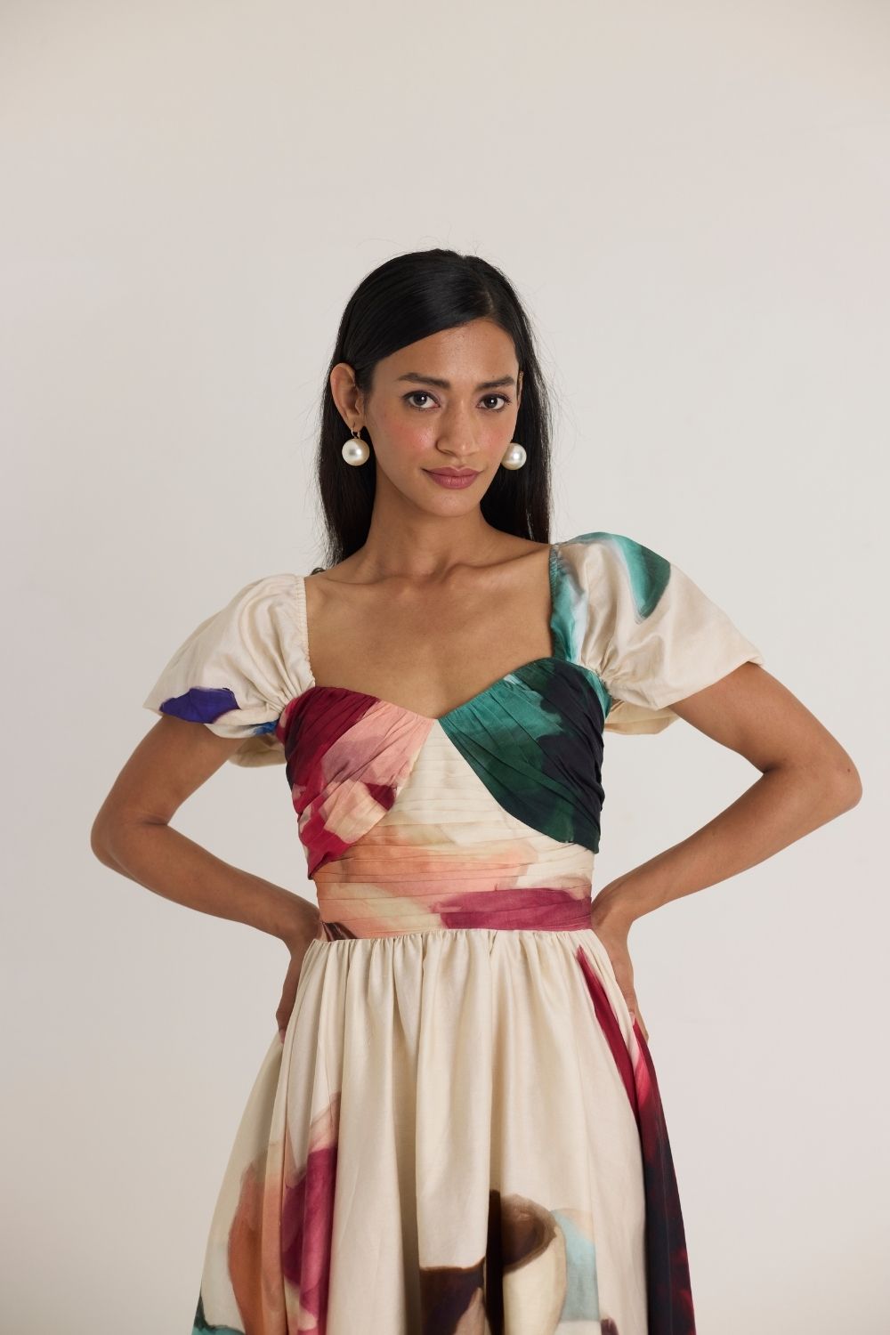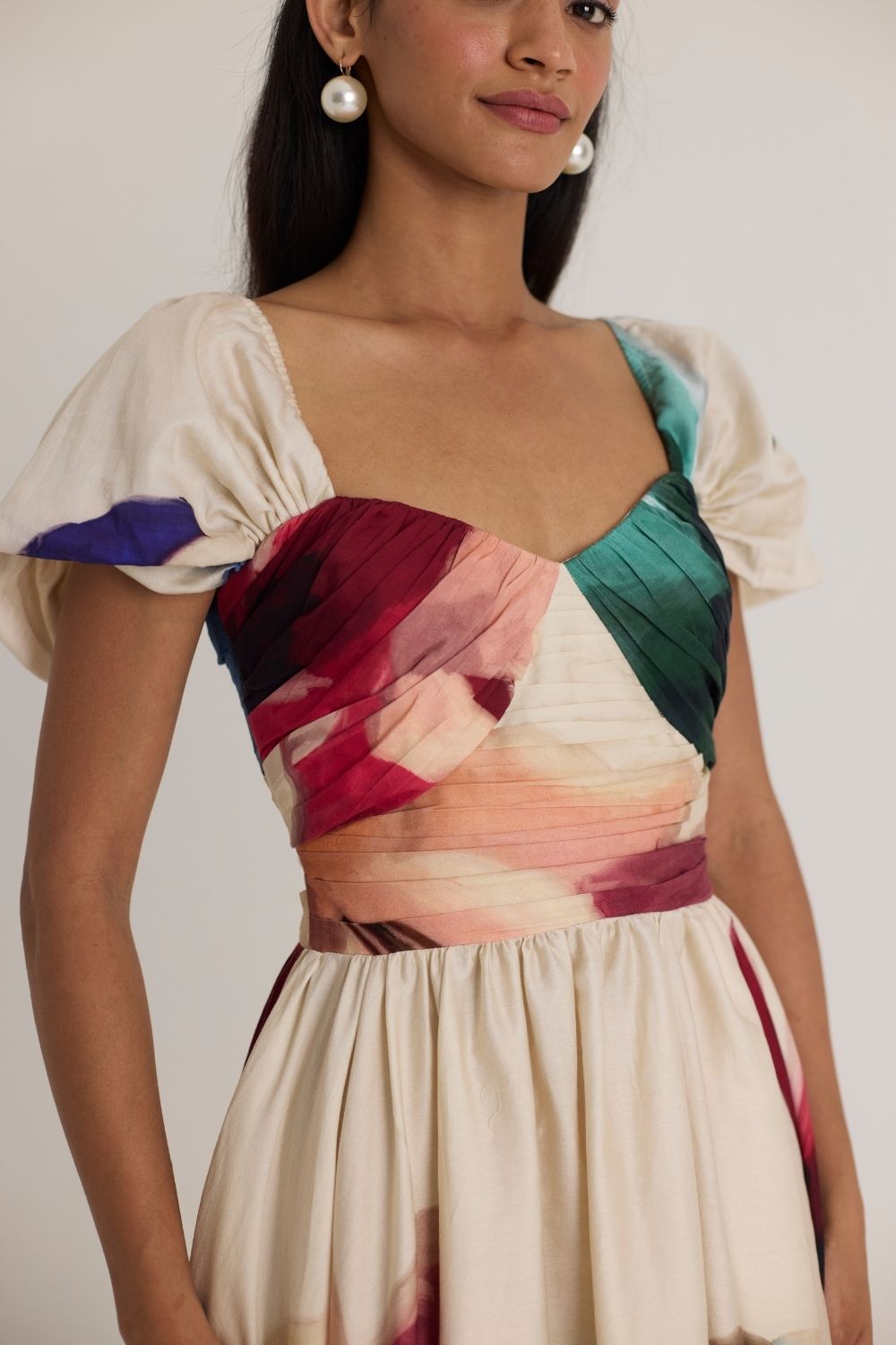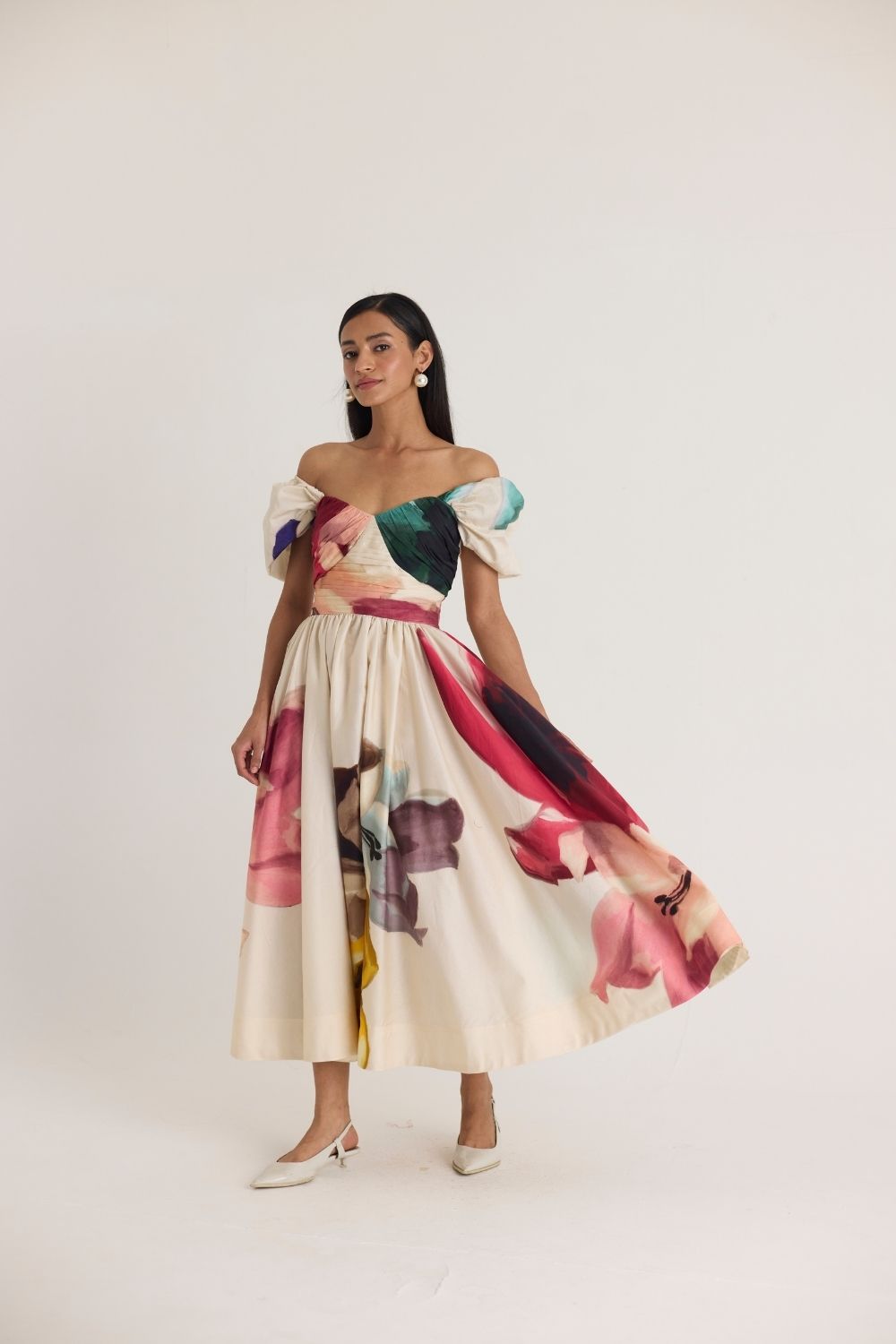 A romantic off-shoulder midi dress featuring a structured bodice with delicate ruching and a voluminous skirt adorned with an artistic watercolor-inspired print. The sweetheart neckline and puffed sleeves add a touch of vintage charm, making it perfect for both daytime and evening occasions.
