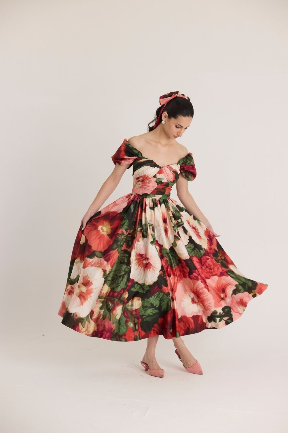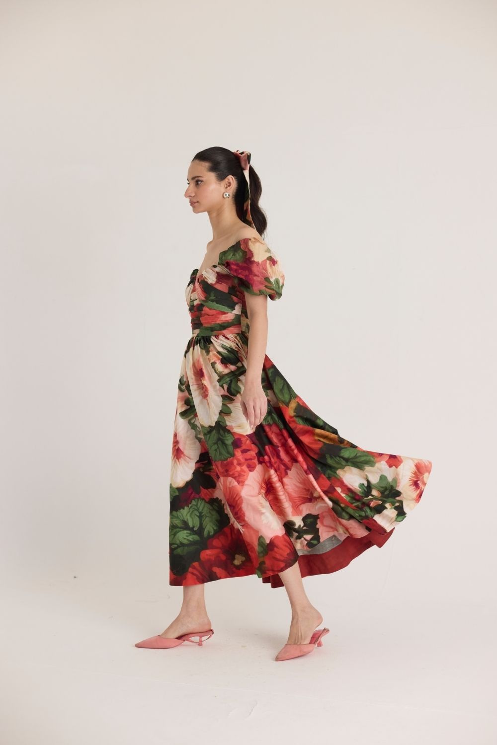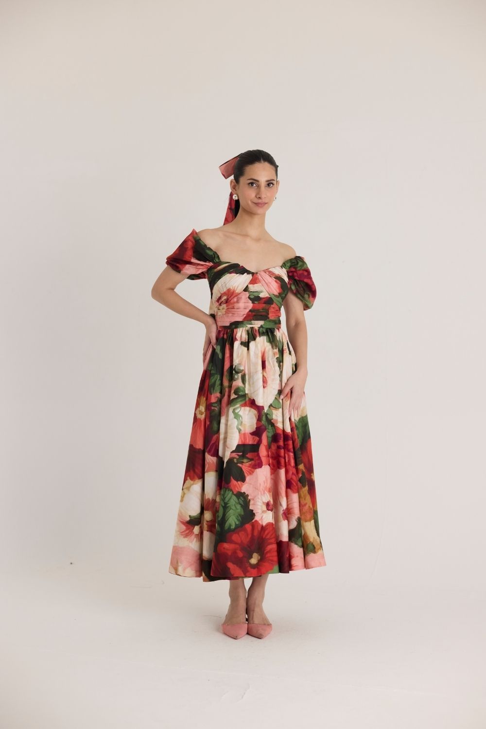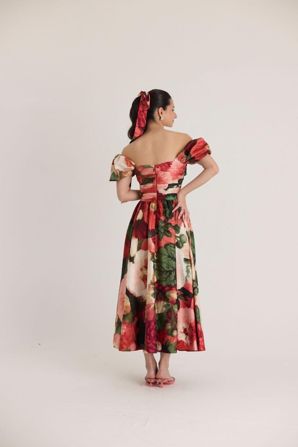 A stunning off-shoulder midi dress featuring a vibrant floral print in rich red, green, and soft pink hues. Designed with a sweetheart neckline and ruched bodice, the dress exudes femininity and elegance. The voluminous puff sleeves add a touch of drama, while the full, flowing skirt enhances movement and grace. Finished with a concealed back zipper for a seamless fit.