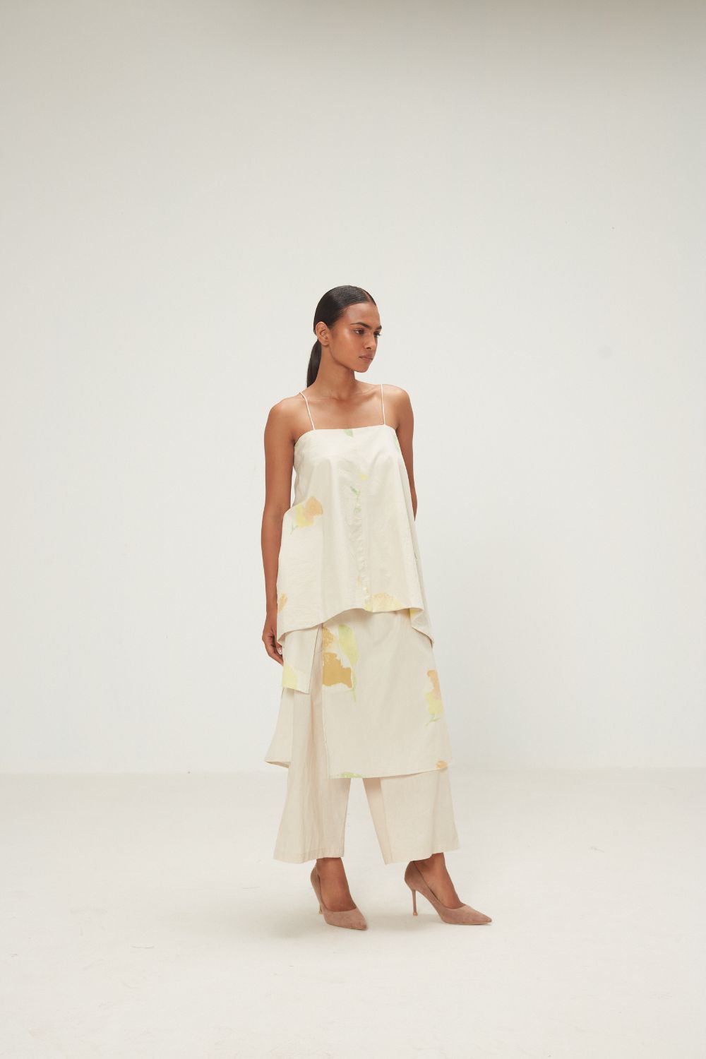 A skirt trouser with structured waist and side seam pockets. The skirt and the trouser is in vory base with soft painterly motifs in muted greens and warm ochres. Designed for ease and versatility.