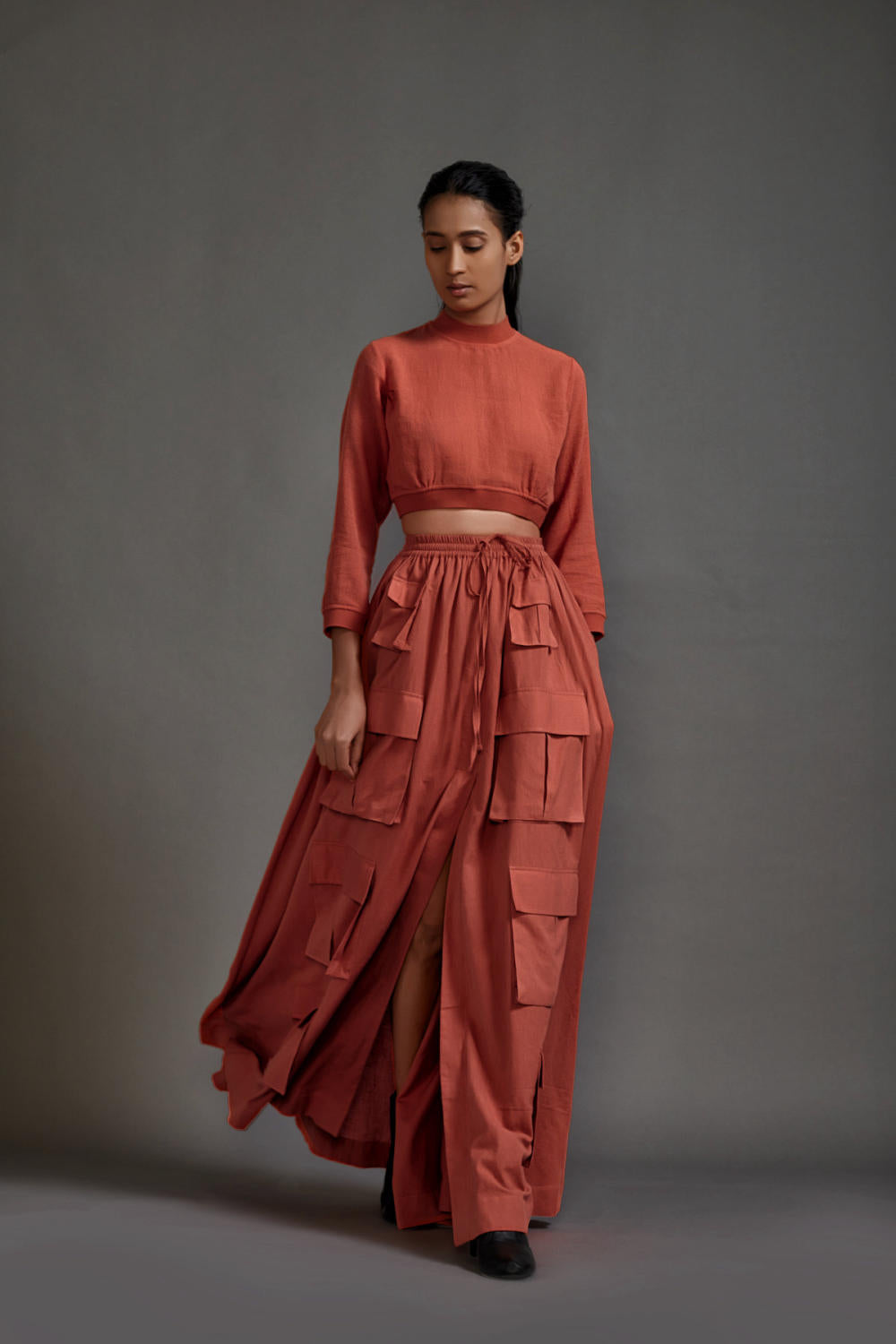 A long safari skirt with elastic waistline, cargo pockets and slit at the centre.