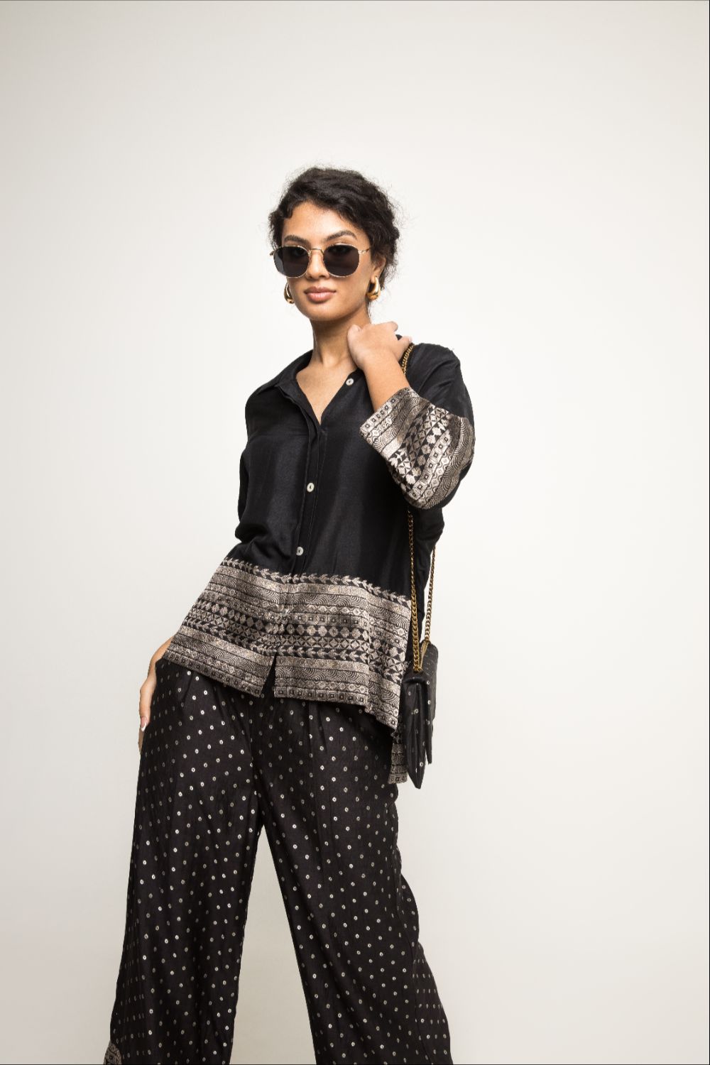 Black oversized silk shirt with brocade detail paired with statement dotted brocade pants