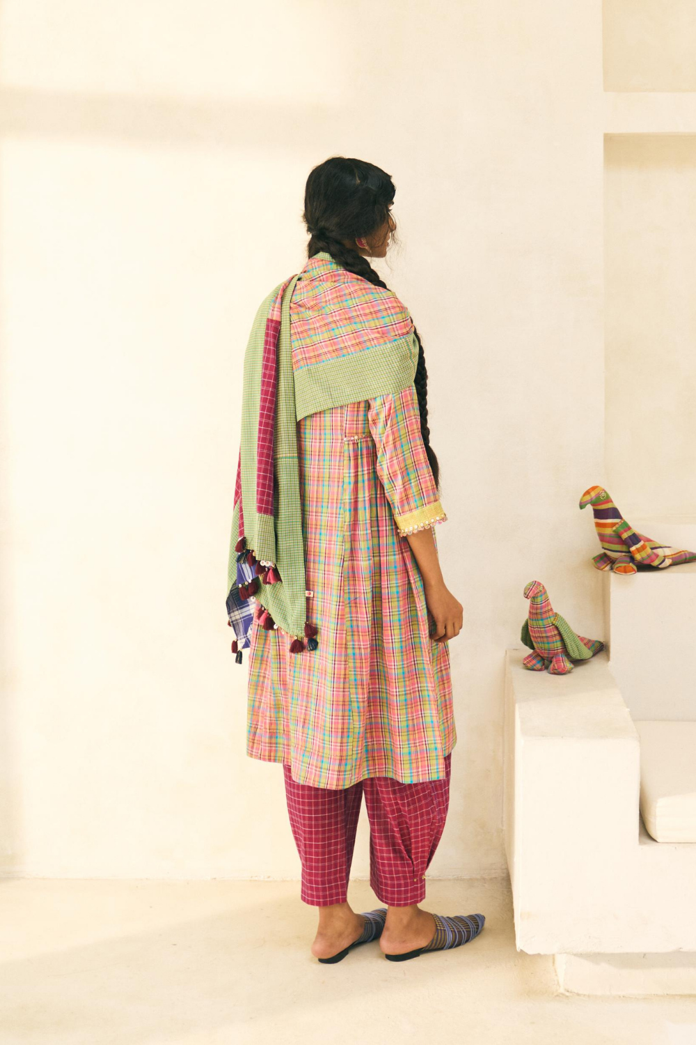 Multicolor check stole finished with hand-done tassels and beaded detailing, in handwoven yarn-dyed Bengal 100% cotton checks.