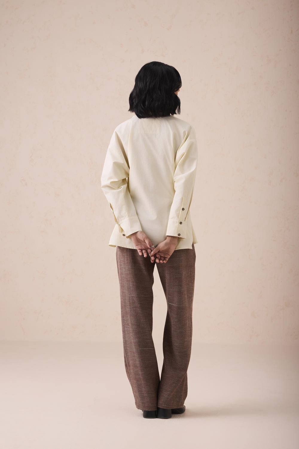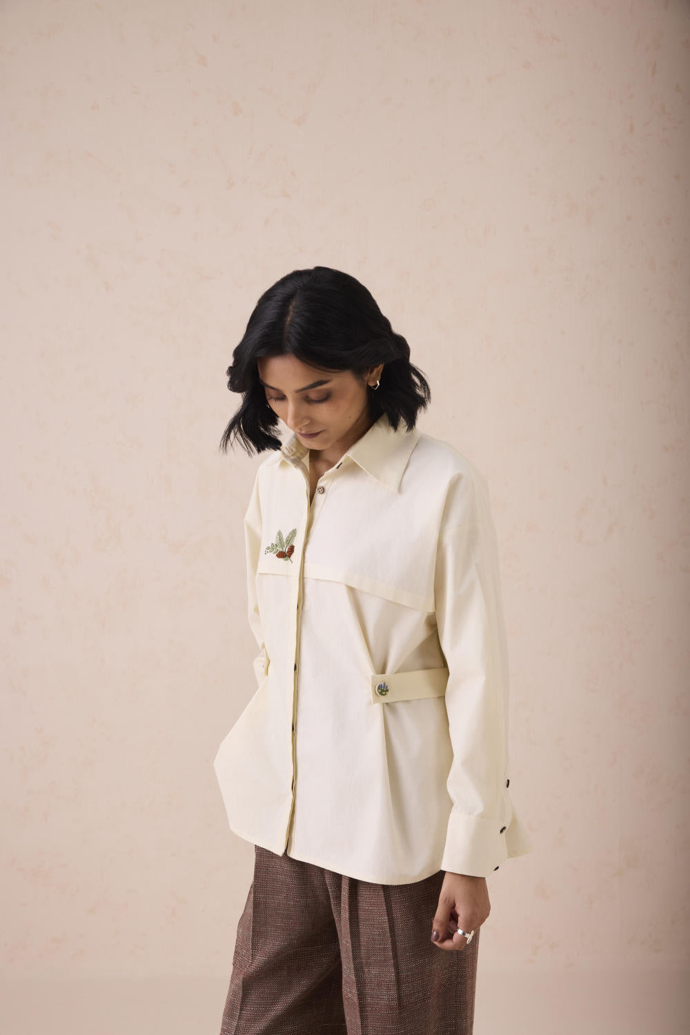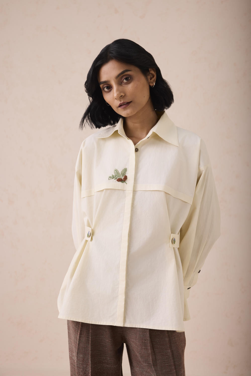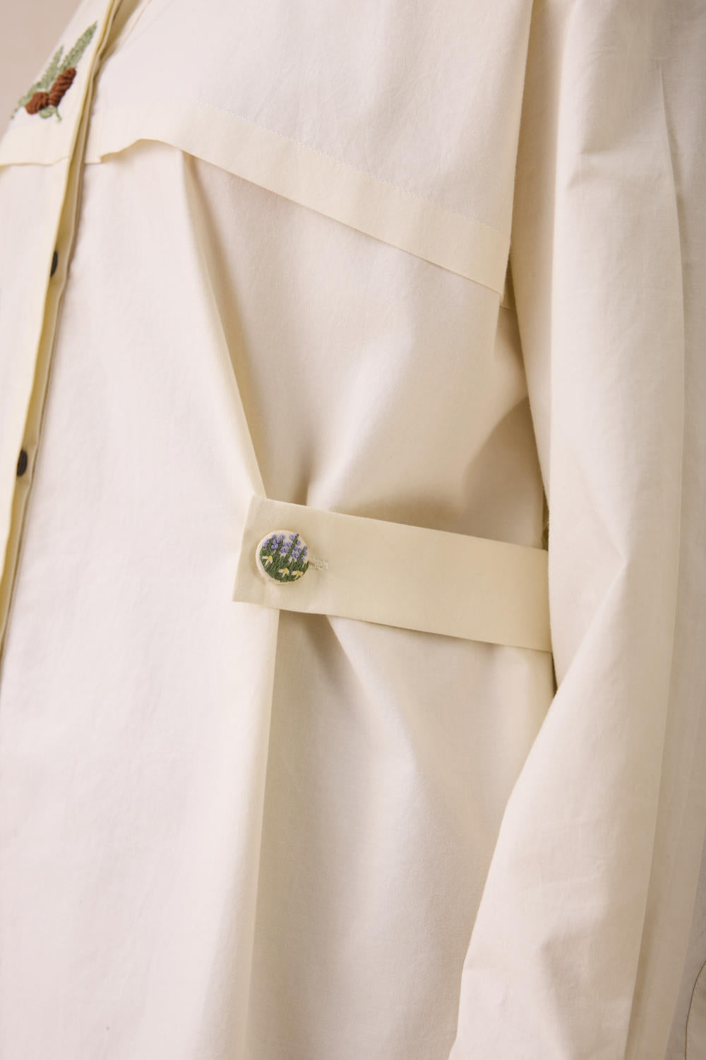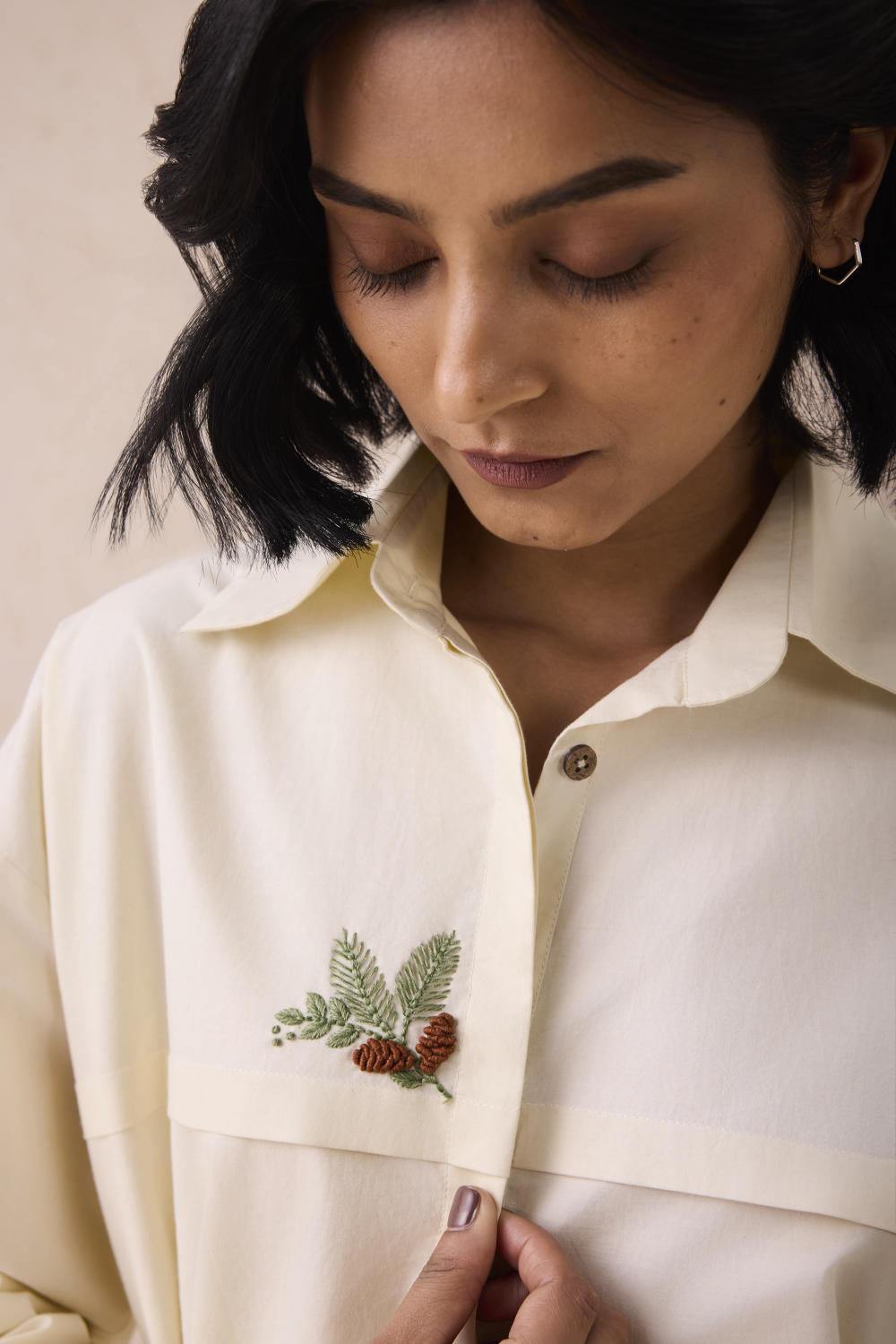 Relaxed fit, long sleeve, classic shirt that buttons in the front and can be fitted with buttons at the waist, crafted in organic cotton poplin fabric, hand embroidered with pinecone, leaf and flower motifs. A classic, staple shirt is versatile and can be endlessly mixed-and-matched to create a fresh outfit each time you put it on.