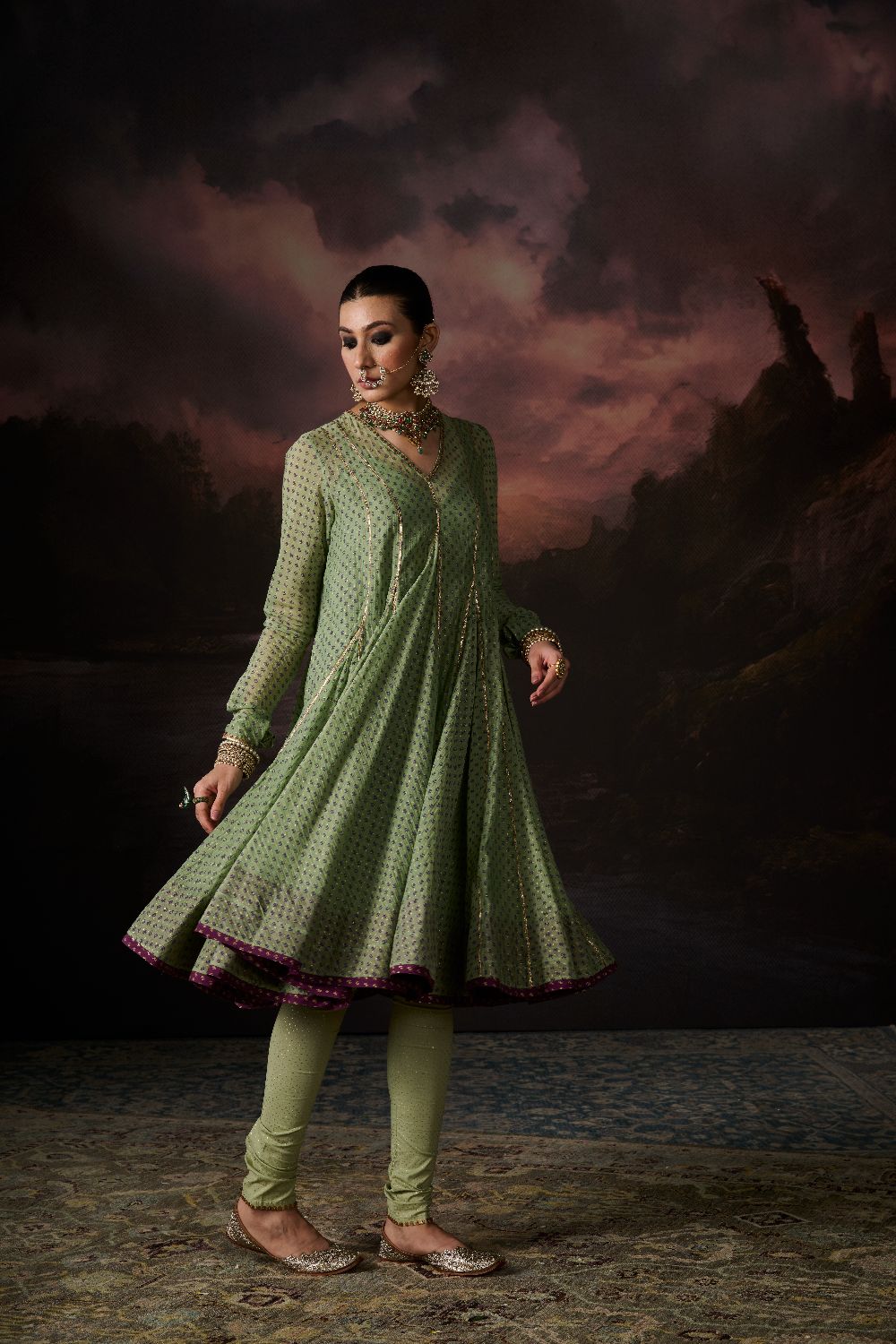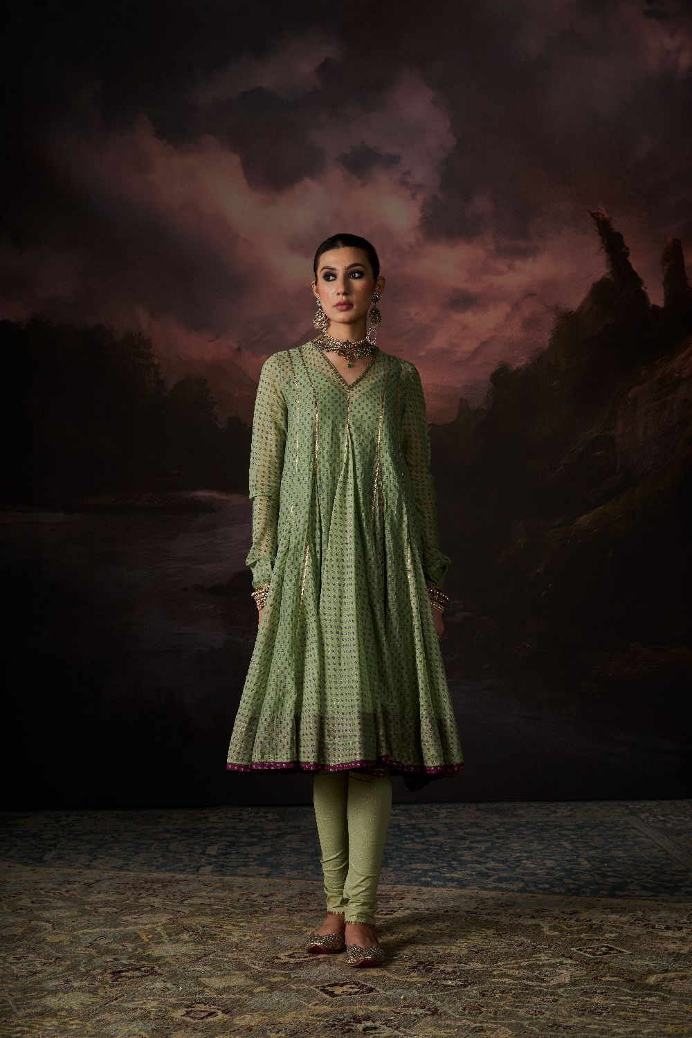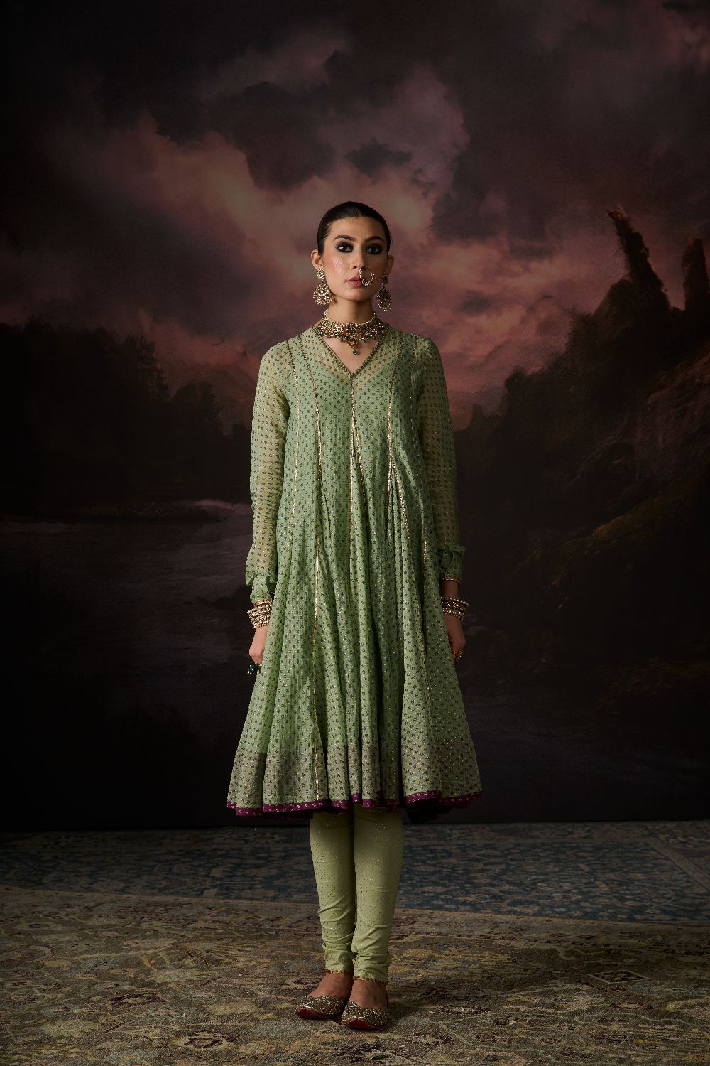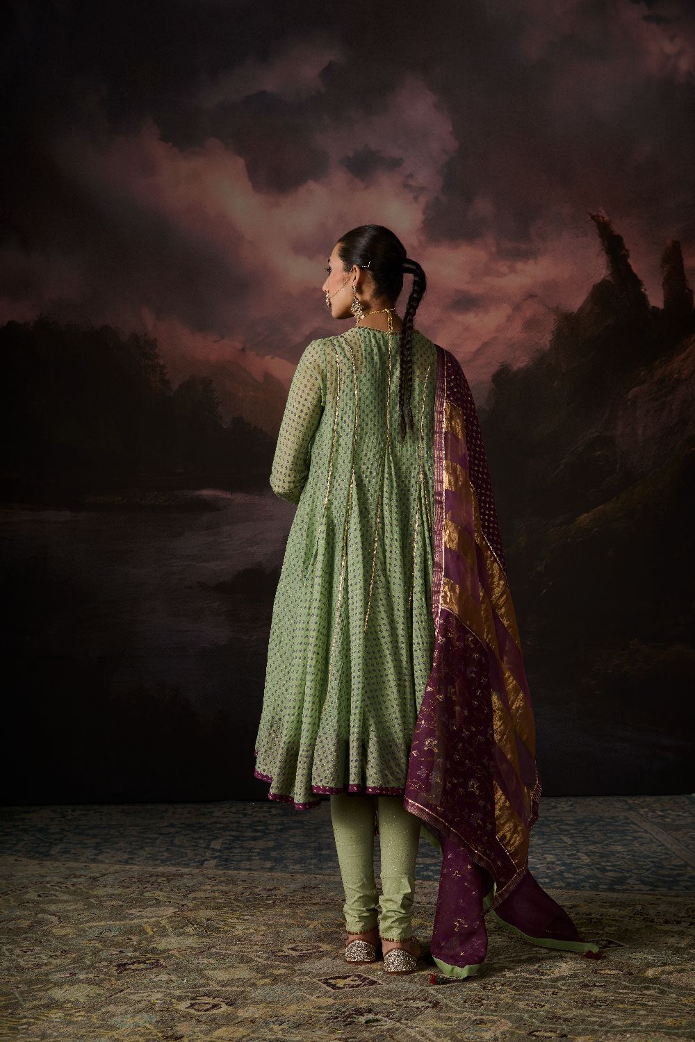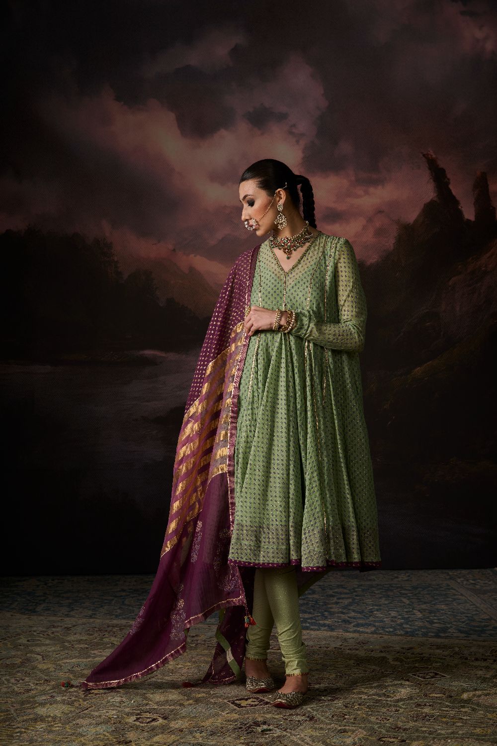 Her Chanderi carries its signature translucence and soft sheen, but with a subtlety that feels almost ethereal — printed slowly, consciously, through hand block printing that heightens the fabric's inherent delicacy.