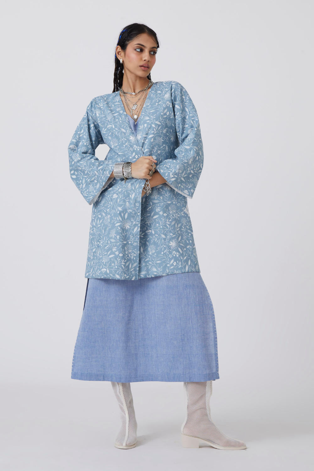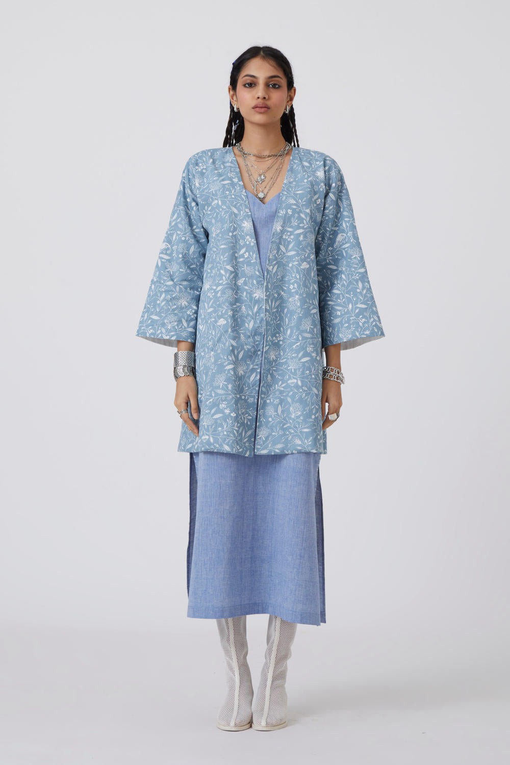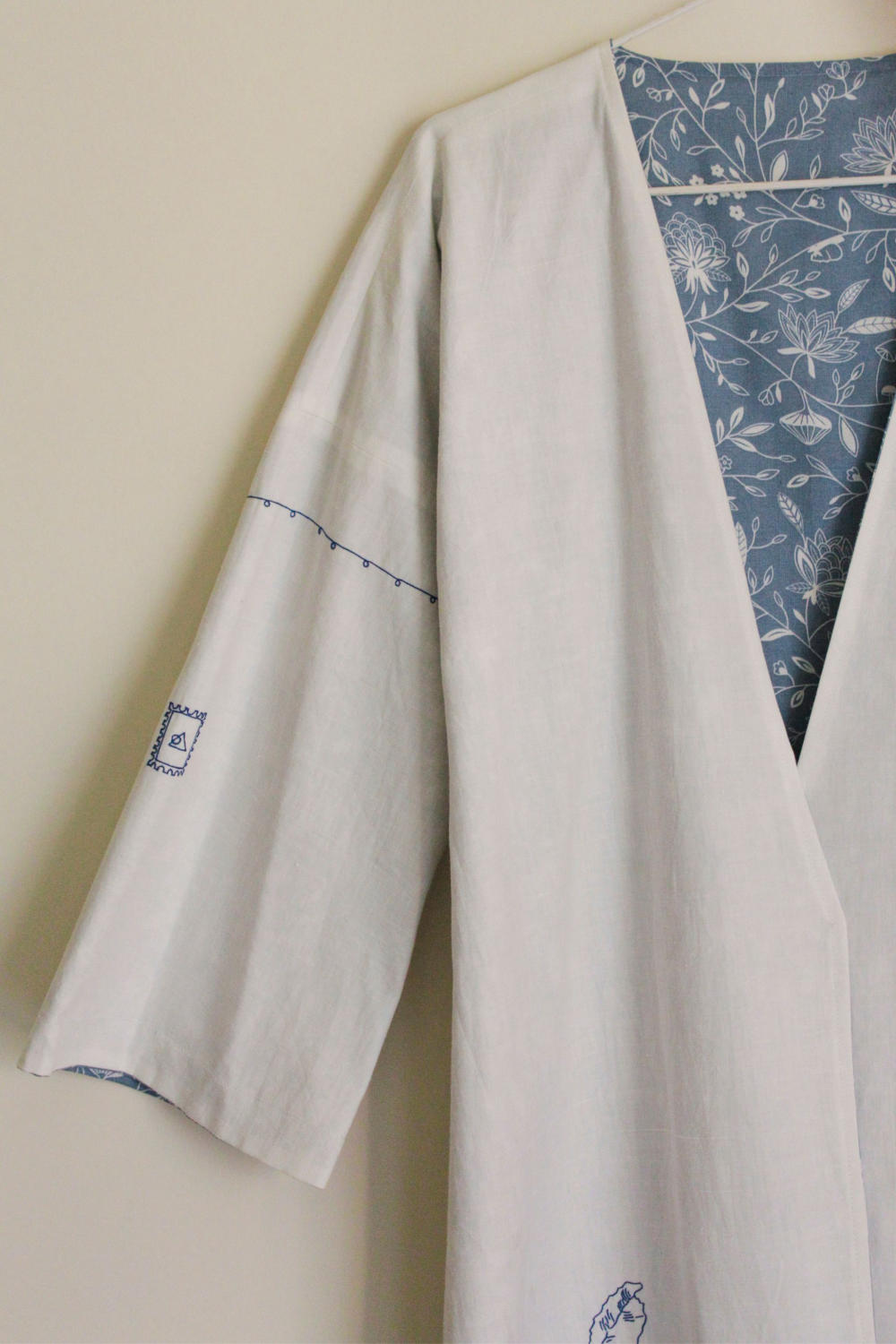 Kimono-inspired reversible jacket. Signature print in handwoven cotton on one side. Vintage hand embroidered floral motifs on the other. Drop shoulder.