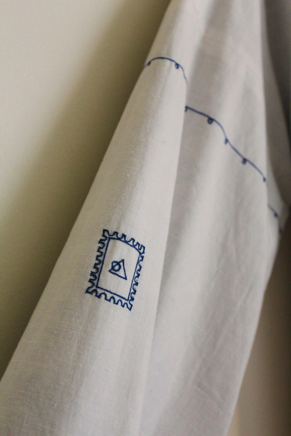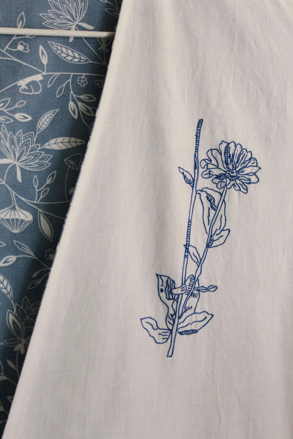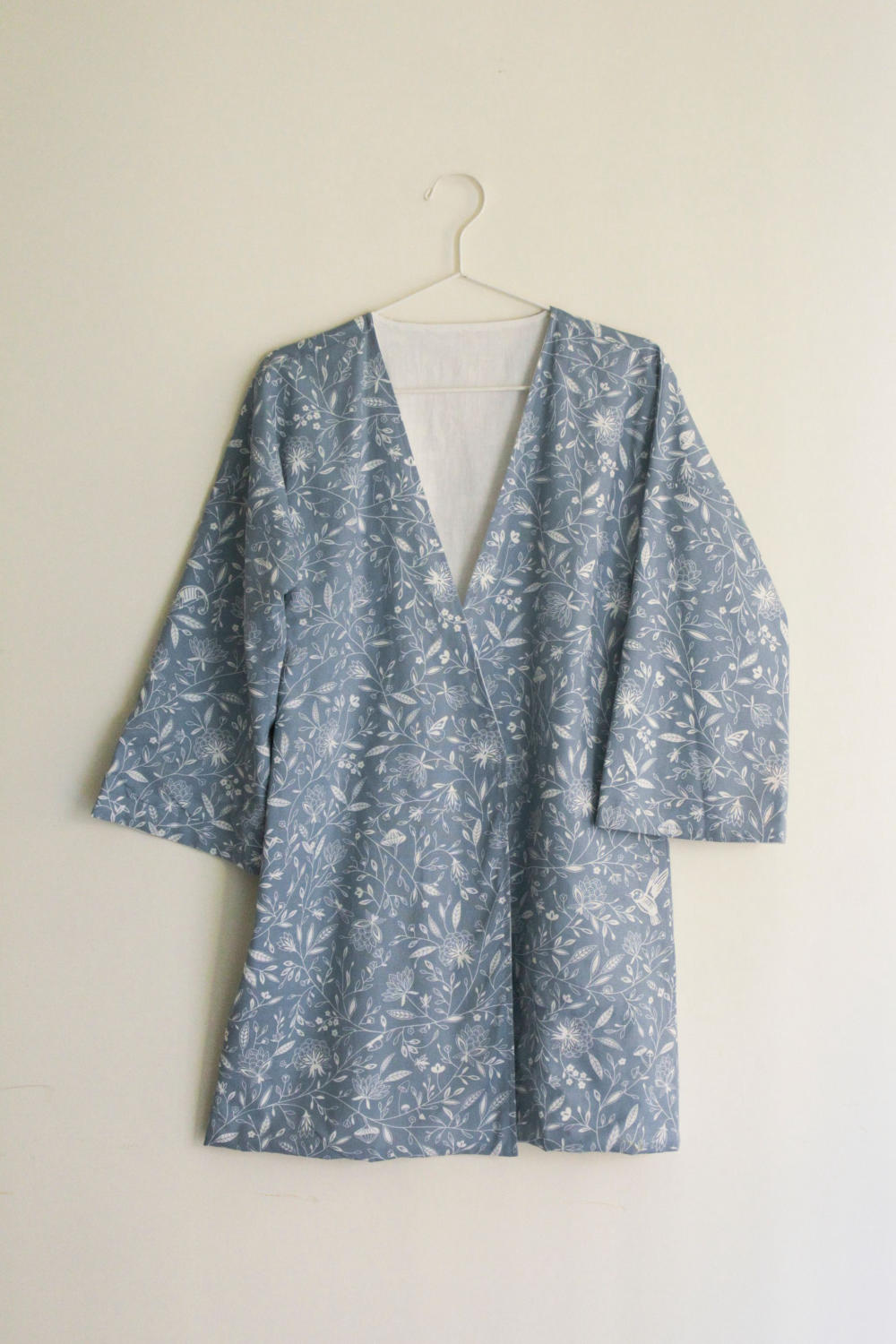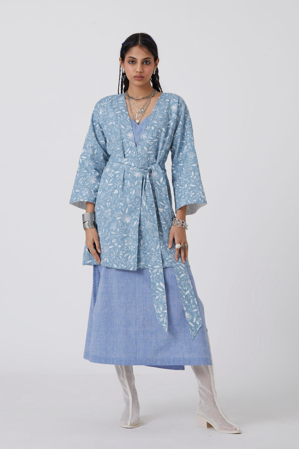 Kimono-inspired reversible jacket. Signature print in handwoven cotton on one side. Vintage hand embroidered floral motifs on the other. Drop shoulder.