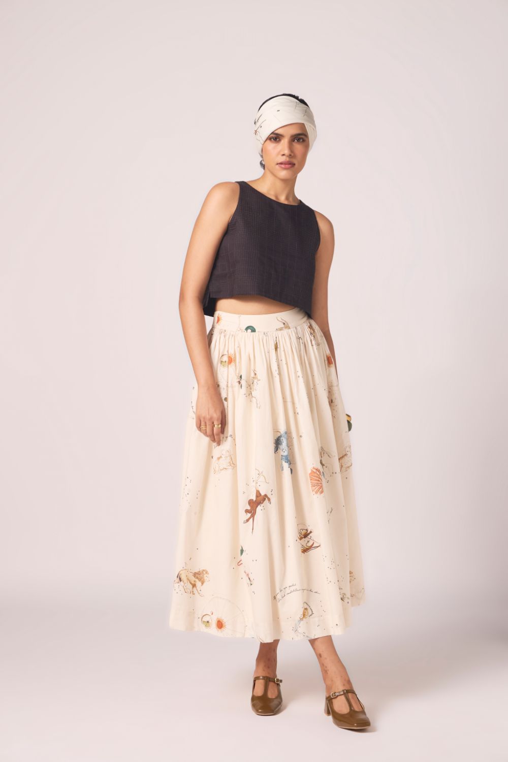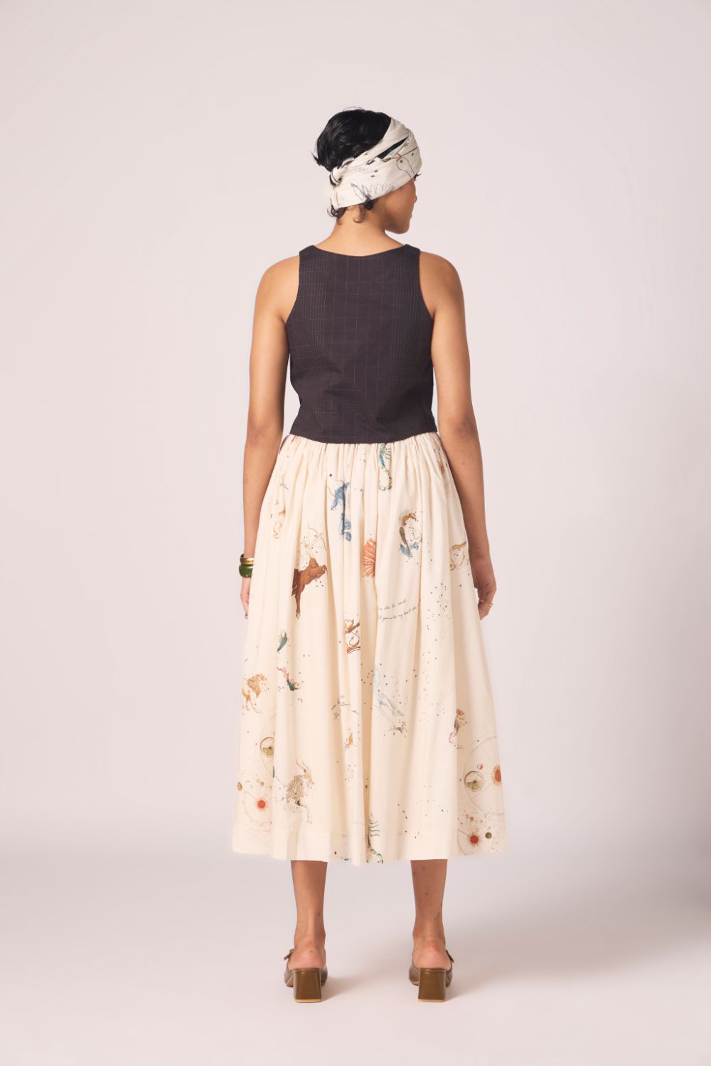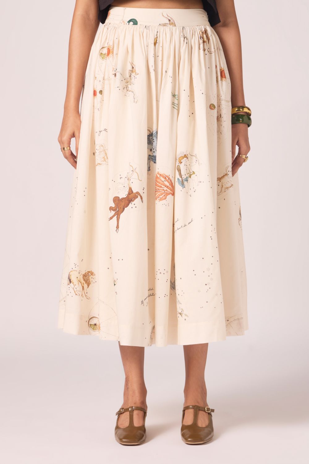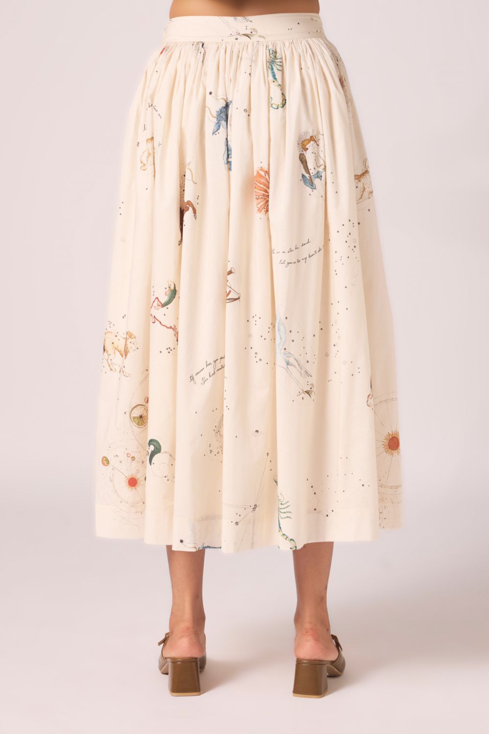 Designed to sit neatly at the waist and fall into an airy flare. Prints scattered across cotton lend vibrancy, while full lining lends depth to the silhouette.