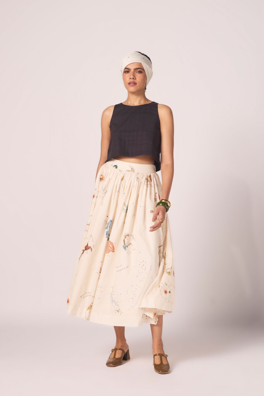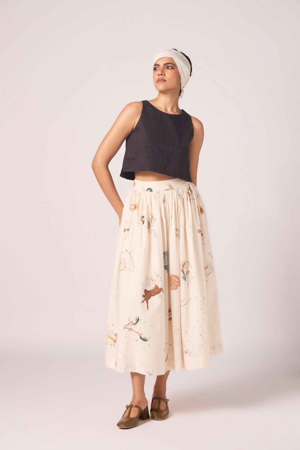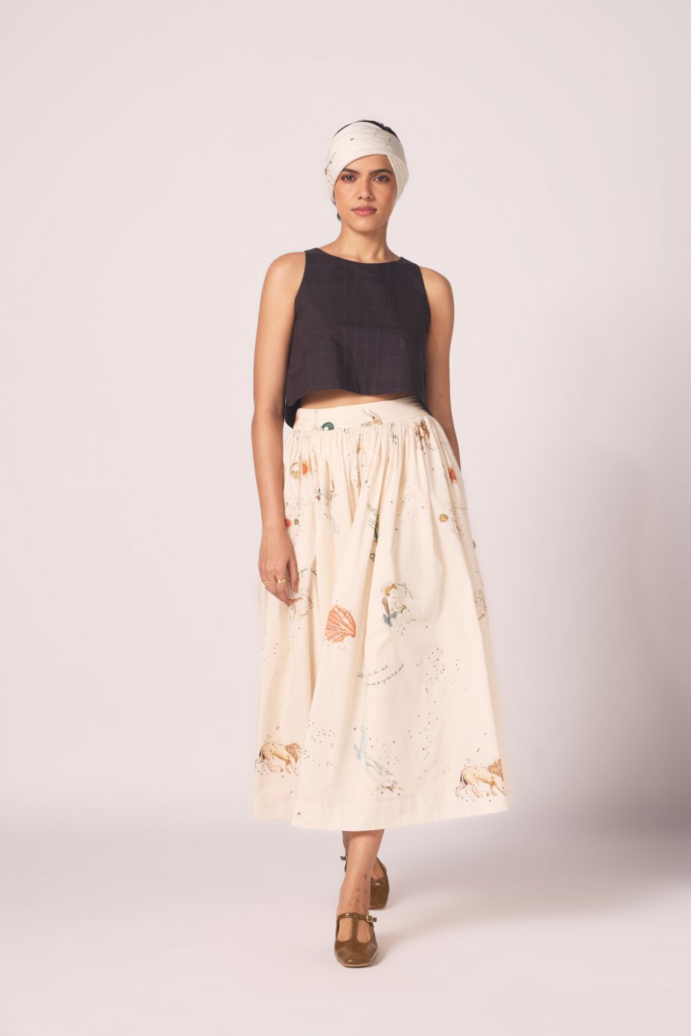 Designed to sit neatly at the waist and fall into an airy flare. Prints scattered across cotton lend vibrancy, while full lining lends depth to the silhouette.