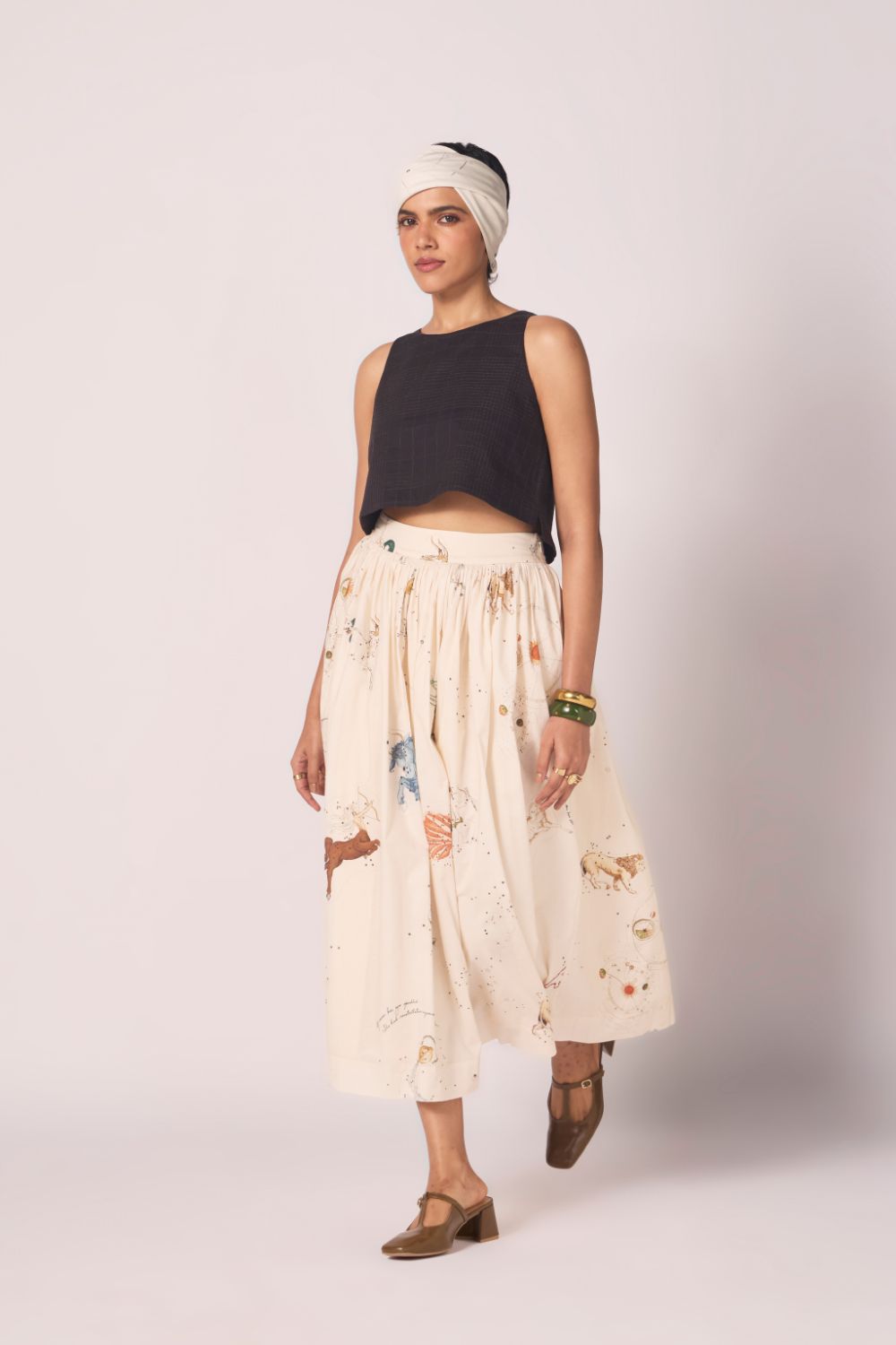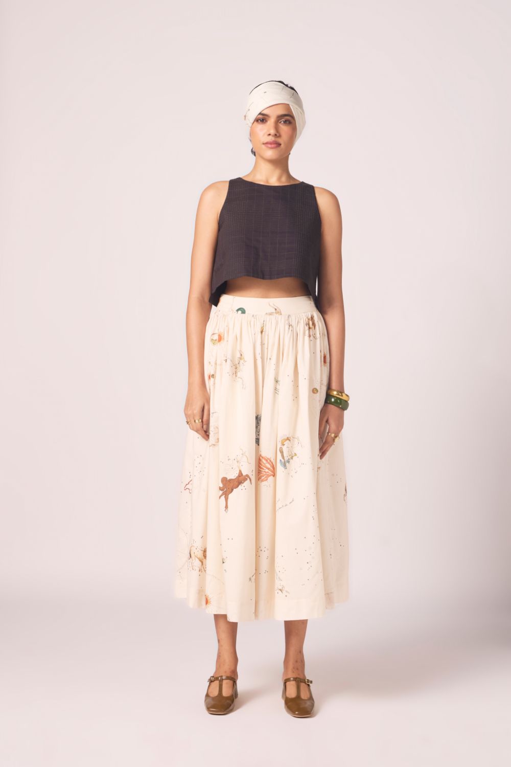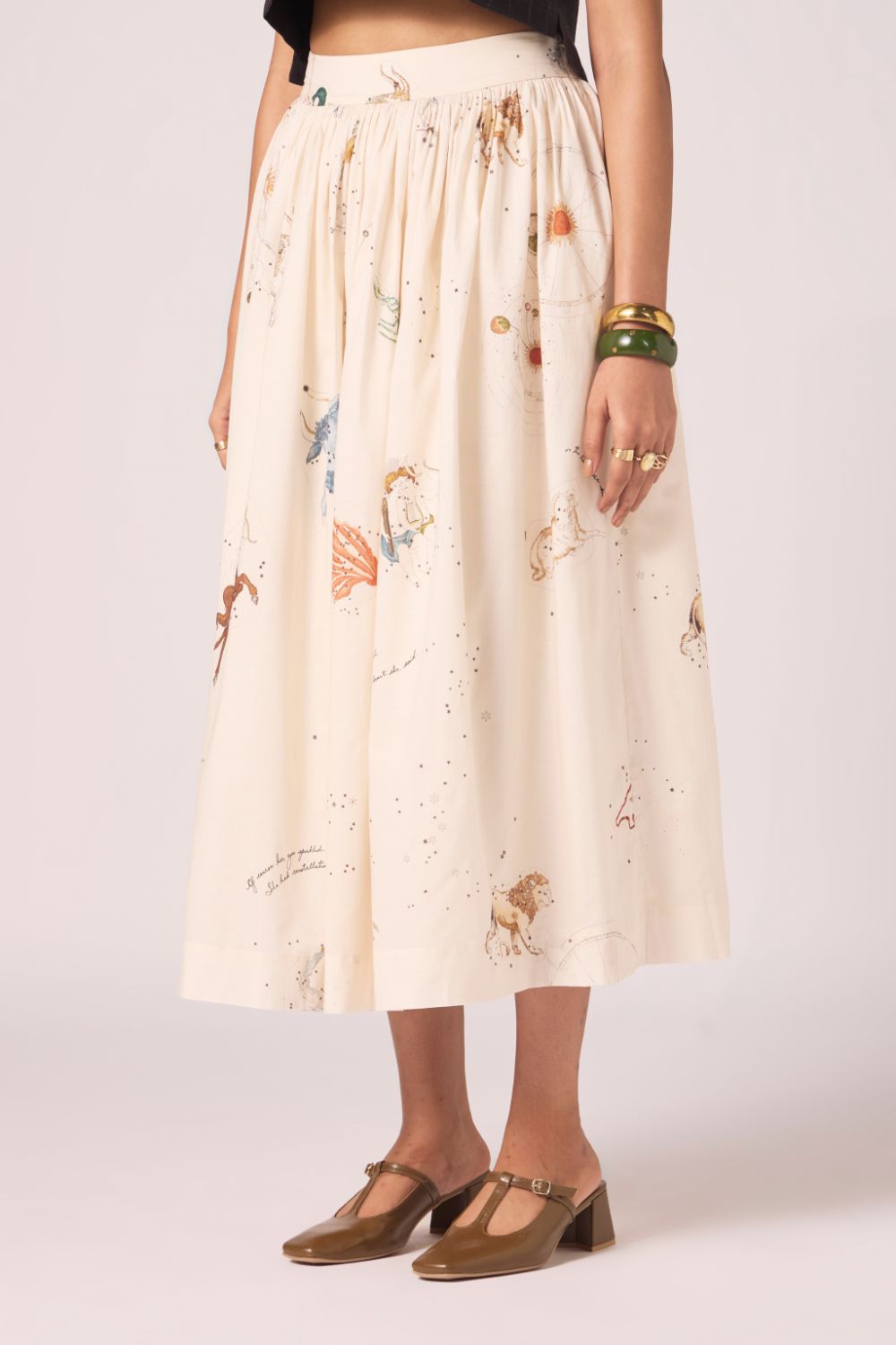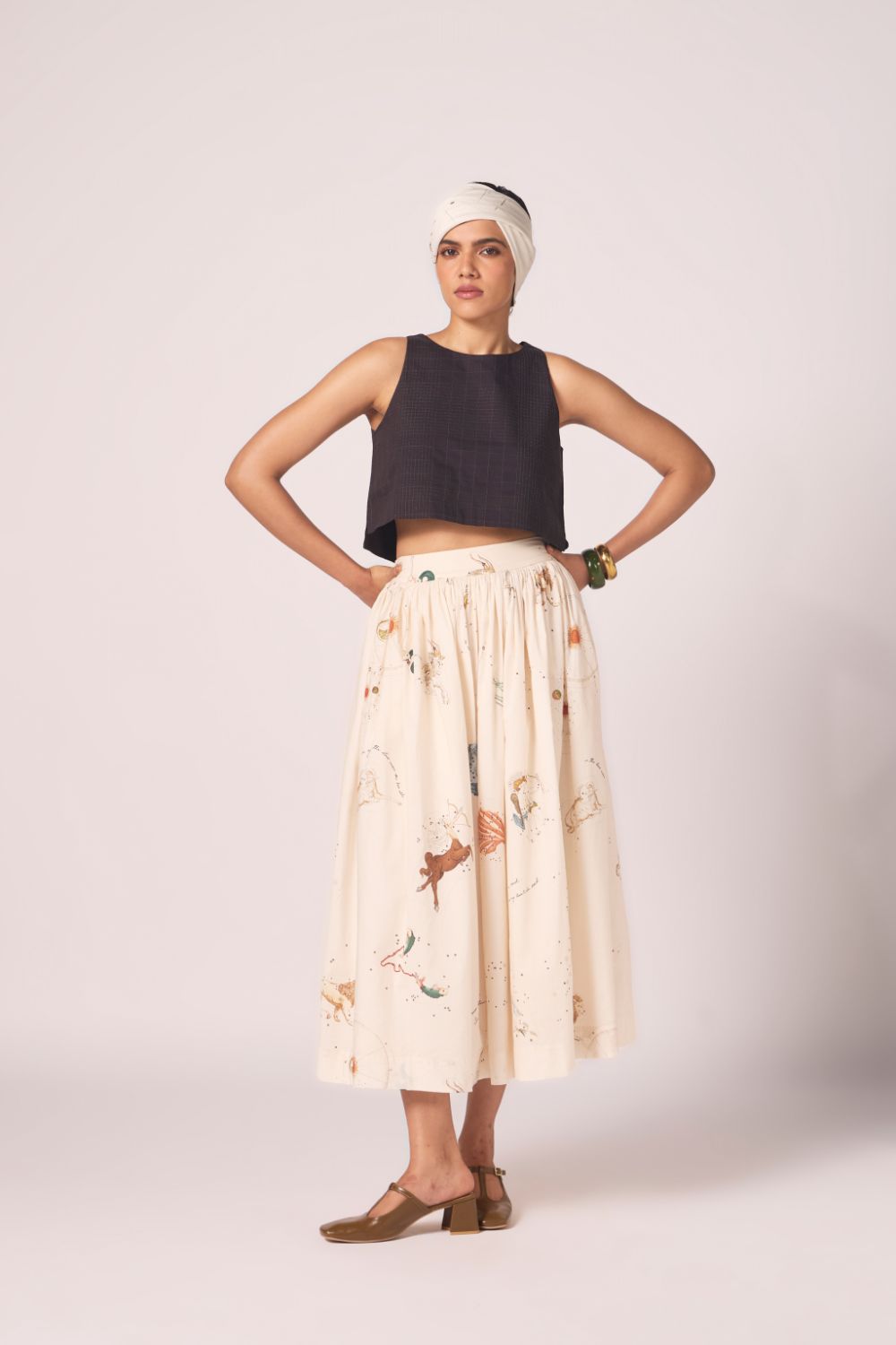 Designed to sit neatly at the waist and fall into an airy flare. Prints scattered across cotton lend vibrancy, while full lining lends depth to the silhouette.