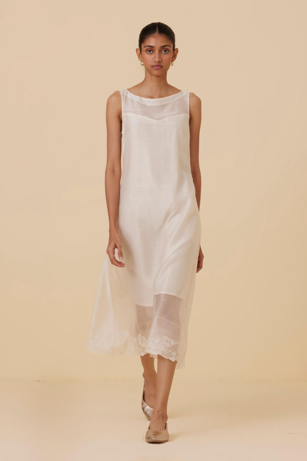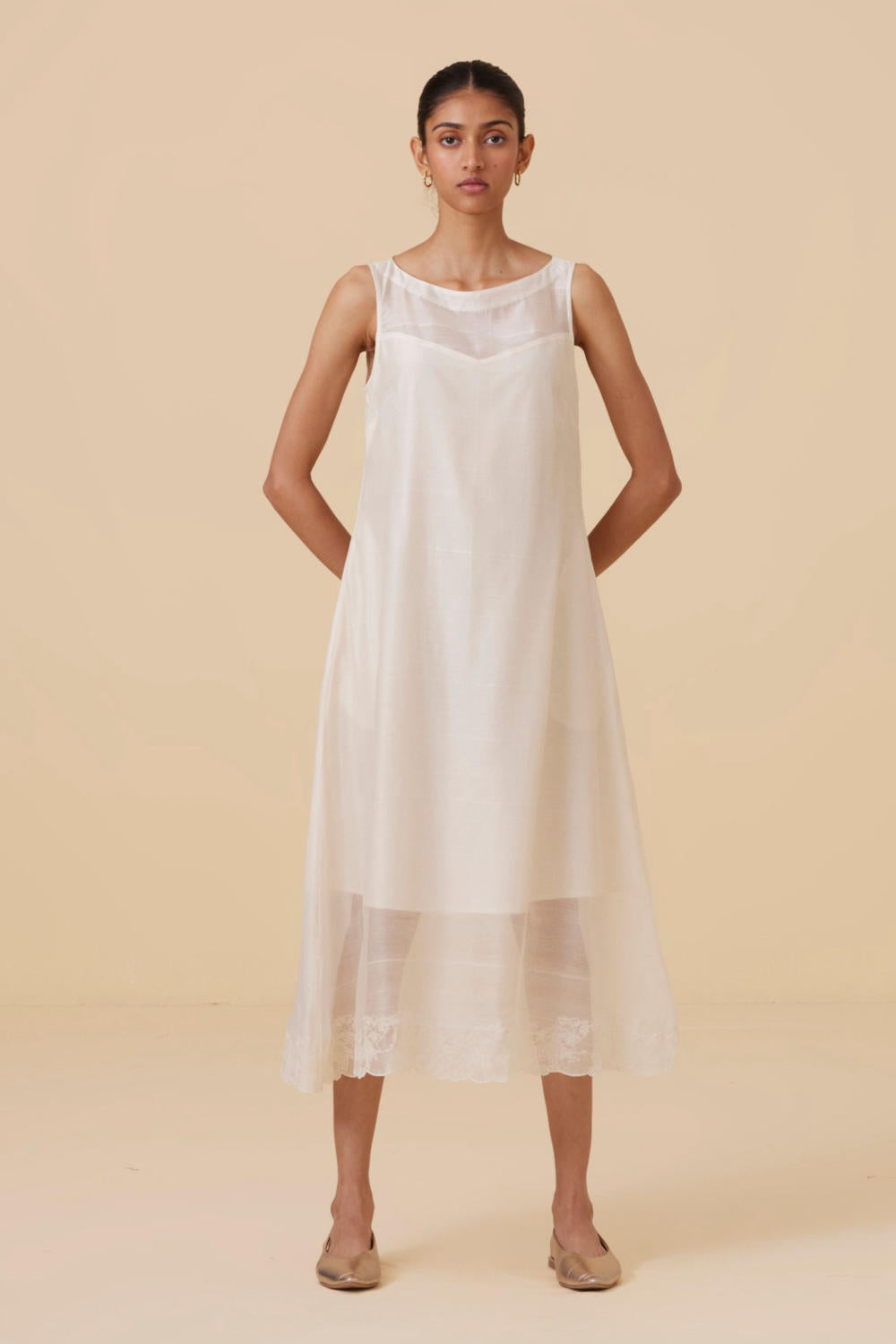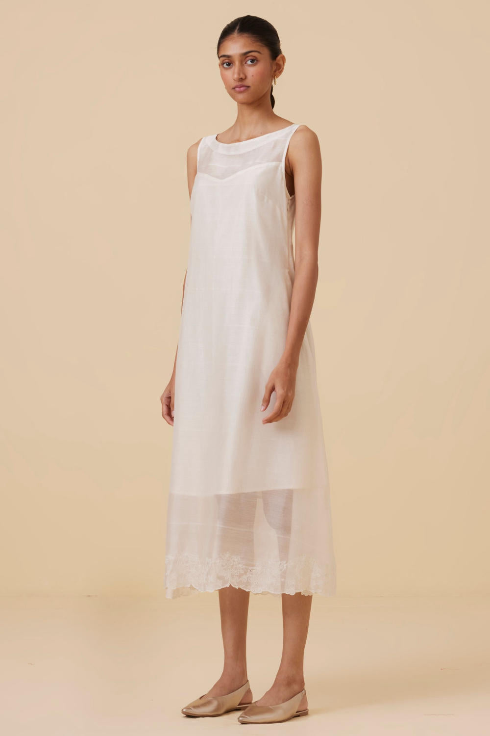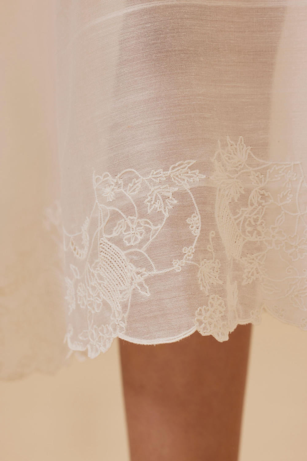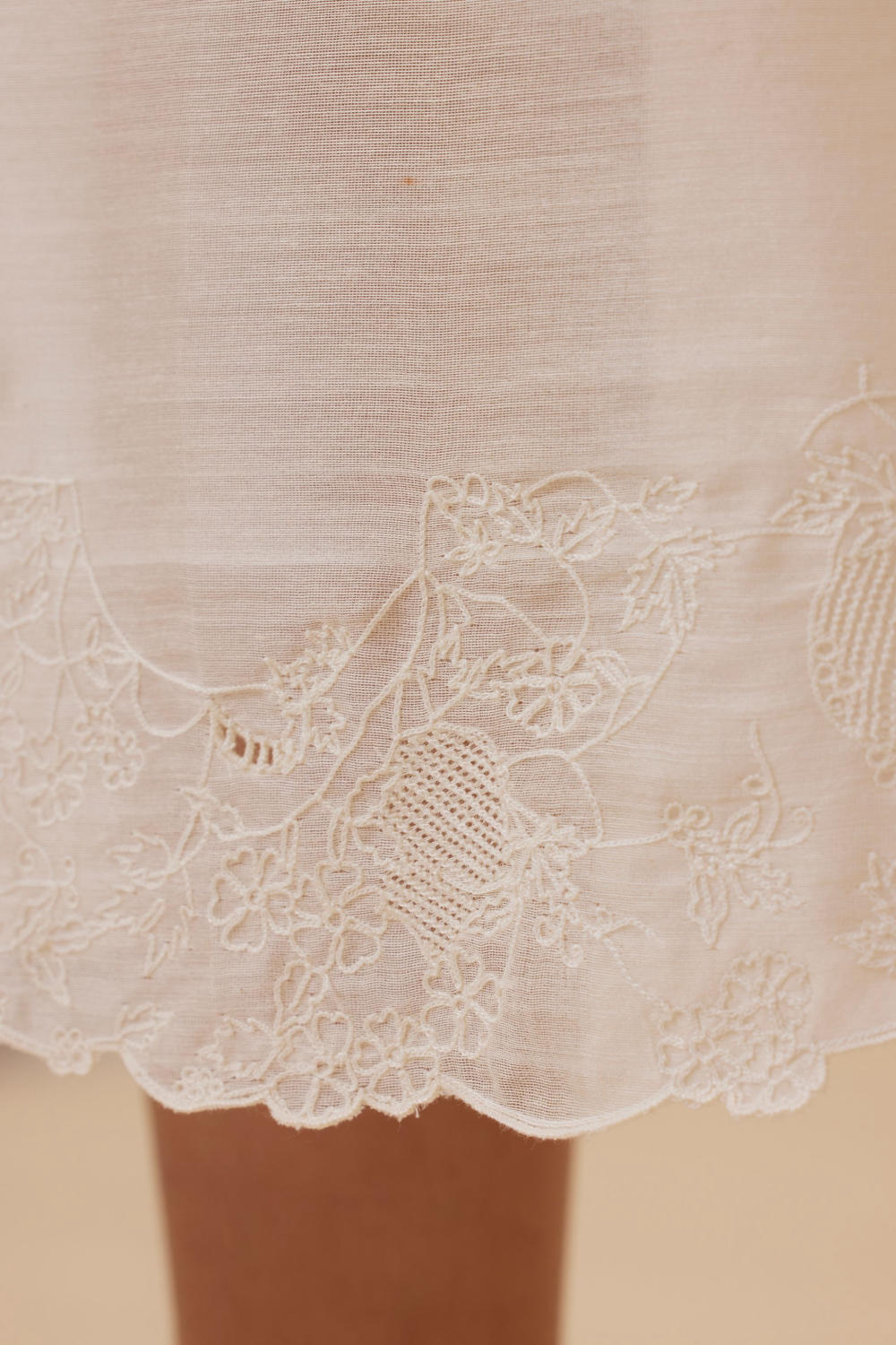 Vintage inspired dress with a delicate embroidery at the hem inspired by lace. This dress is lined as shown in the images. Sleeves can be added on request. Embroidered by hand in our studio. Slight differences in embroidery speak to the hand processes involved.