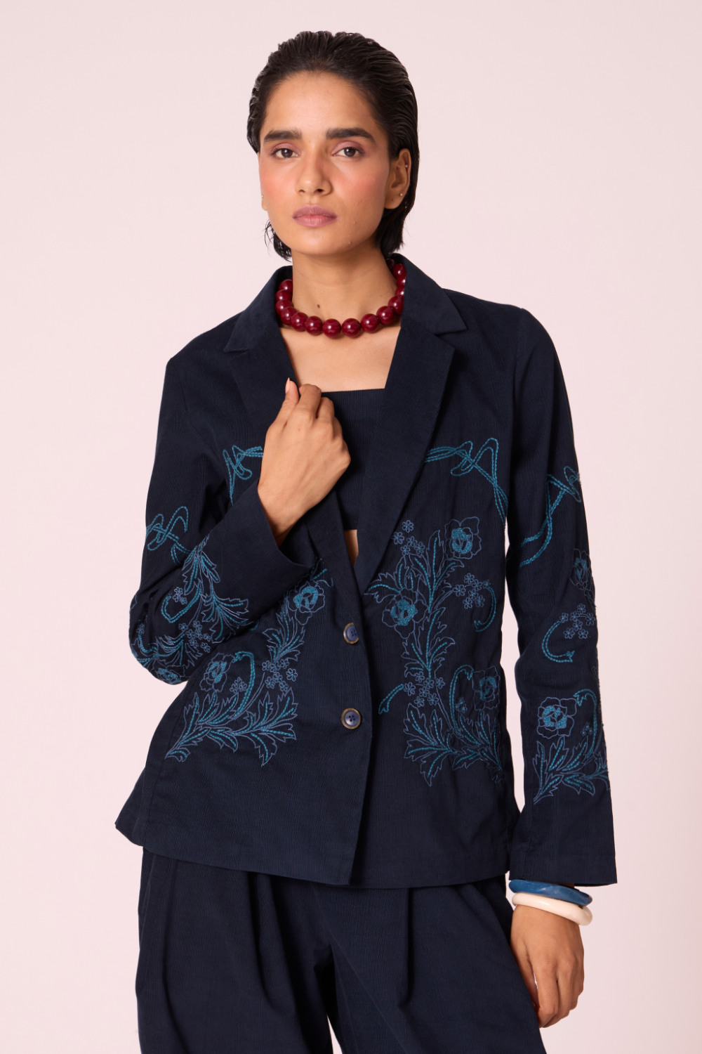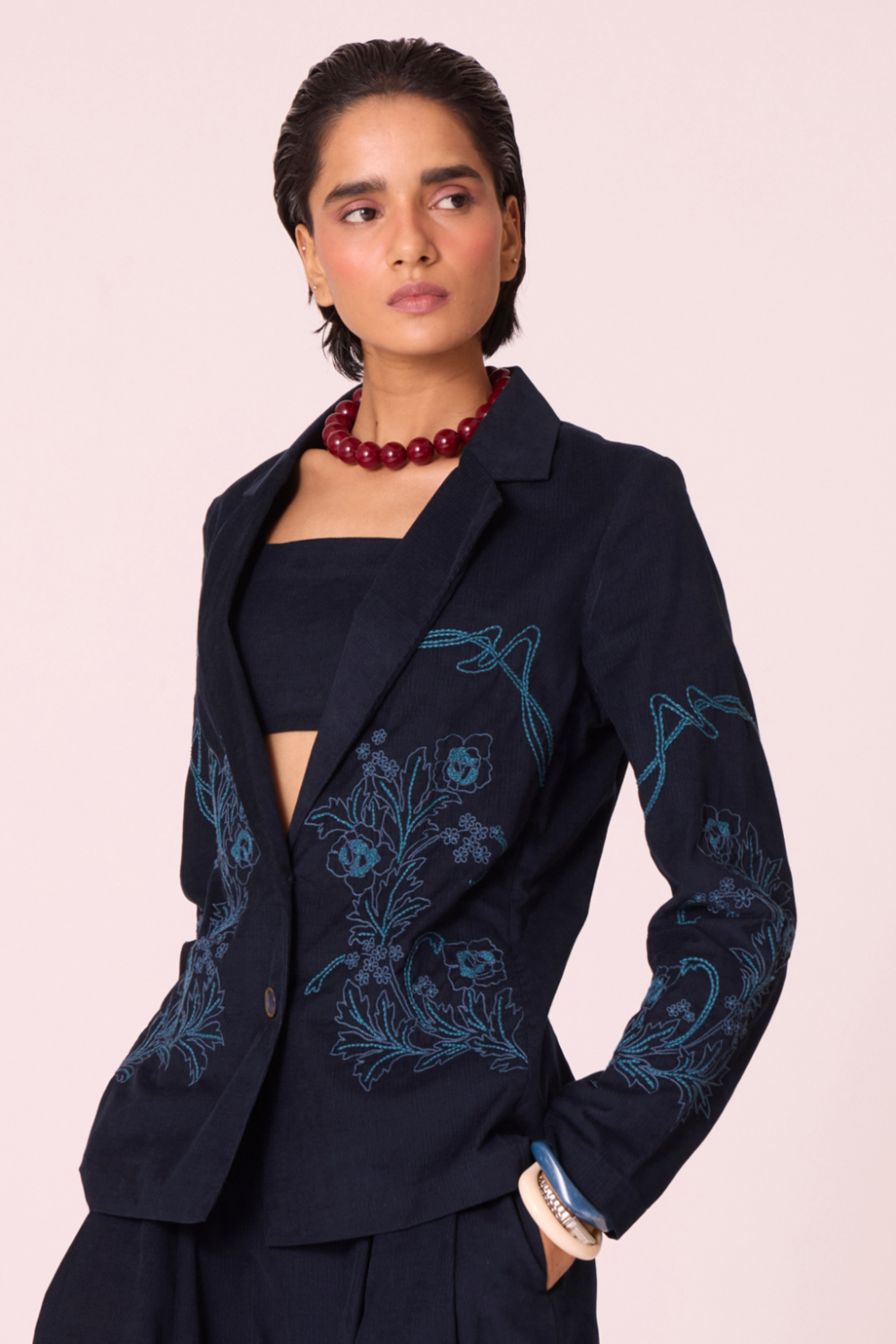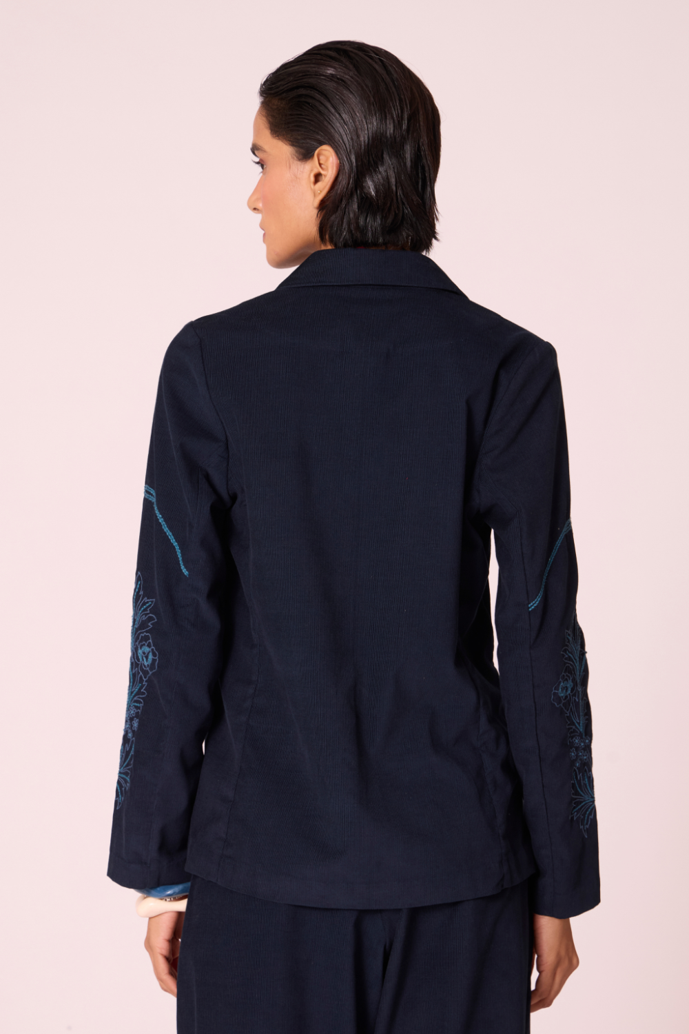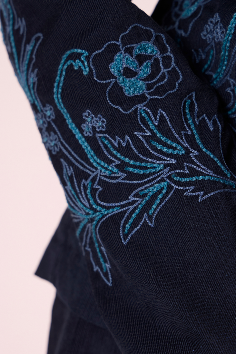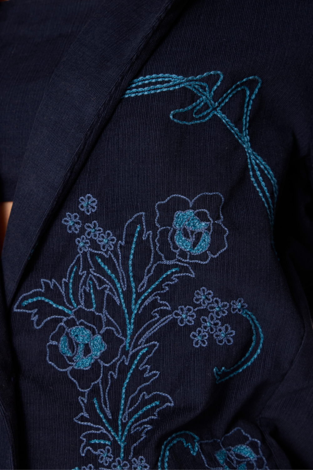 A tailored, slim-lined jacket shaped in supple needlecord. Embroidered accents at the waist and sleeve. Designed for events that require extra polish.