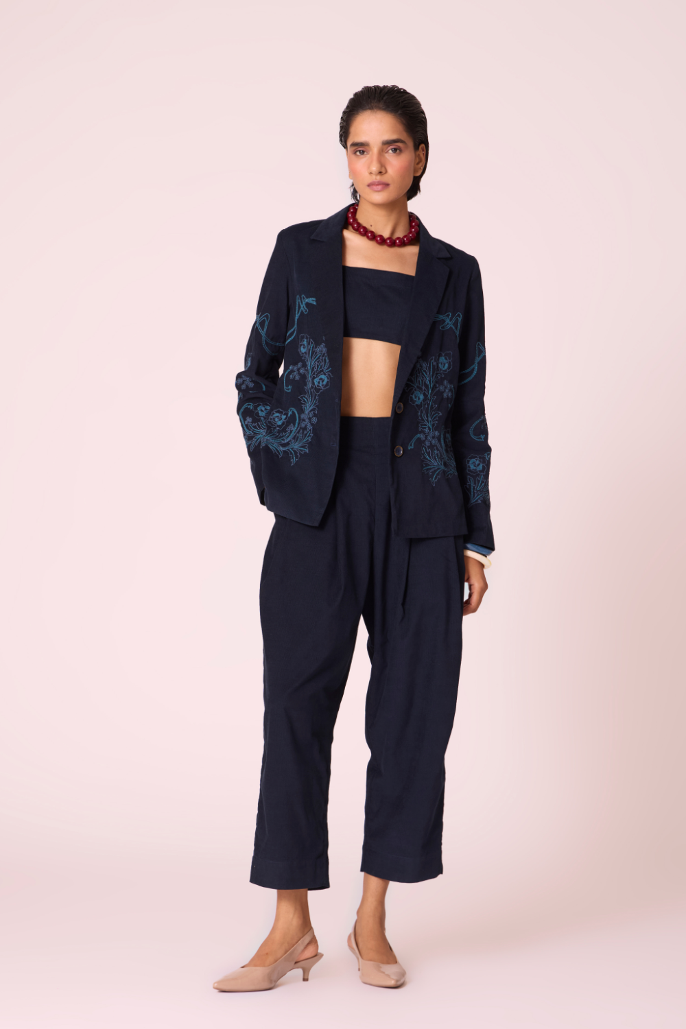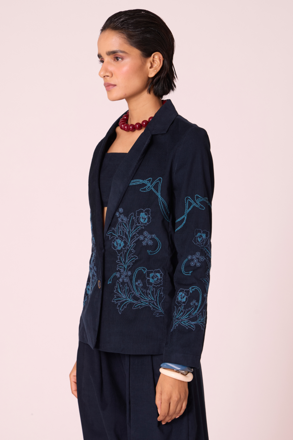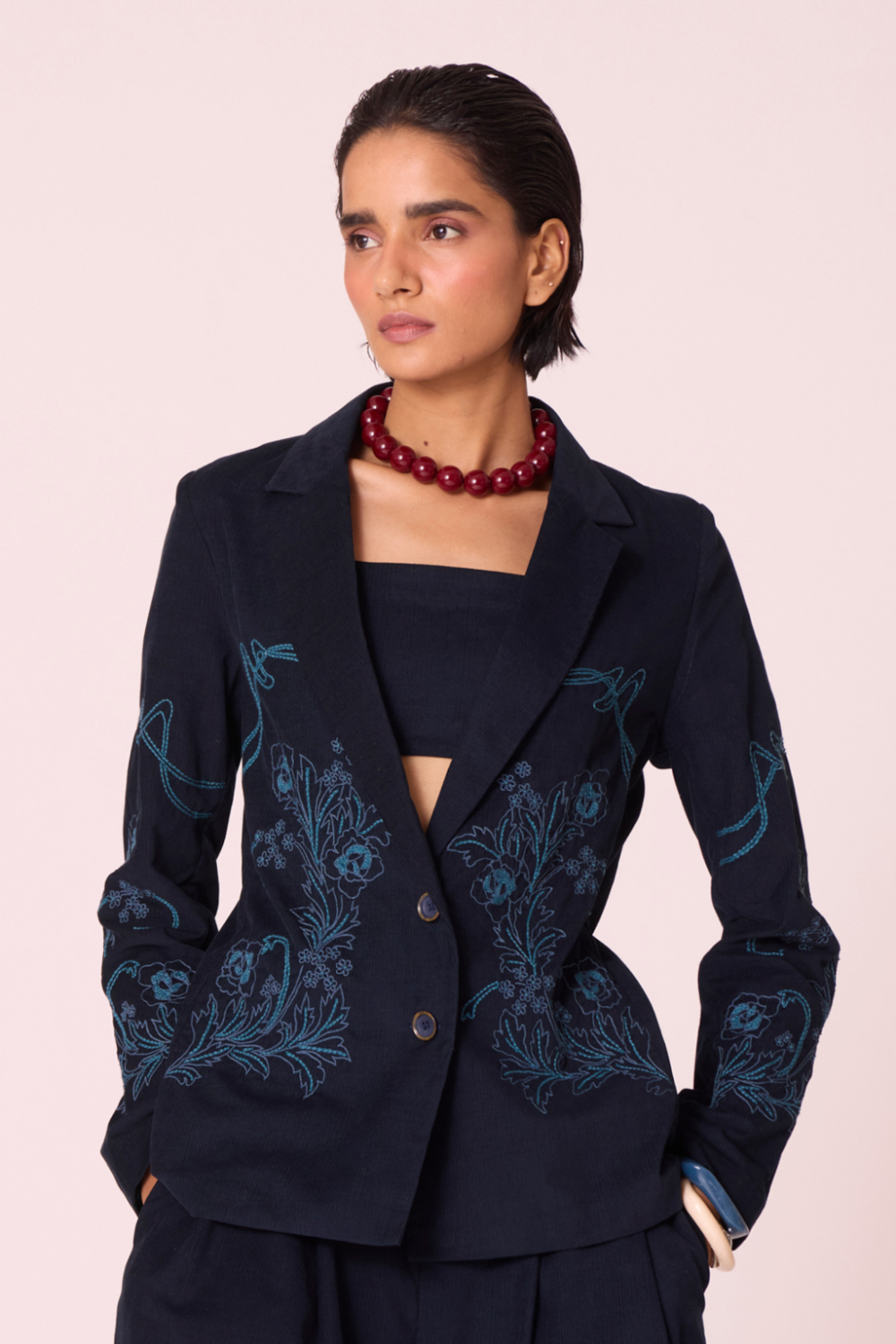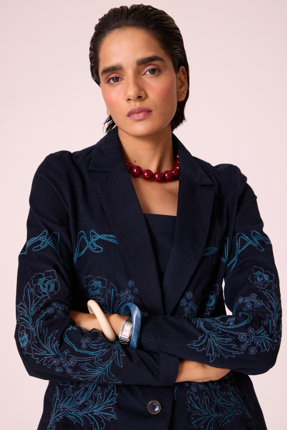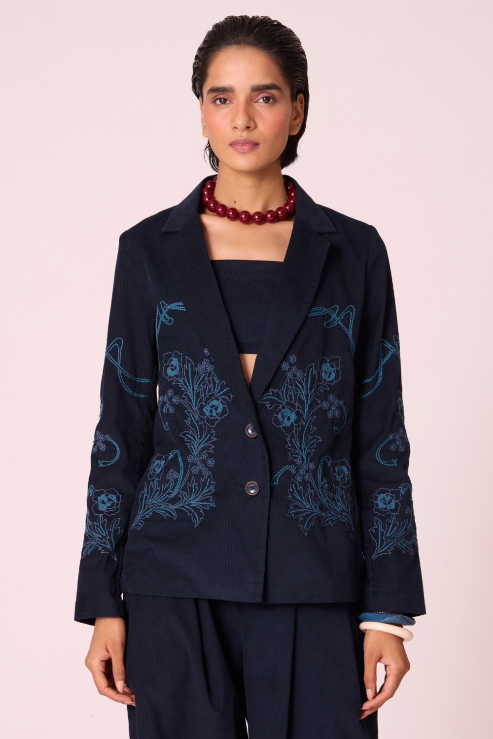 A tailored, slim-lined jacket shaped in supple needlecord. Embroidered accents at the waist and sleeve. Designed for events that require extra polish.