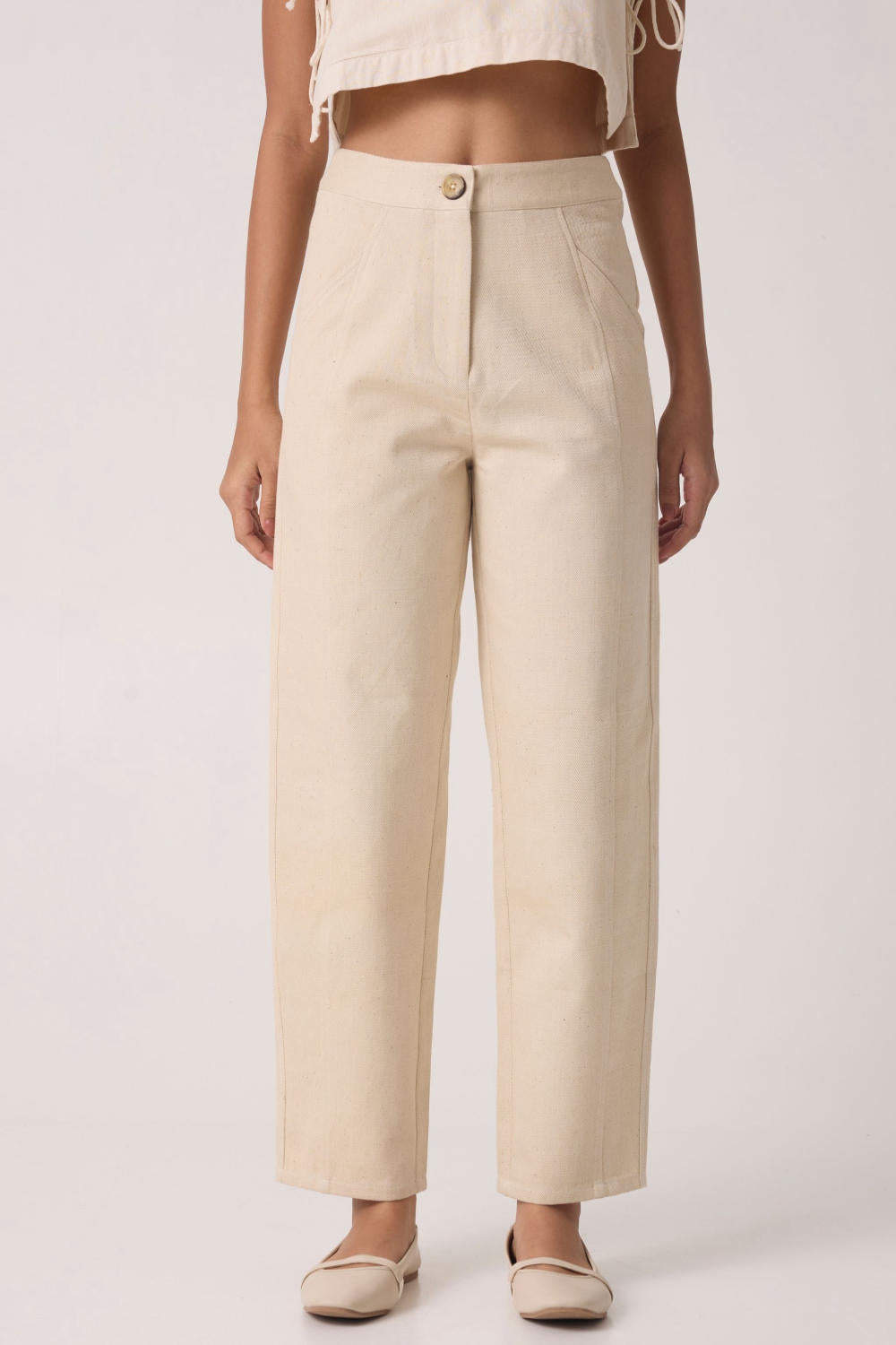 Mid-rise denim pants with front fly button fastening and cross pockets.
