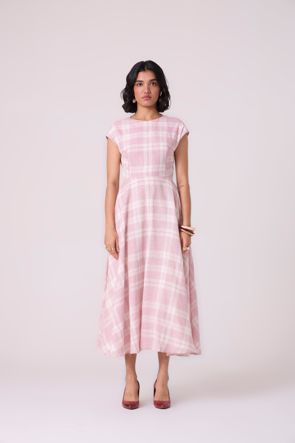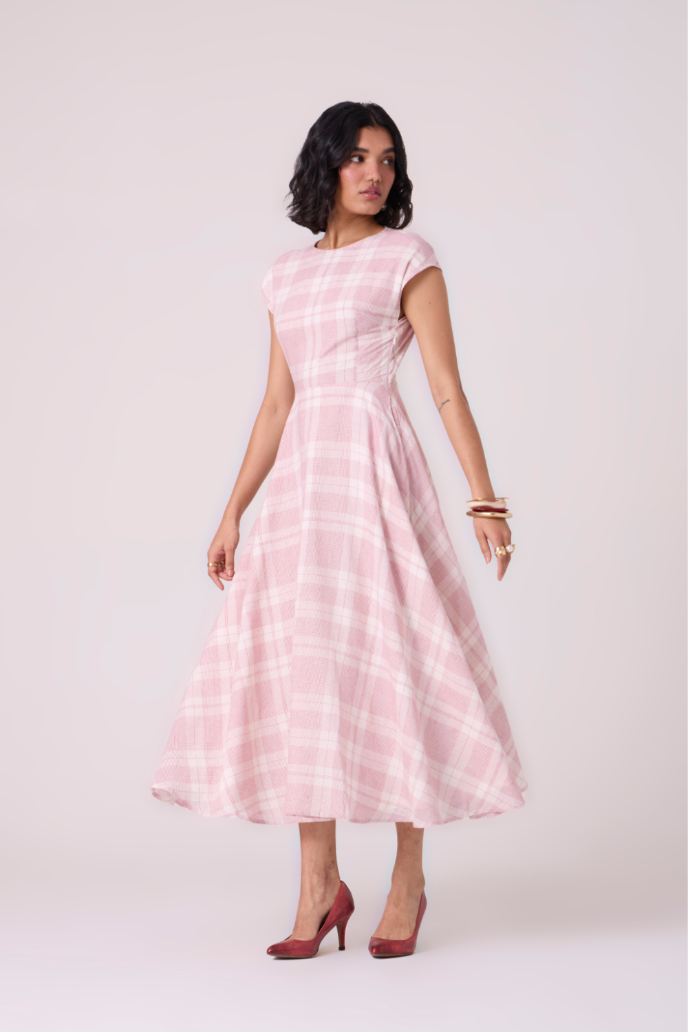 A drop-shoulder fit-and-flare silhouette that shapes the body with quiet clarity. The front remains modest with a modish neckline, while the open back adds a bit of oomph.