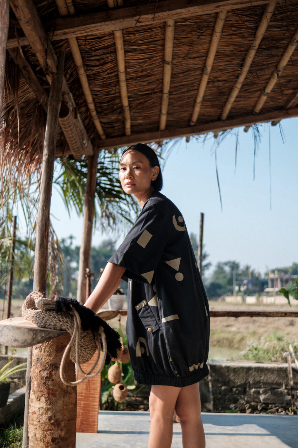 An oversized shift dress with elasticated hem detail , pockets and asymmetrical collar is the perfect defination of casual chic.