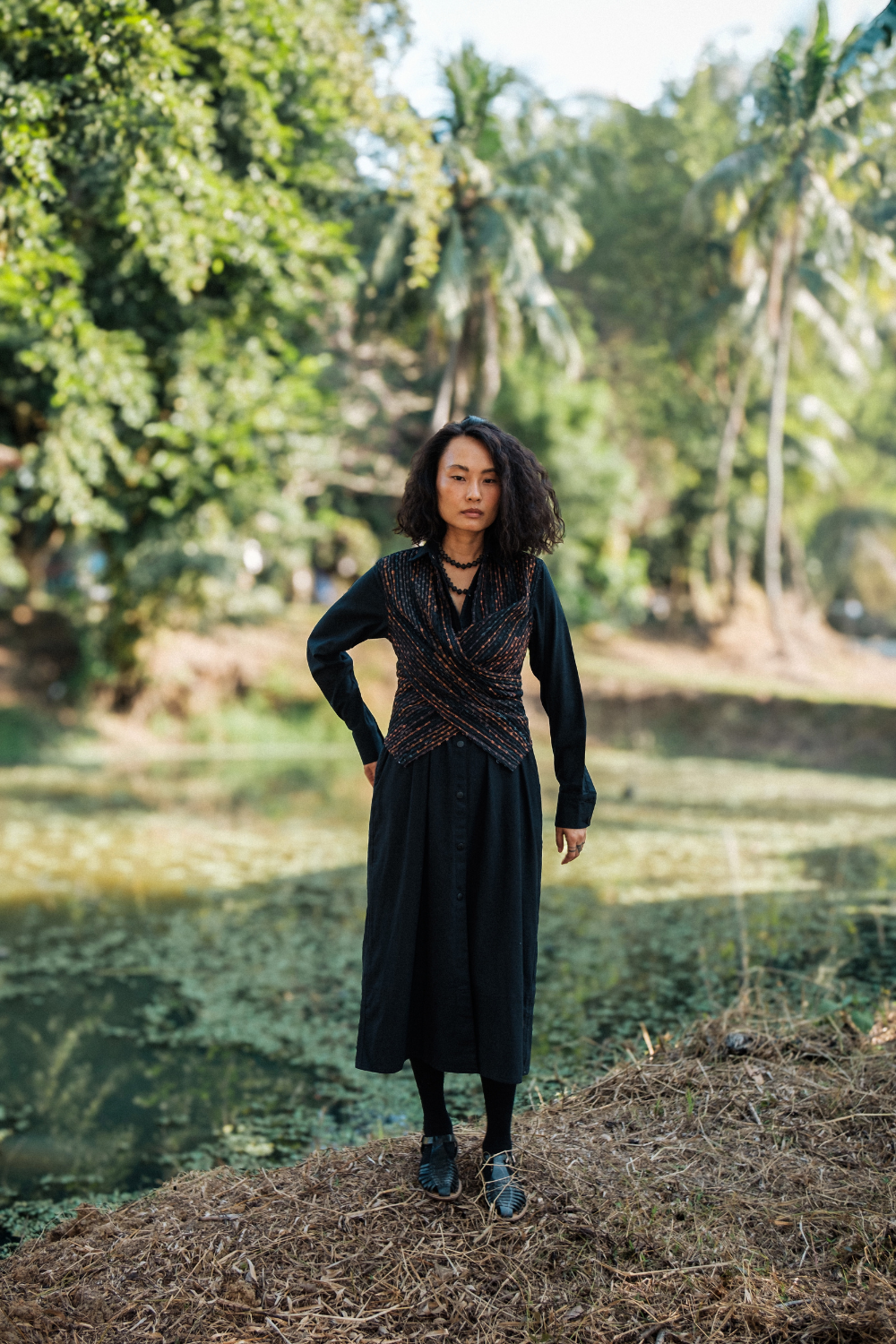A truly exquisite wrap shirt midi dress that seamlessly transforms from a sophisticated staple to a casually chic garment designed from upcycled fabric, made using post production waste. Our garments are dyed using pigments that do not cause any major harm to the environment in any manner. The garment is made from hand woven upcycled fabric and so the color might vary slightly for each batch. Peta approved vegan/Plant based clothing. For customization, please reach out to us.