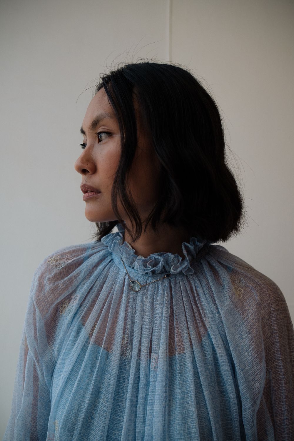 our partner artisans in a dainty floral print, hand embroidered by our in