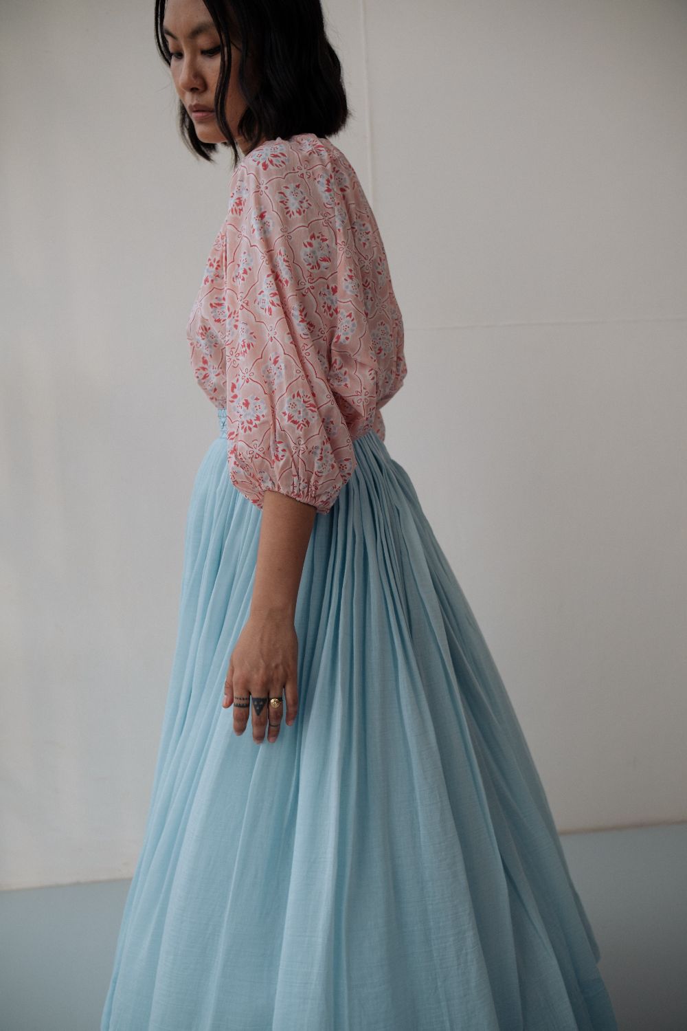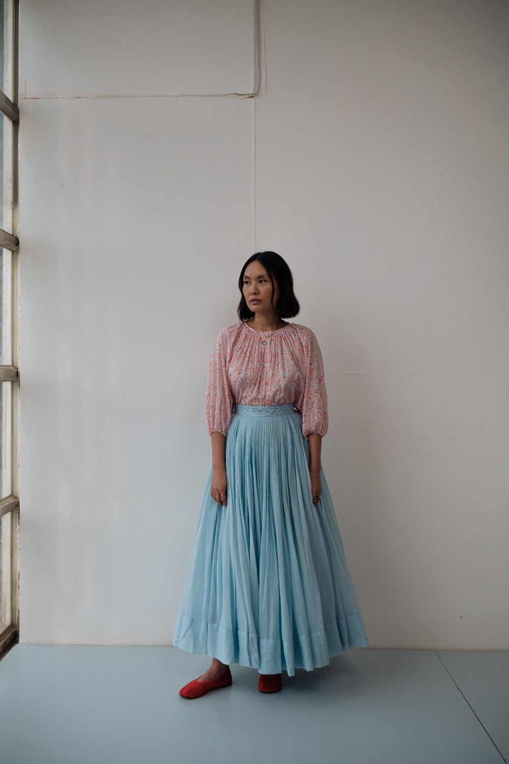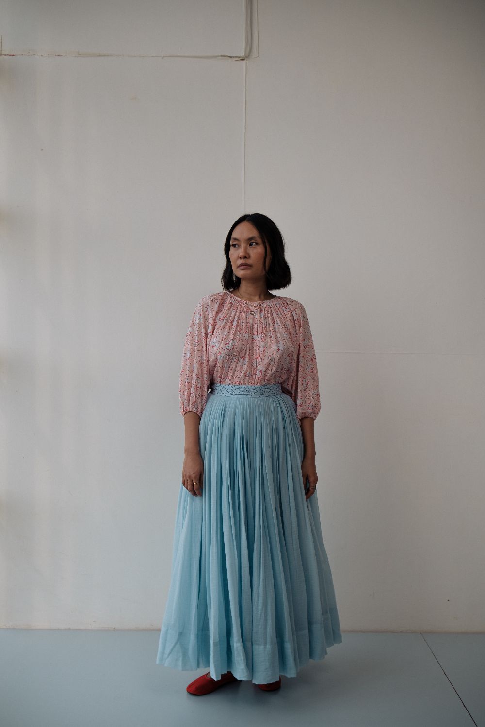 Blue gathered wrap around skirt in single ply chanderi with stitch detailing on the belt.Skirt is paired with a cotton handblock printed