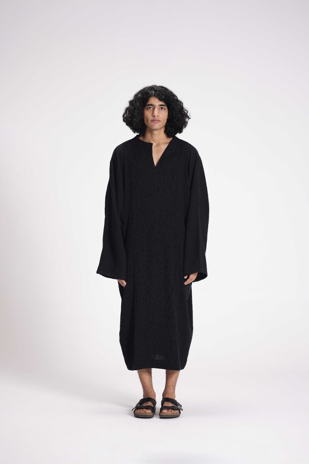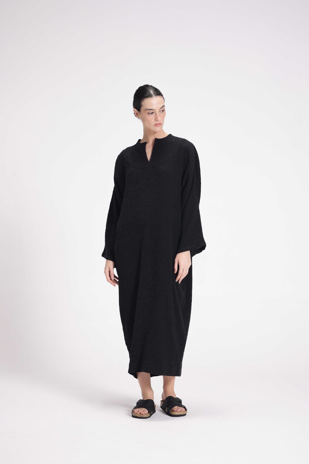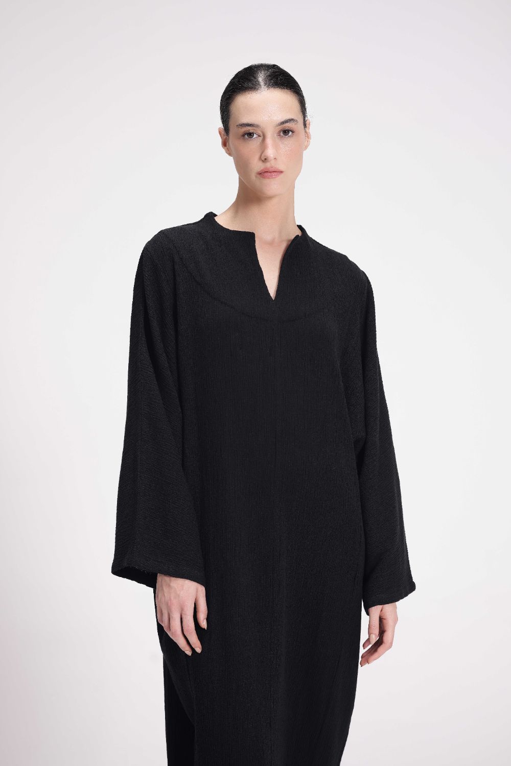 This relaxed-fit dress features a flattering V-neckline and a sophisticated calf-length design. Crafted from stretchable cotton crepe, it offers comfort with a subtle back slit for added ease of movement. Tunic Comes in Size: ONE (2XS,XS,S), TWO (M,L,XL), THREE (2XL,3XL,4XL)