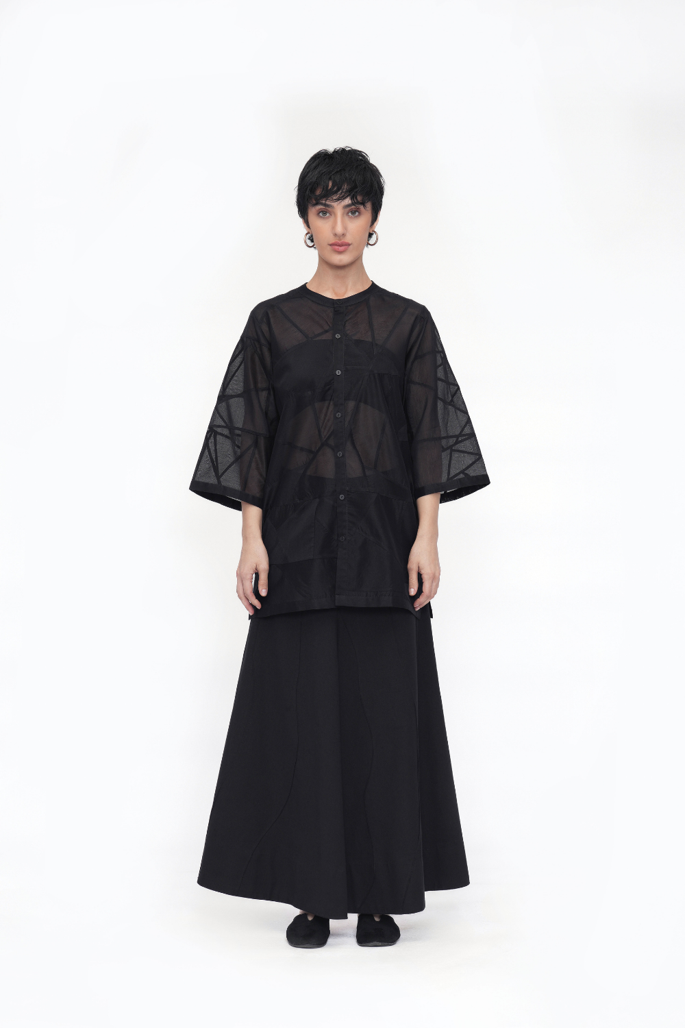 Crafted with care, this piece features patchwork fabric made from our leftover fabric scraps, thoughtfully pieced together using durable French seams. The relaxed fit is complemented by a band collar, binding finish, visible placket, three-quarter sleeves, and side slits, blending sustainability with subtle style.