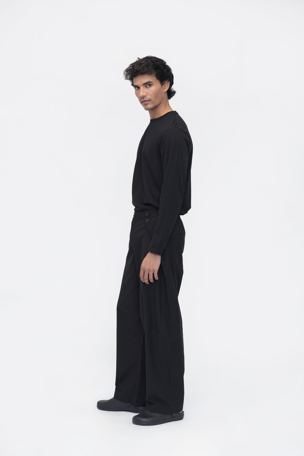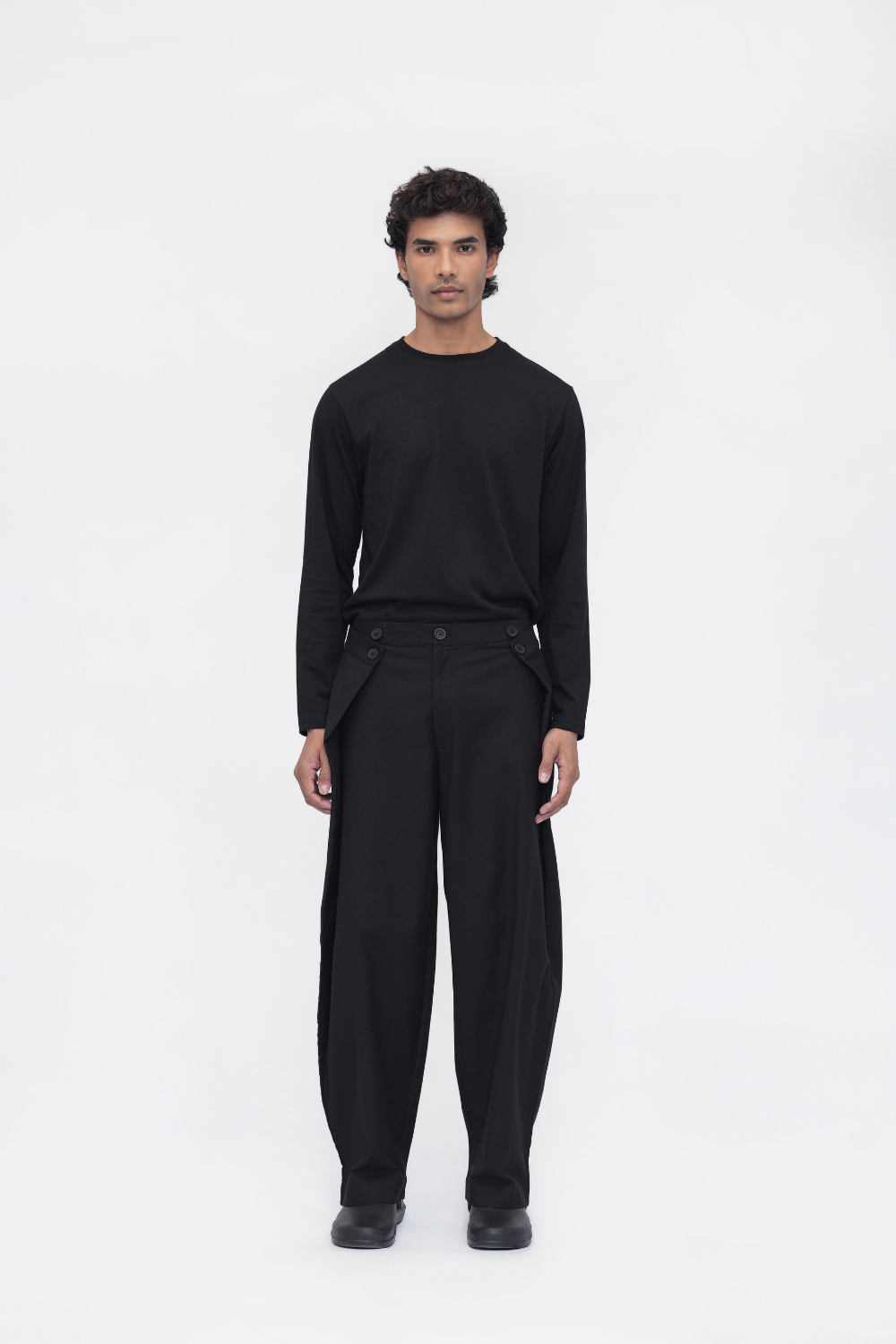 Barrel-fit pants with an overlapping design and all-around waistband for a sleek fit. Features fly zipper and single button closure, back darts for shaping, and back welt pockets. Crafted to combine structure with ease.