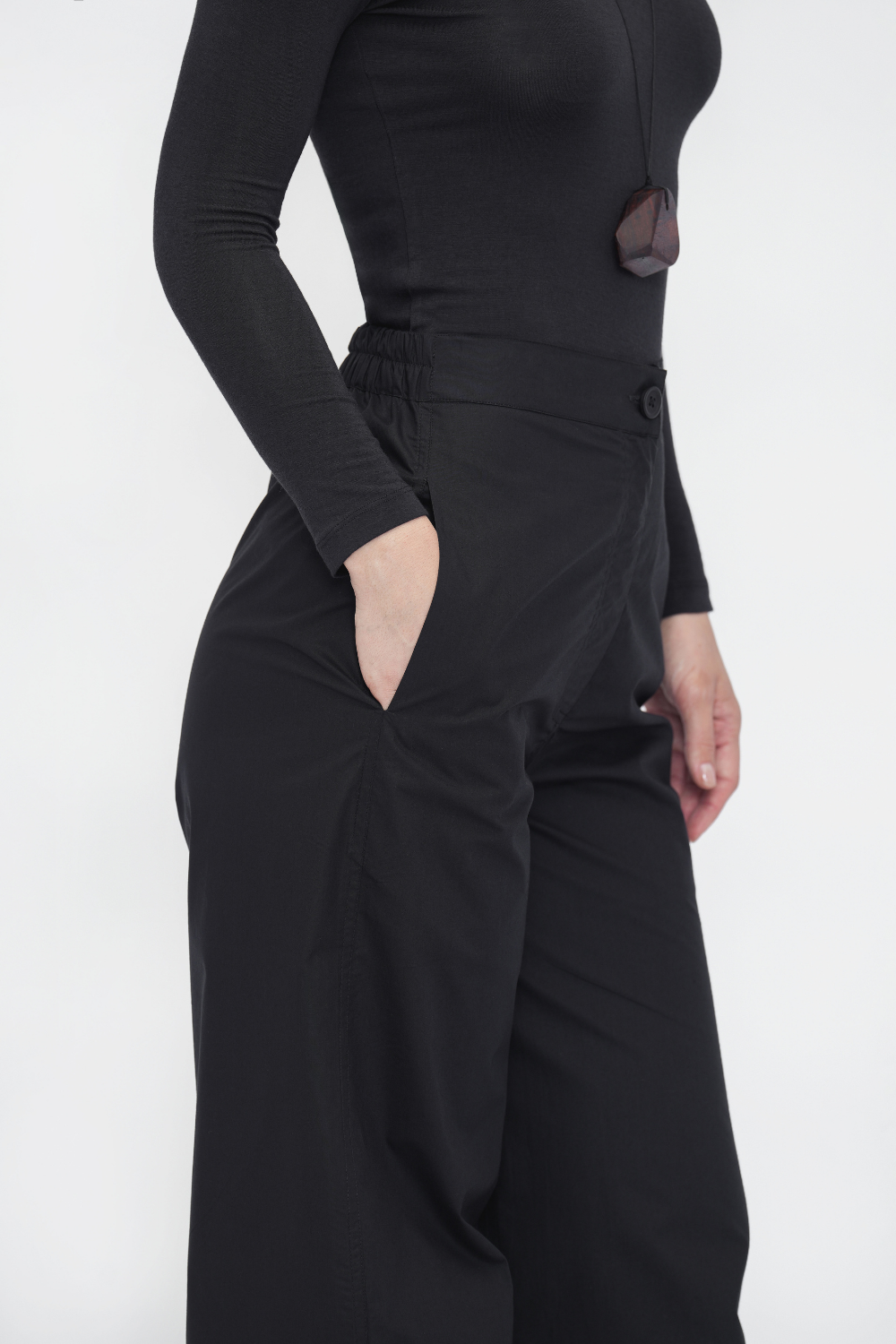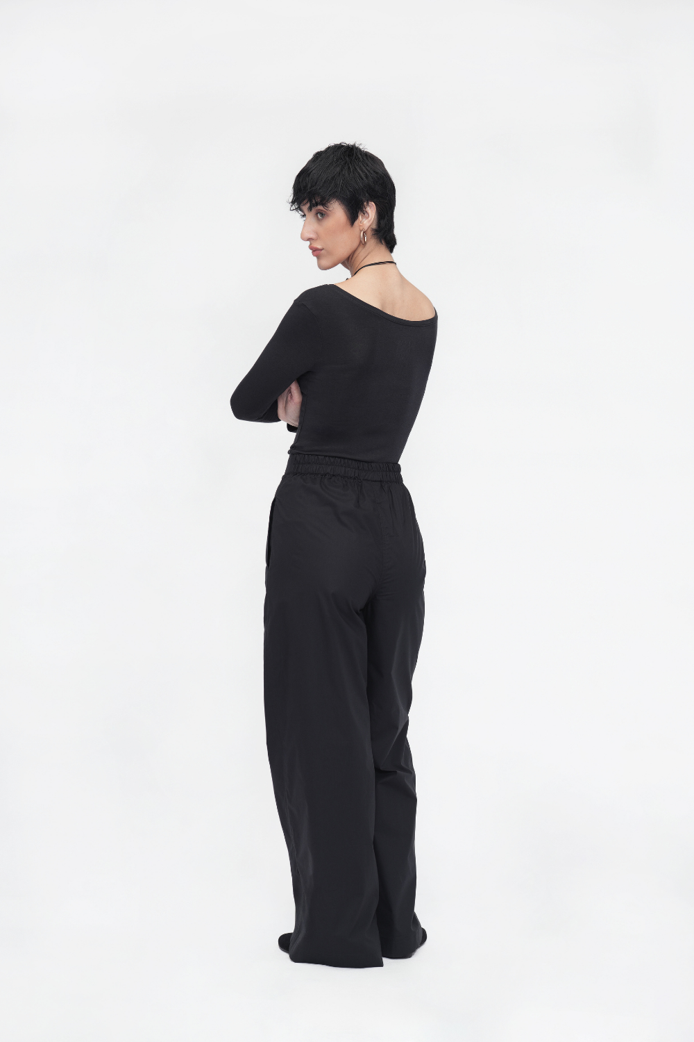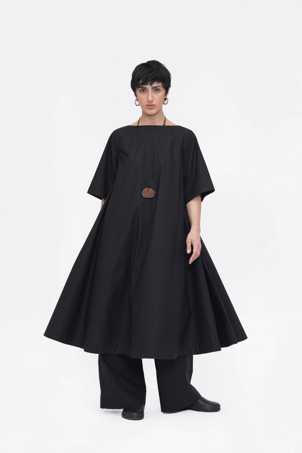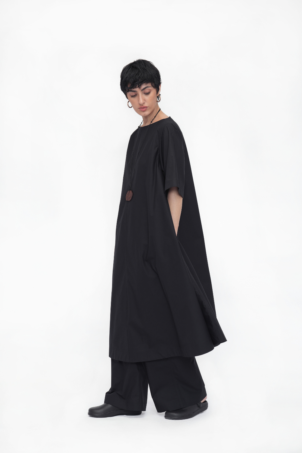 An oversized calf-length tunic in airy cotton poplin, shaped in a breezy tent silhouette with a boat neck and center seams. Paired with straight-fit bottoms featuring a part-elastic waistband, side seam pockets, and a clean front. A breathable, easygoing set for effortless summer dressing.