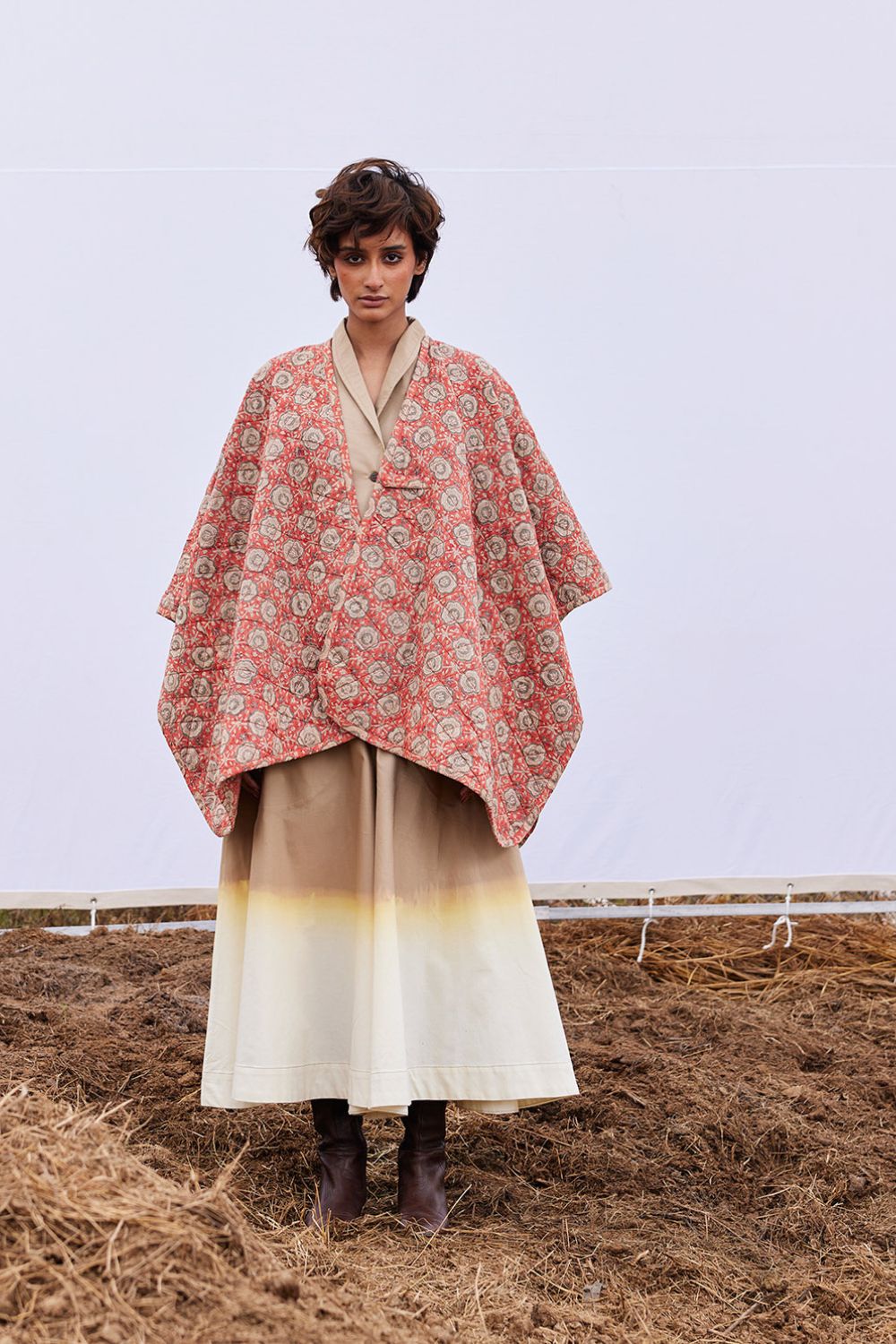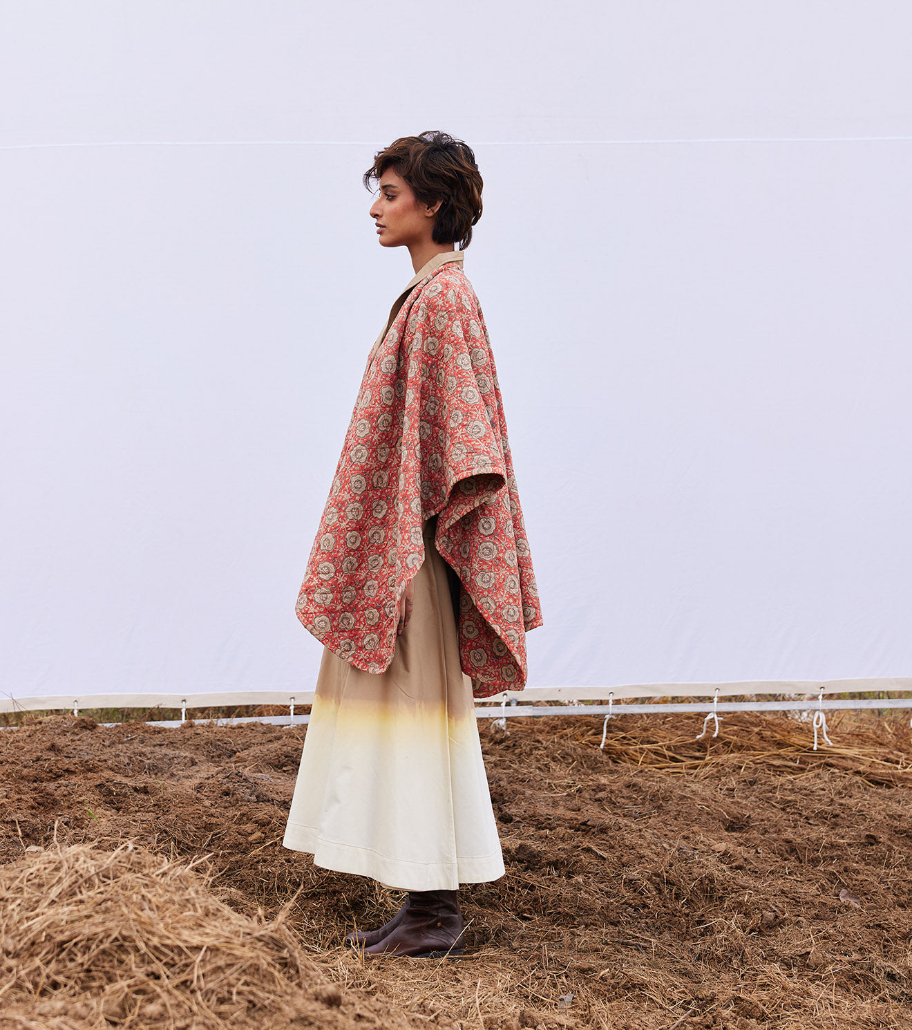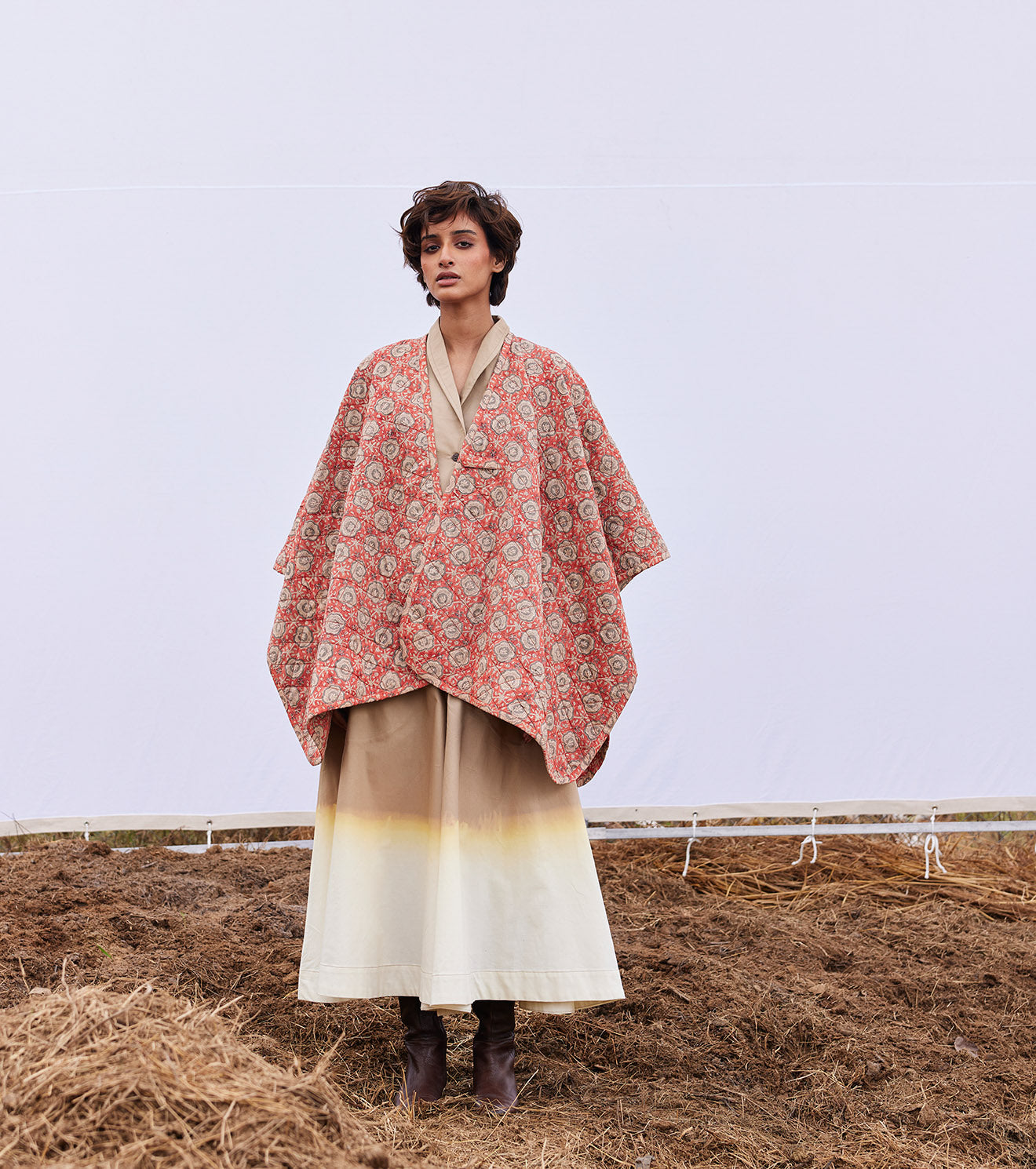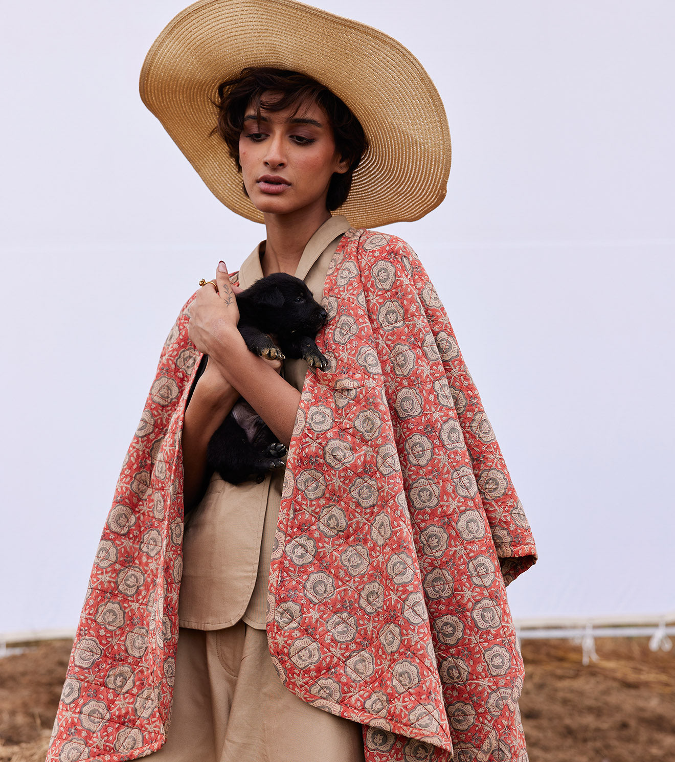A red orange floral print reversible mul quilted cape with a front button opening.