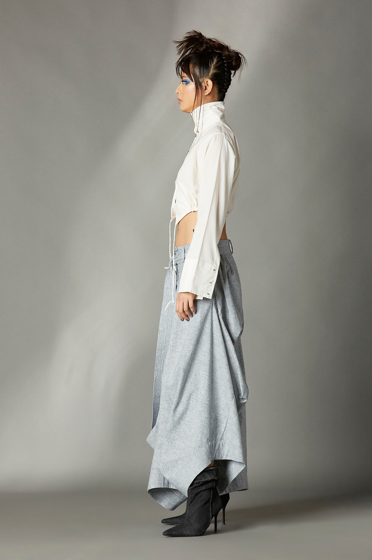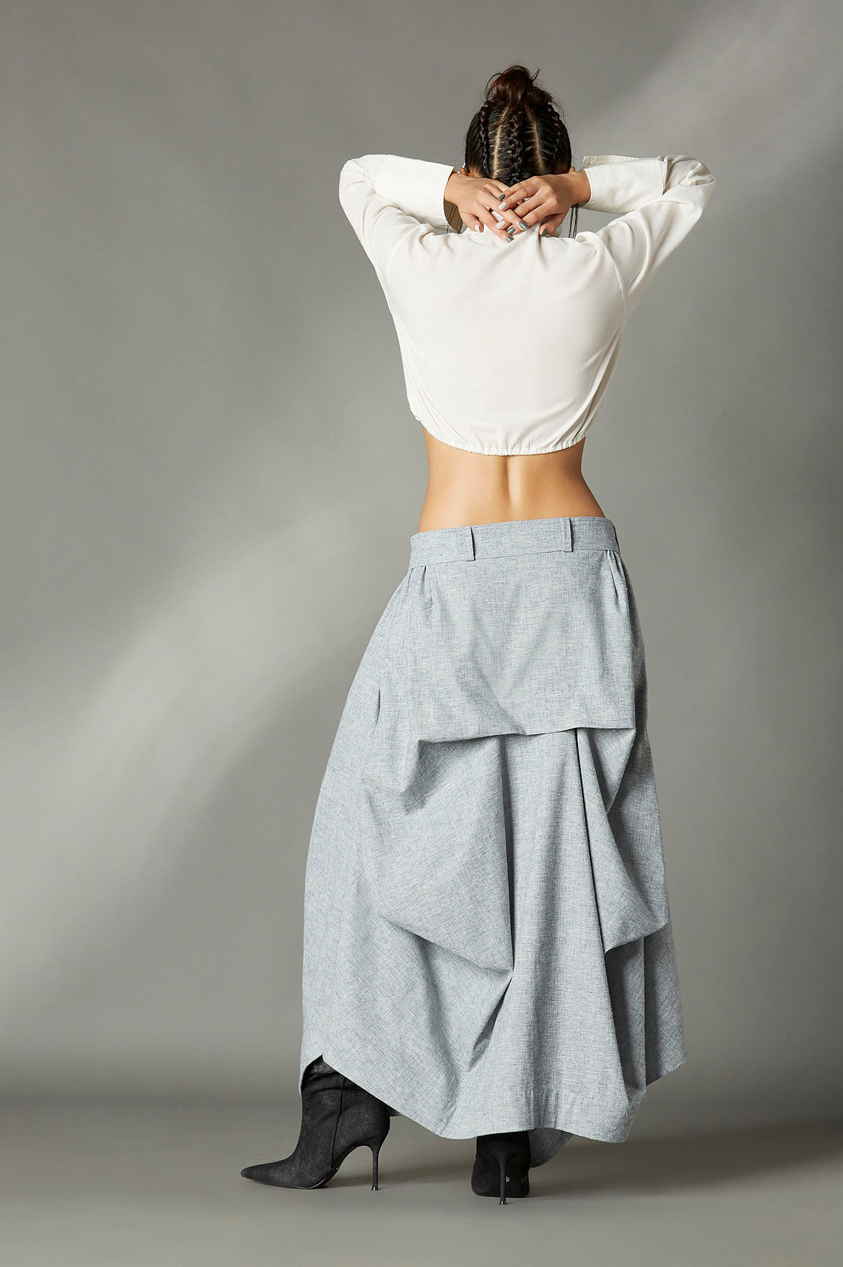 DECONSTRUCTED SKIRT WITH SIDE ELASTICATED WAISTBAND, FRONT BUTTON FLY, BACK HALF UNEVEN FOLD AND A BELT