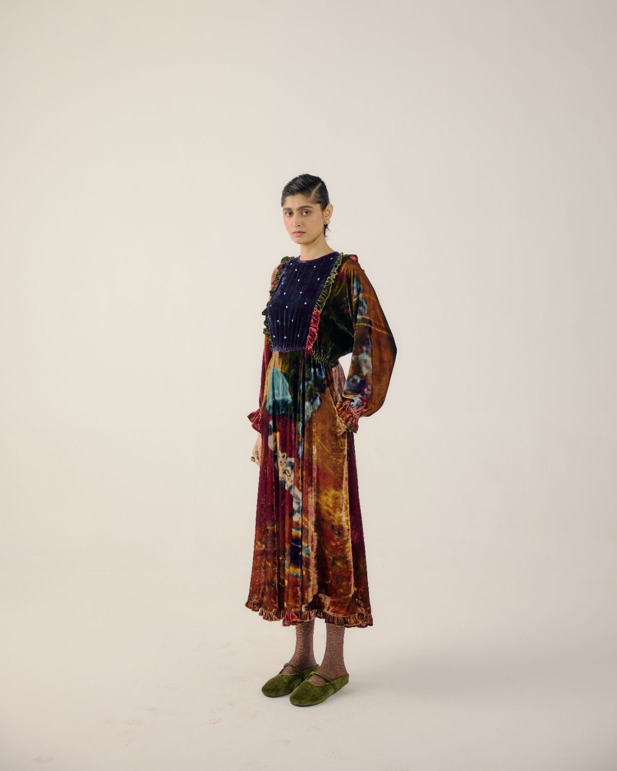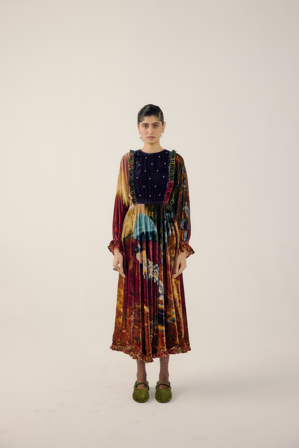 The Alice dress features a ruffled, bead-embroidered yoke, batwing sleeves, an ankle-length flared silhouette, and soft velvet construction with ruffles along the hem.