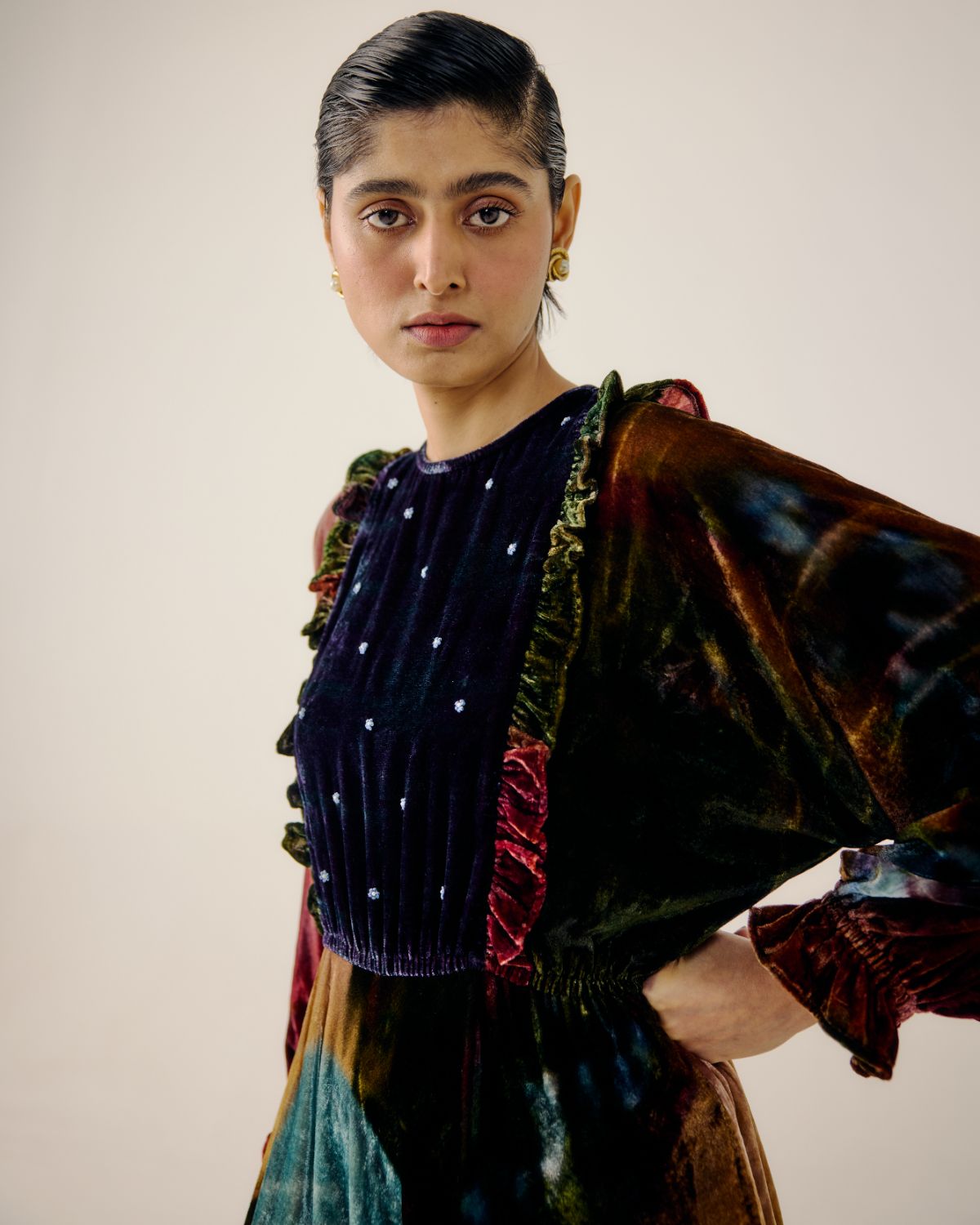Details: Bead-embroidered ruffled yoke, batwing sleeves, ruffled hem, soft velvet fabric Fit: Flared fit