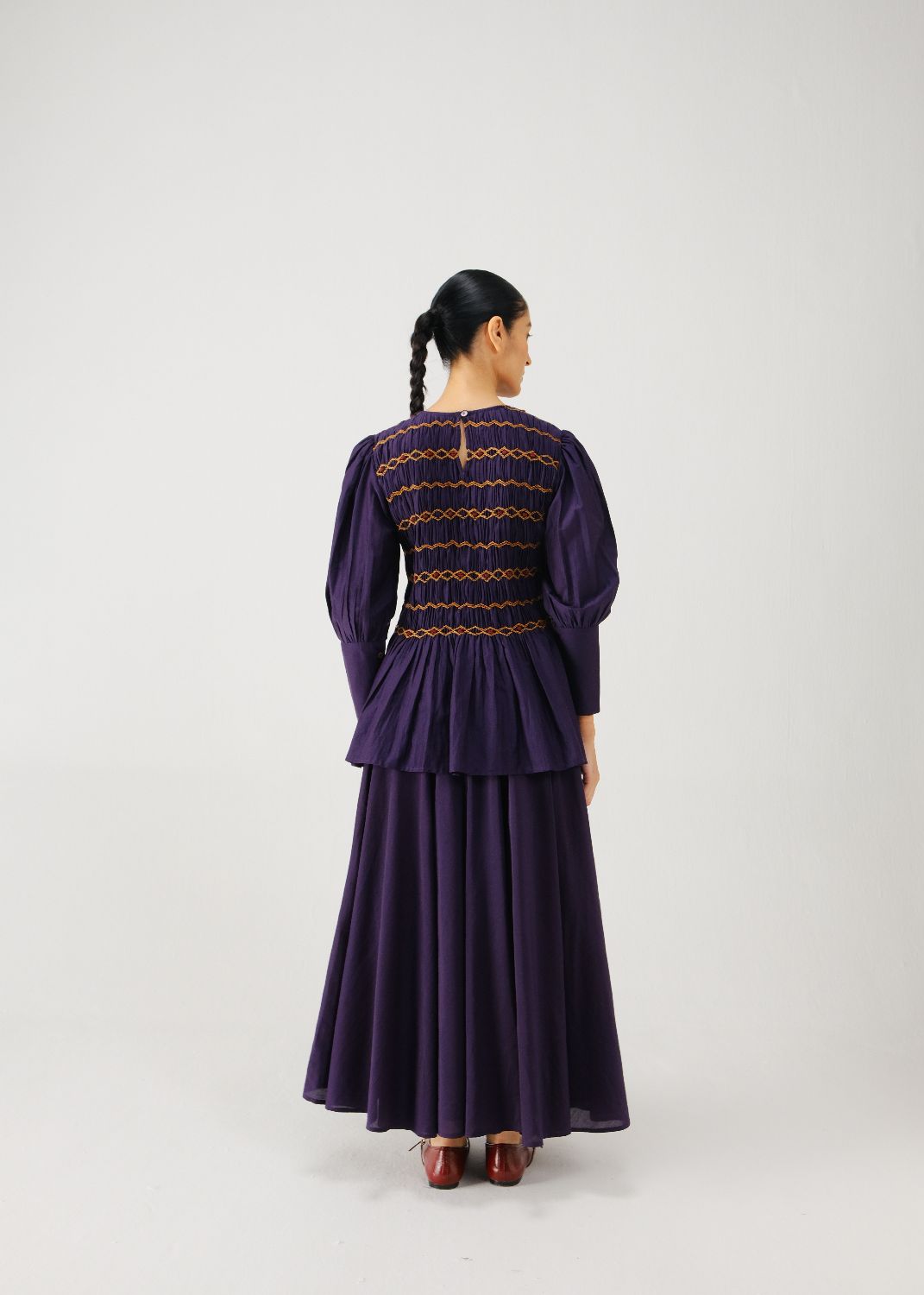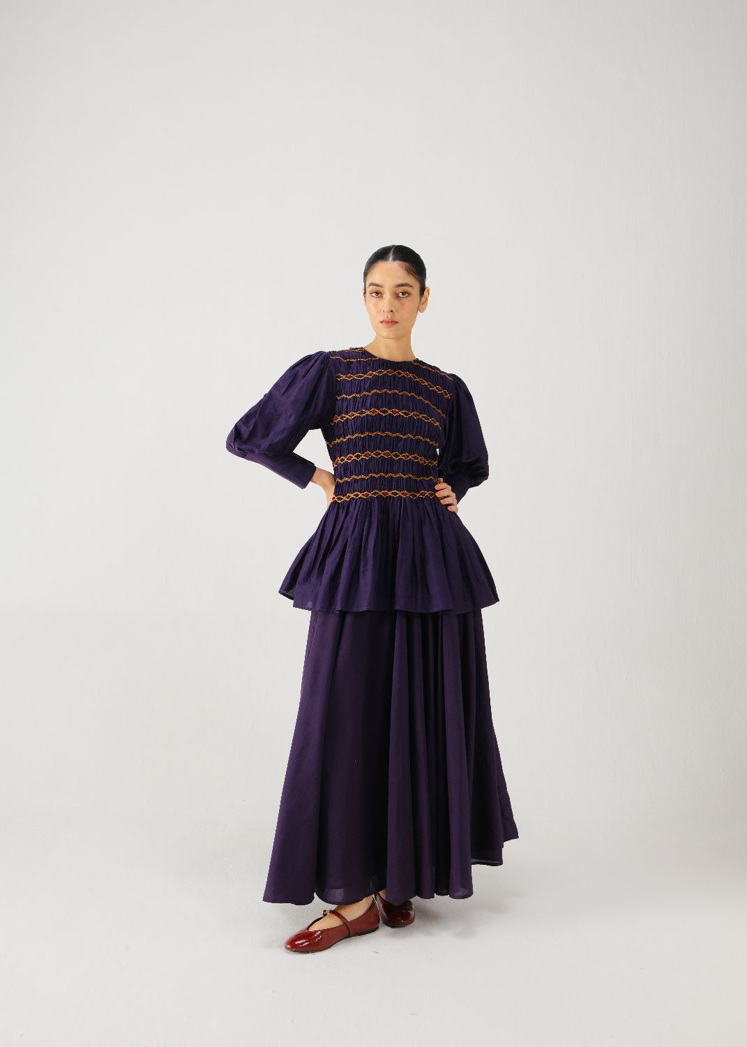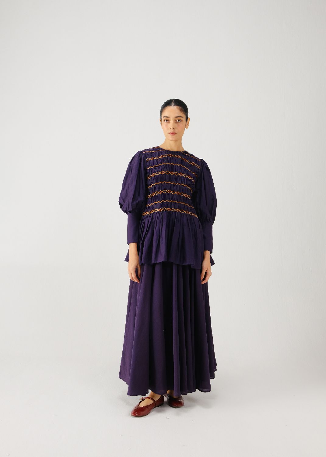 The Gaia Set features a silk top and a skirt. The top has a smocked torso with a peplum silhouette and bishop sleeves. The skirt has an elasticated waistband and a flowy silhouette.