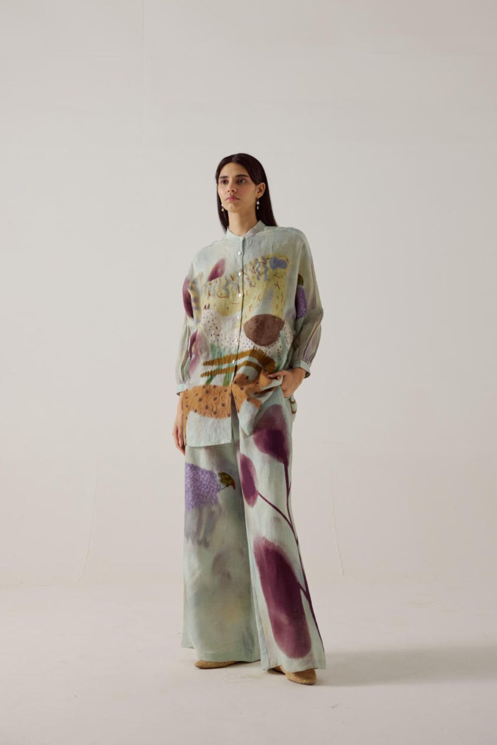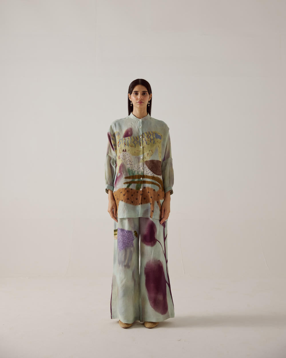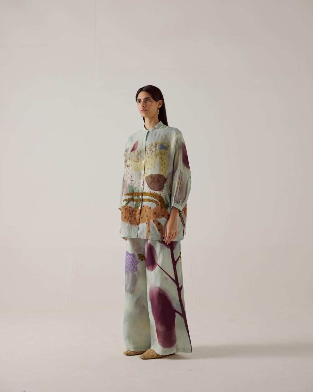 The Mia set is a two-piece set that includes the Mia shirt along with pants. Both are made from linne in our new Mirage print. The Mia shirt is a button-down shirt with a band collar. The lounge pants feature a button and zip fastening along with pleats in the front and an elasticated waistband at the back.