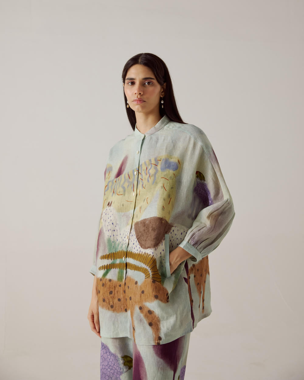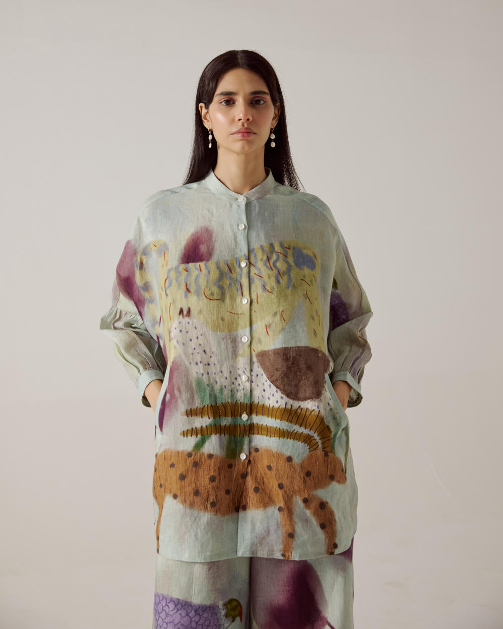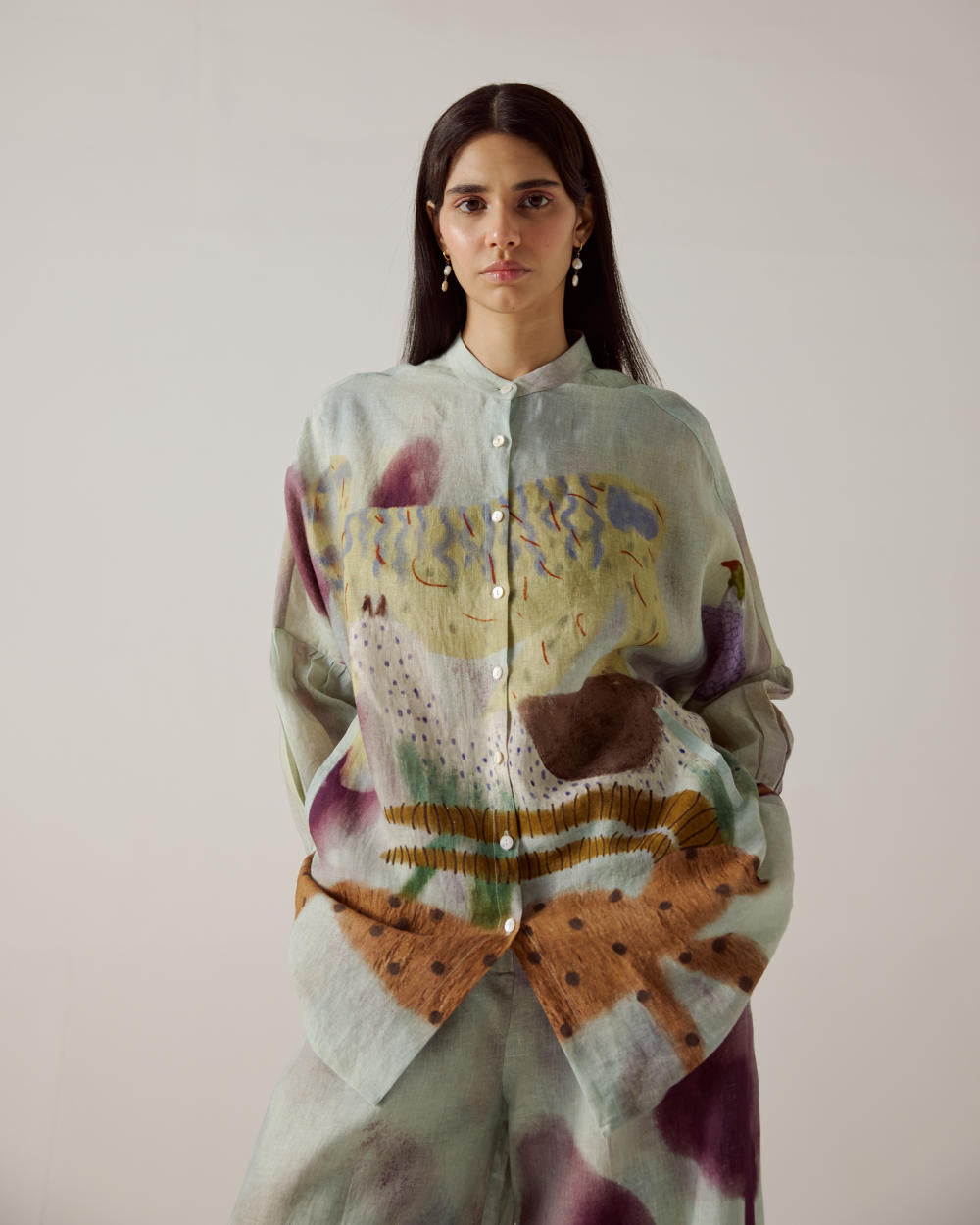 The Mia set is a two-piece set that includes the Mia shirt along with pants. Both are made from linne in our new Mirage print. The Mia shirt is a button-down shirt with a band collar. The lounge pants feature a button and zip fastening along with pleats in the front and an elasticated waistband at the back.